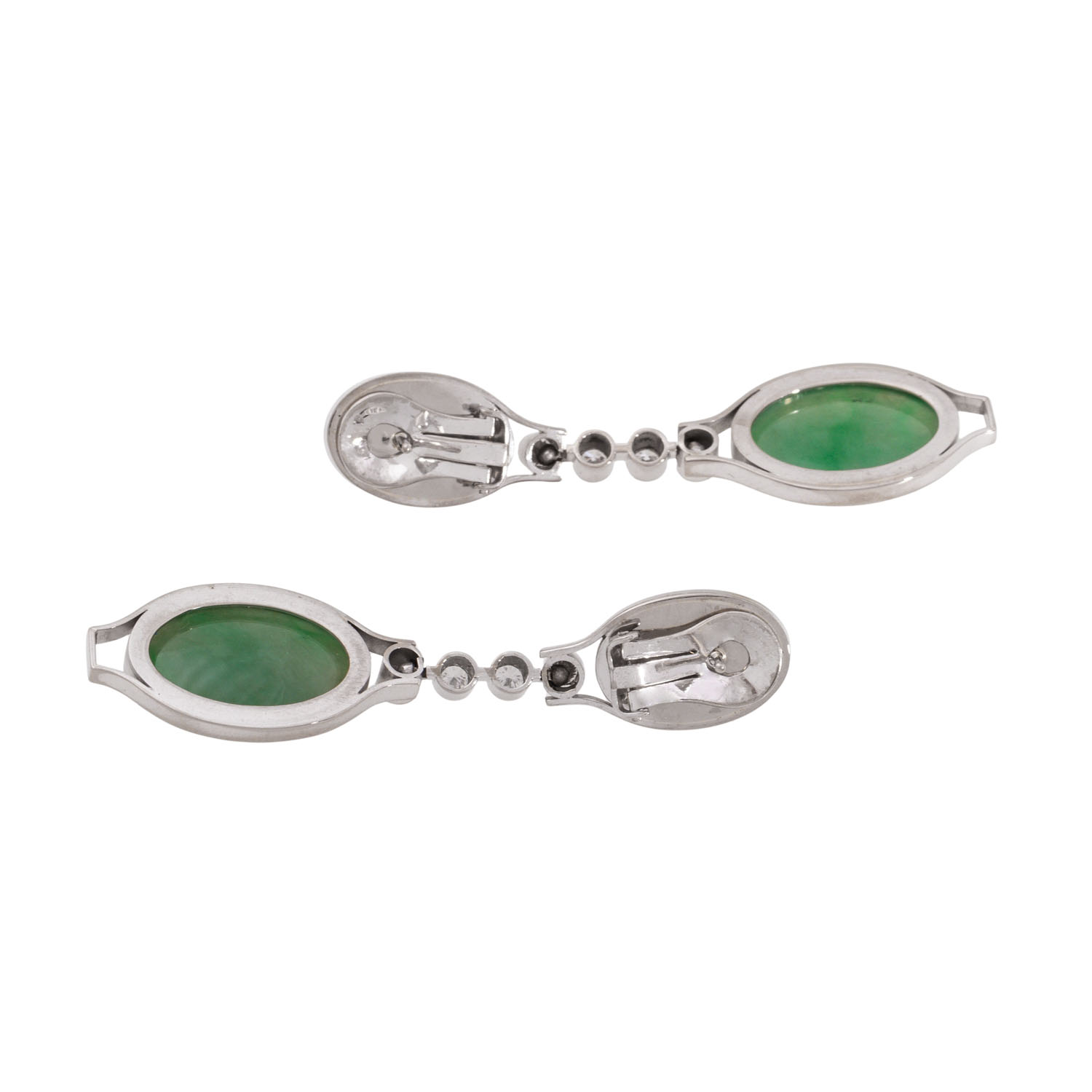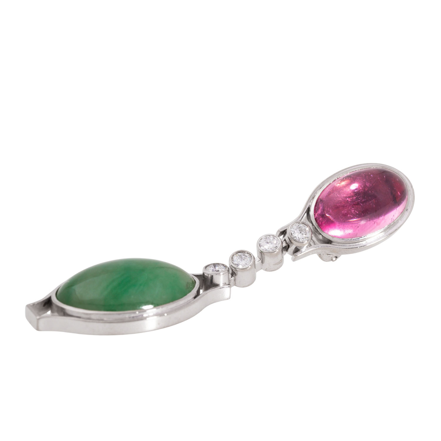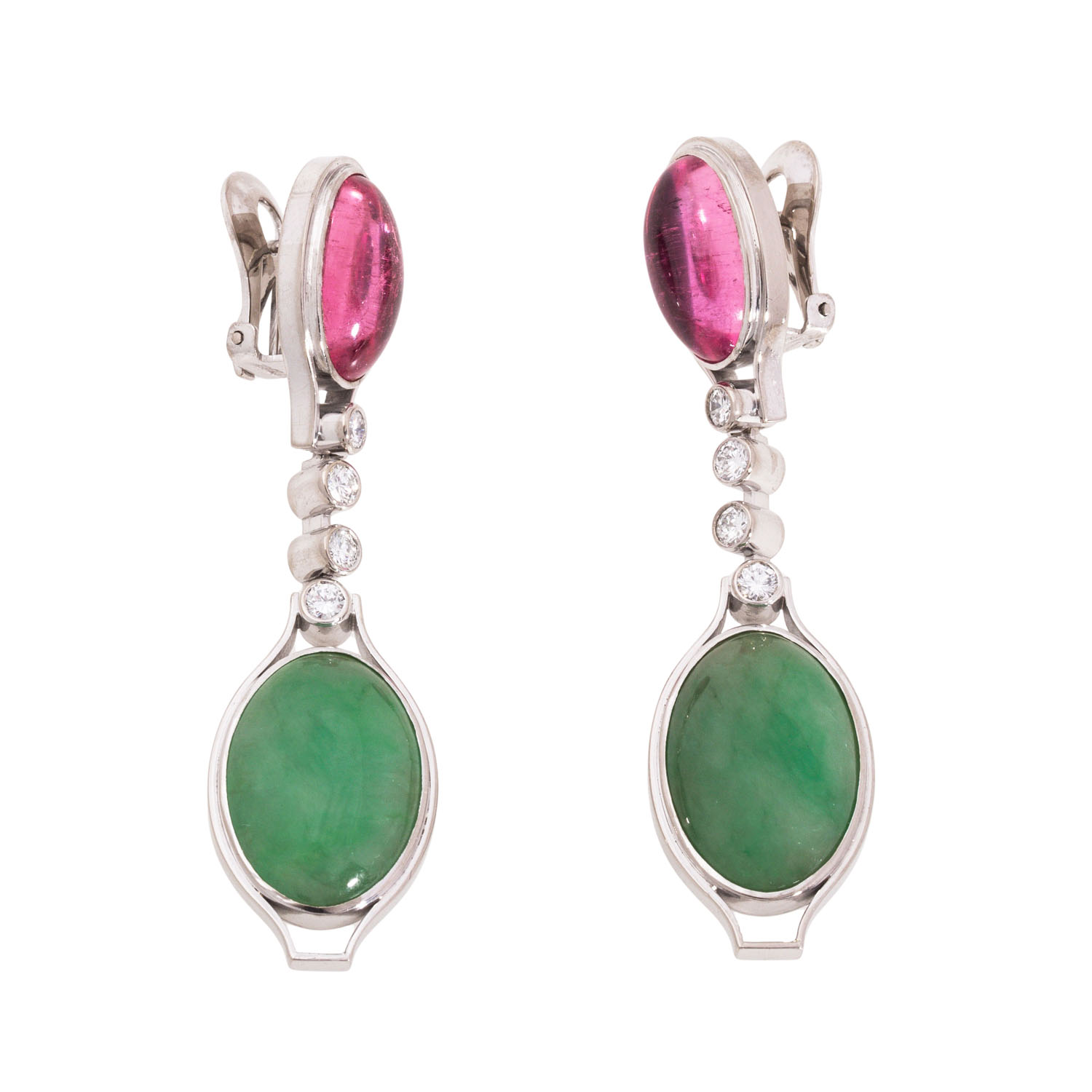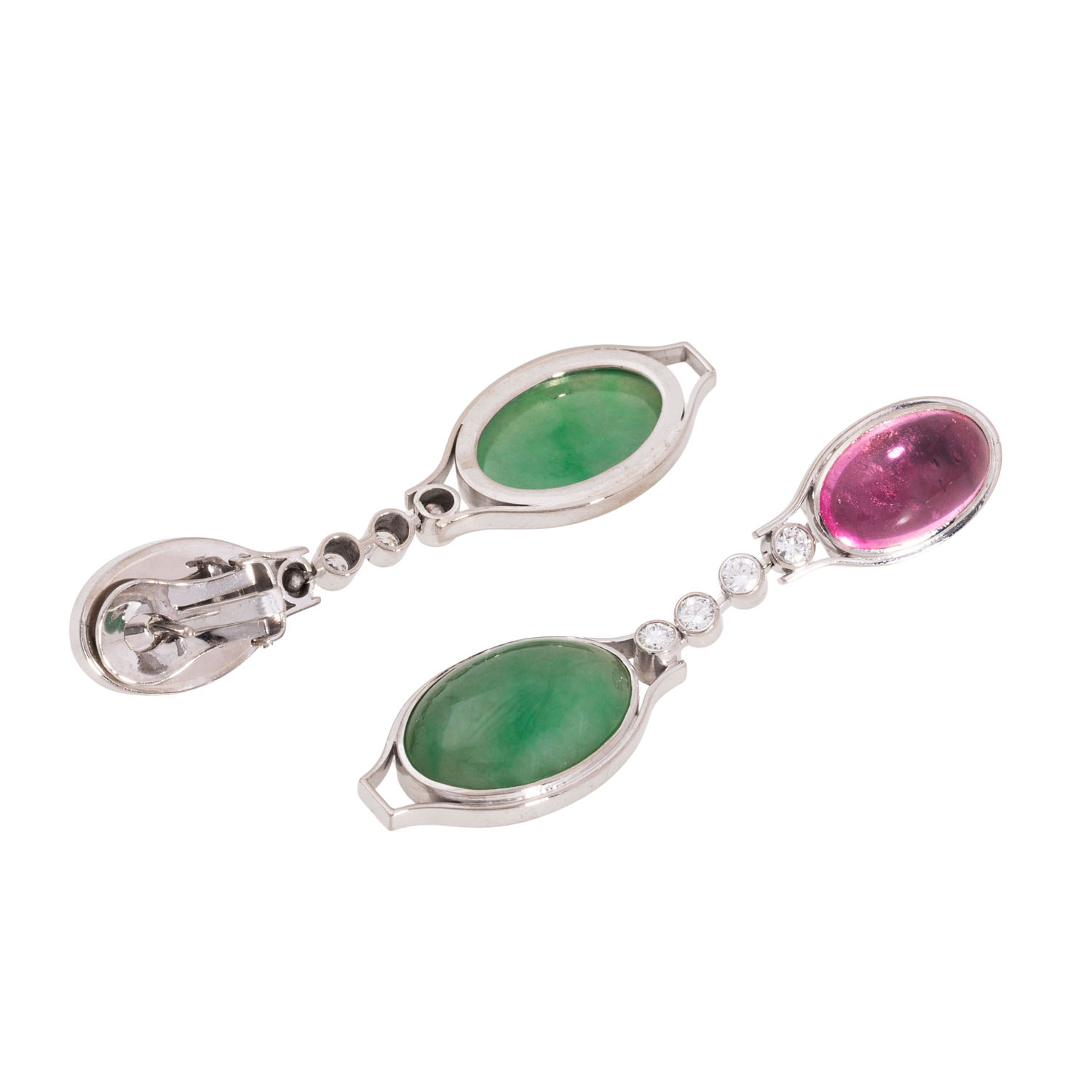 WÖHLER unique earrings with oval cabochon-cut pink tourmalines and jadeites, fine quality connected by brilliant-cut diamonds totalling ca. 0.4 ct, good colour and clarity, 18K white gold, 20.6 g, L: 5.7 cm, pins with clip-back, late 20th century, good condition, marked WÖHLER (Mannheim), handcrafted.