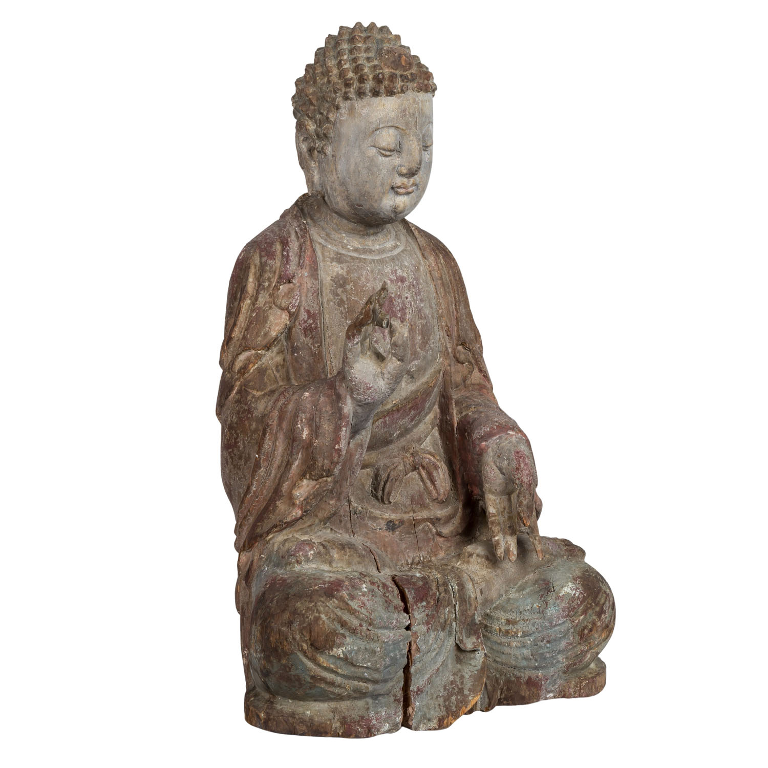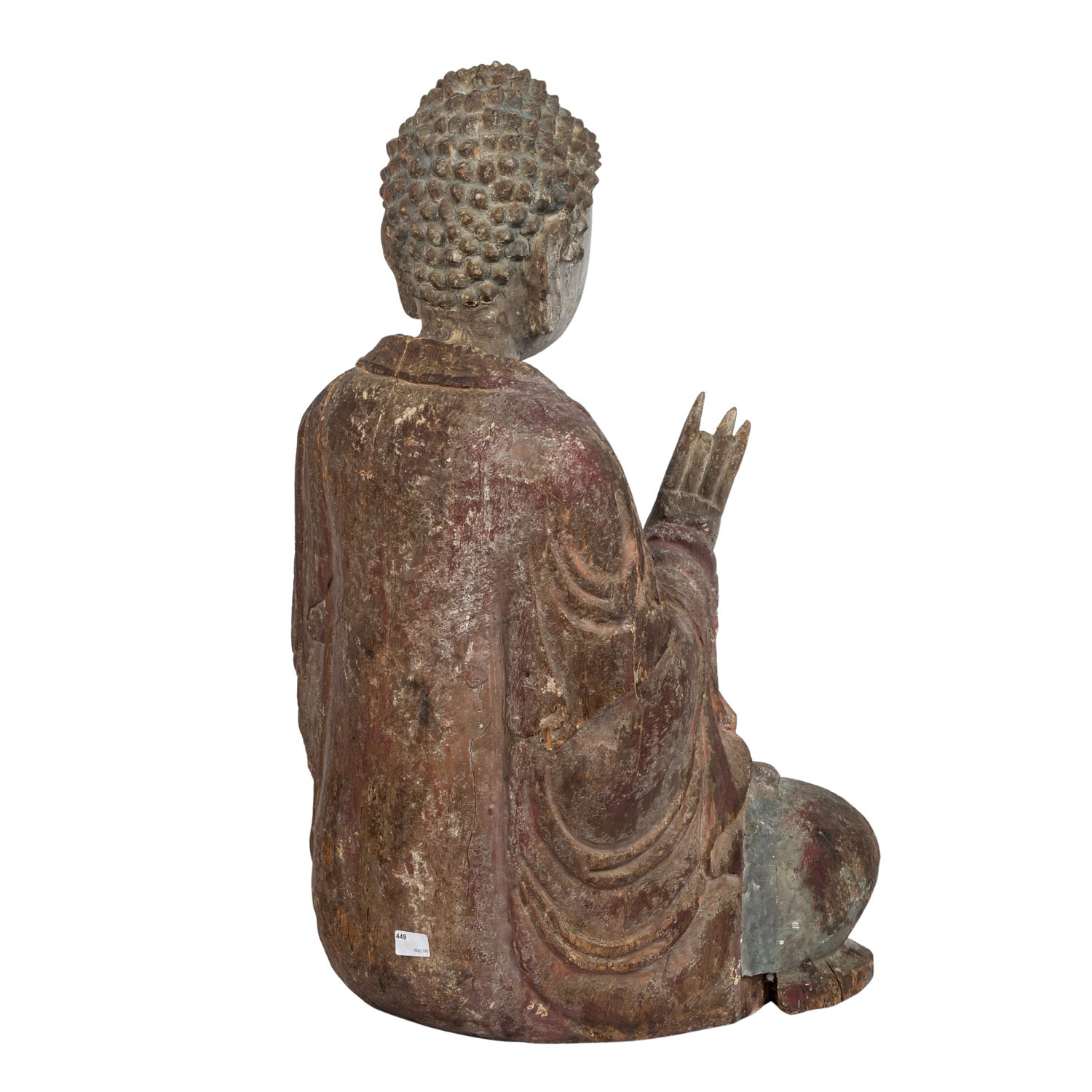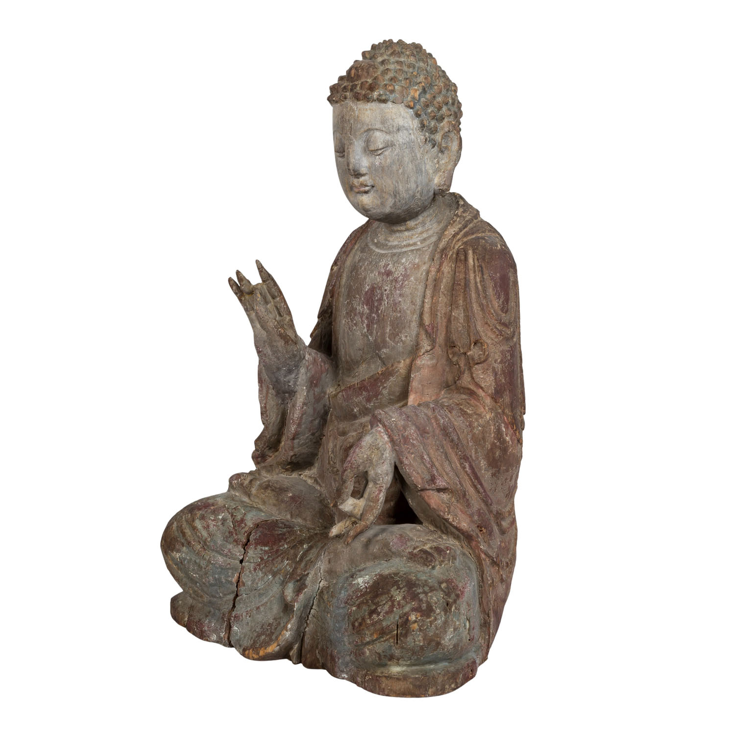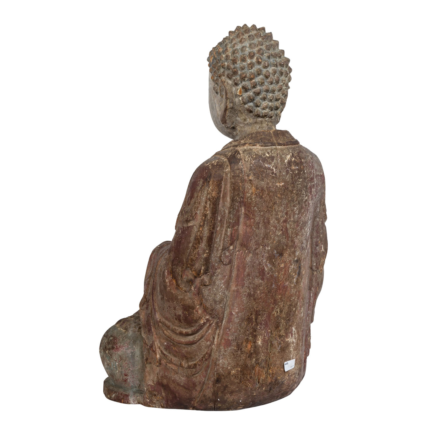 Wooden Buddha. CHINA, 19th century. Depicted in a meditative pose, with remnants of a colored finish. HxWxD: approx. 67x40x31 cm. Damage due to age, such as stress cracks, damage. NOT SUITABLE FOR SHIPPING
