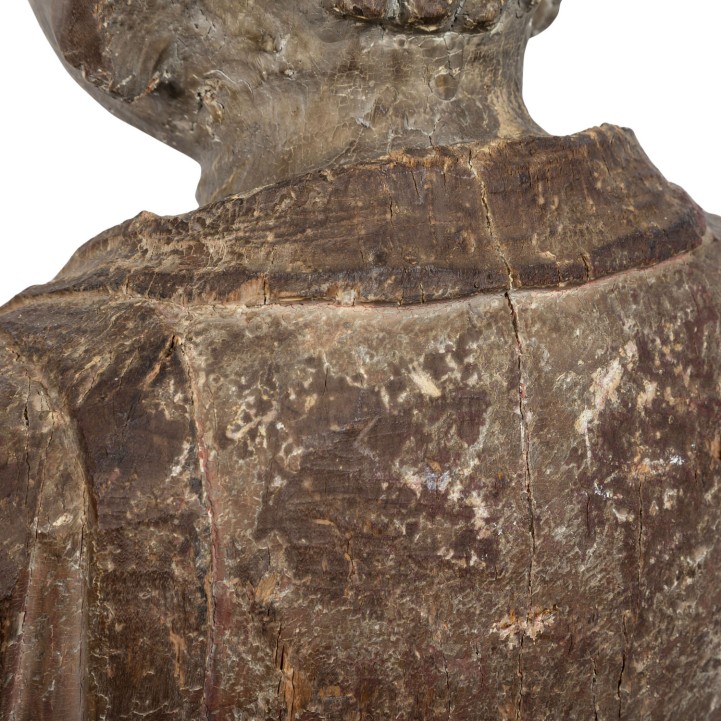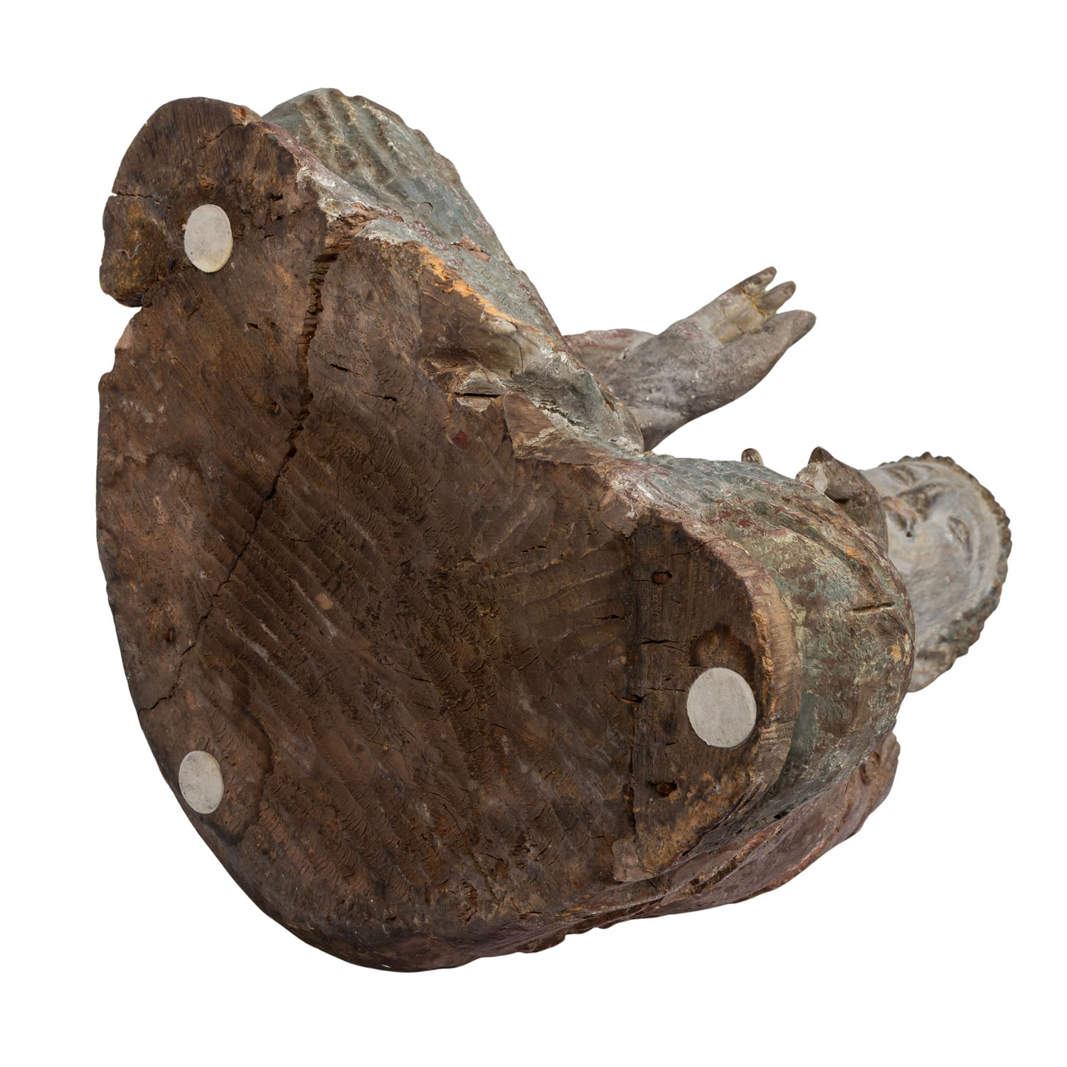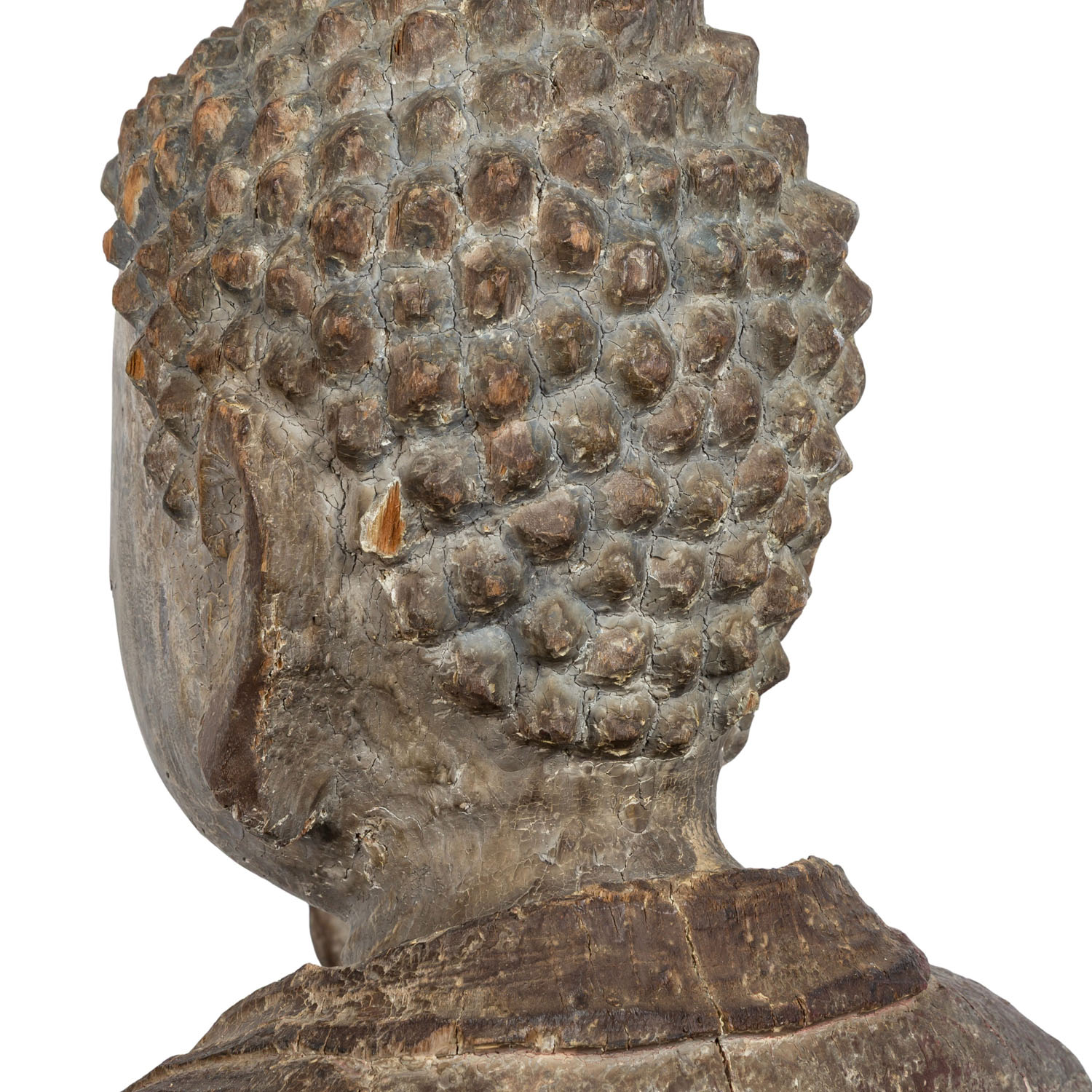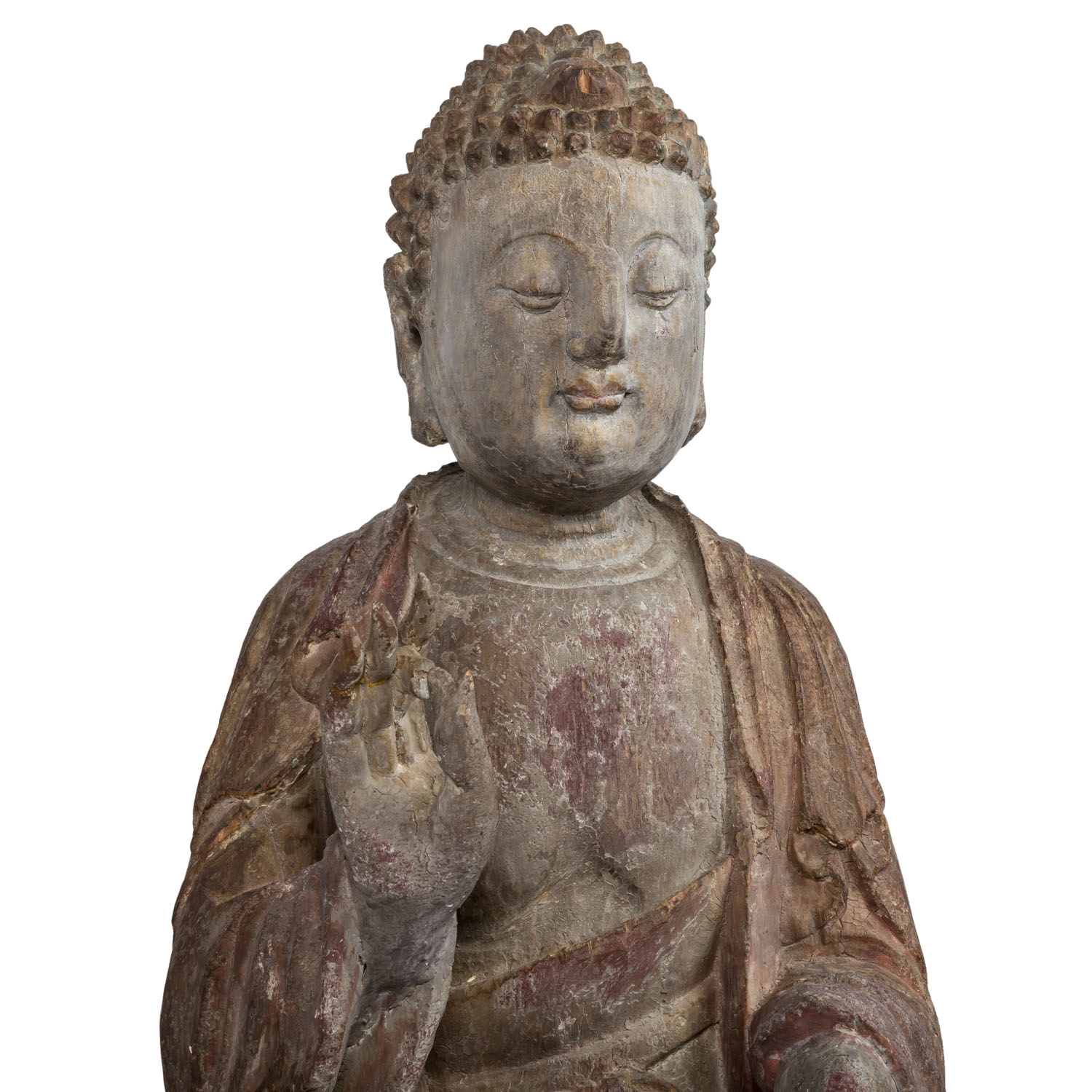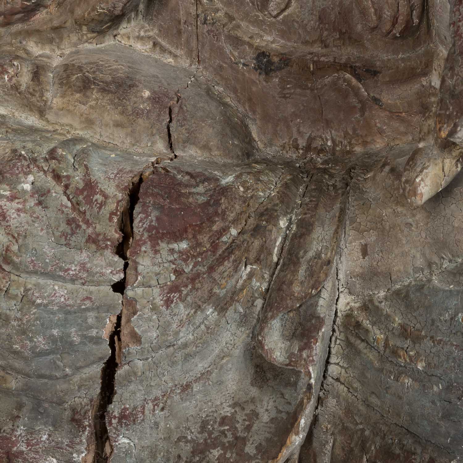 Wooden Buddha. CHINA, 19th century. Depicted in a meditative pose, with remnants of a colored finish. HxWxD: approx. 67x40x31 cm. Damage due to age, such as stress cracks, damage. NOT SUITABLE FOR SHIPPING