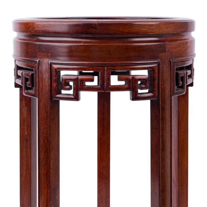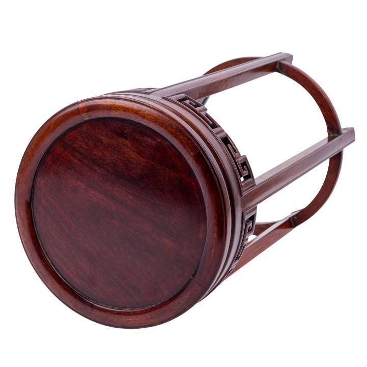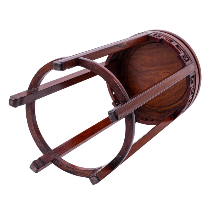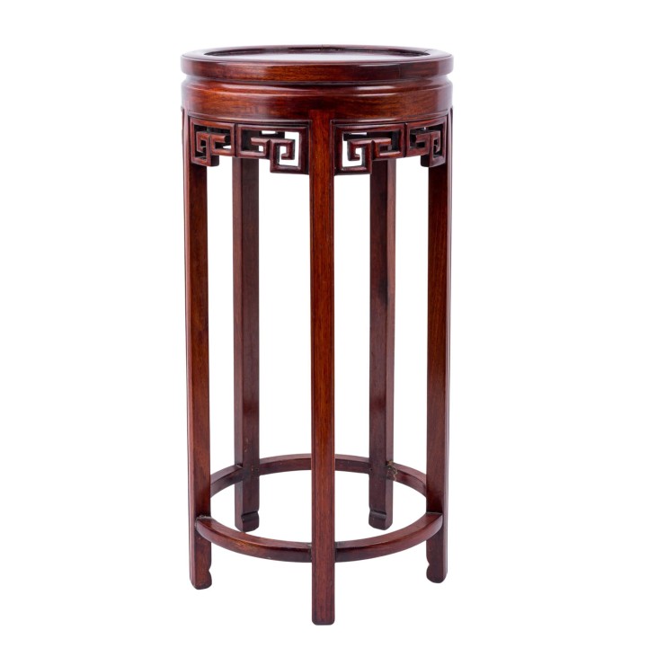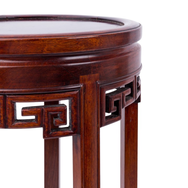 Side table made of wood. CHINA, 20th century, round tabletop, with openwork carved edge decoration, on four legs, height: 54 cm. Signs of use.