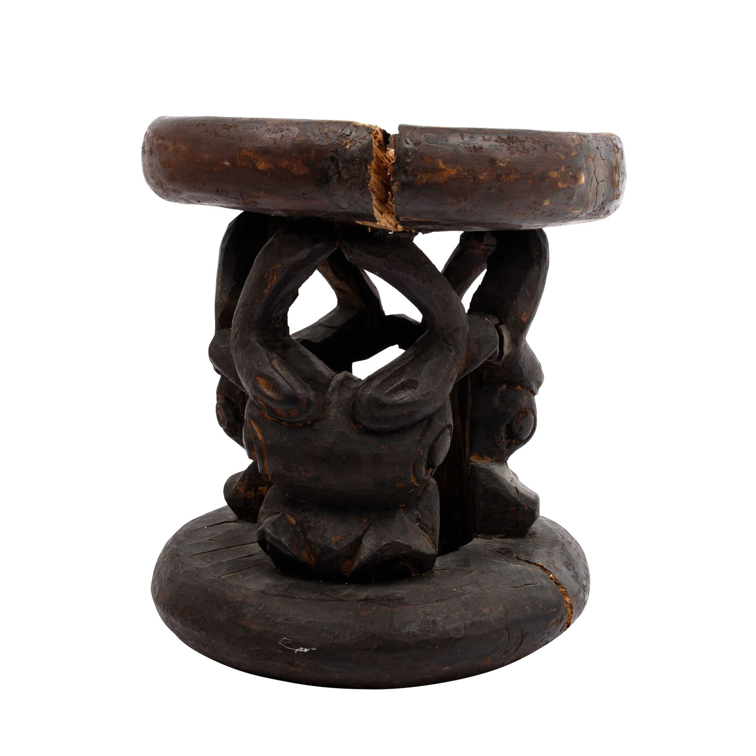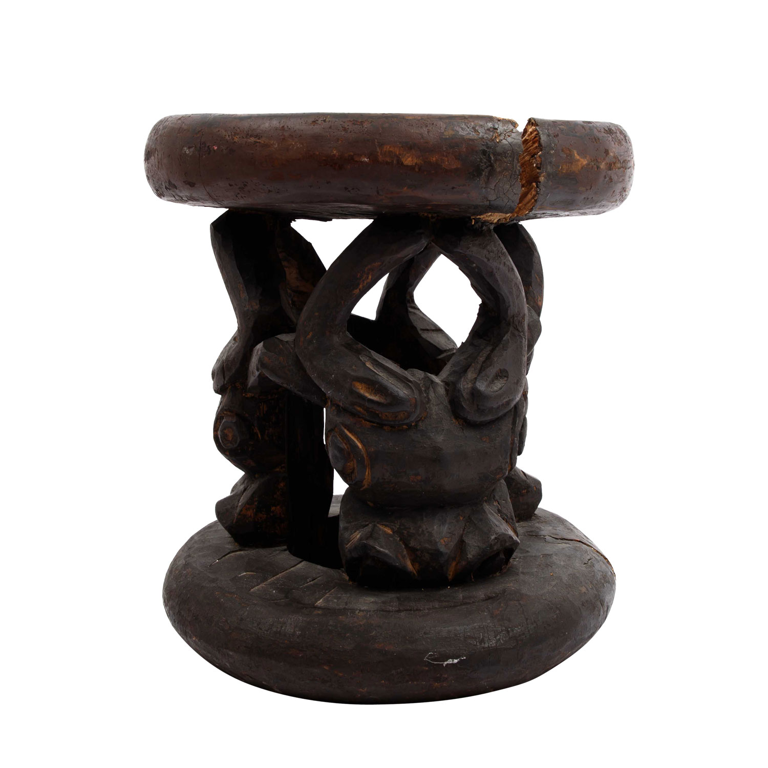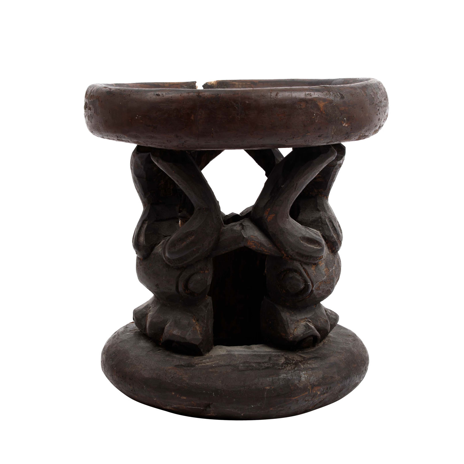 Wooden stool with ox carving. CAMEROON GRASSLAND. The round seat is supported by three ox heads, h: 29 cm/d: 26 cm. Cracks because of the age in seat and standing ring.