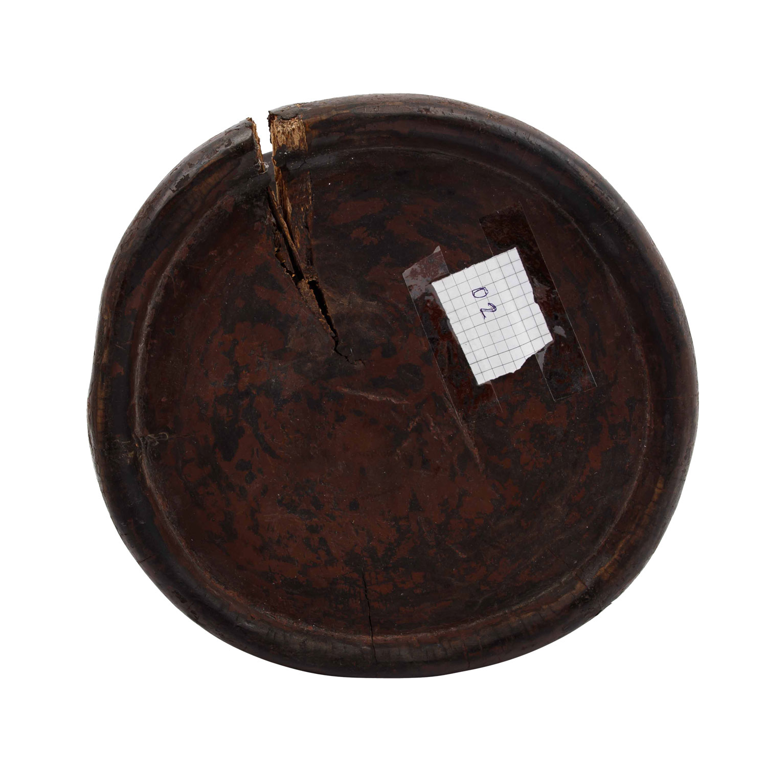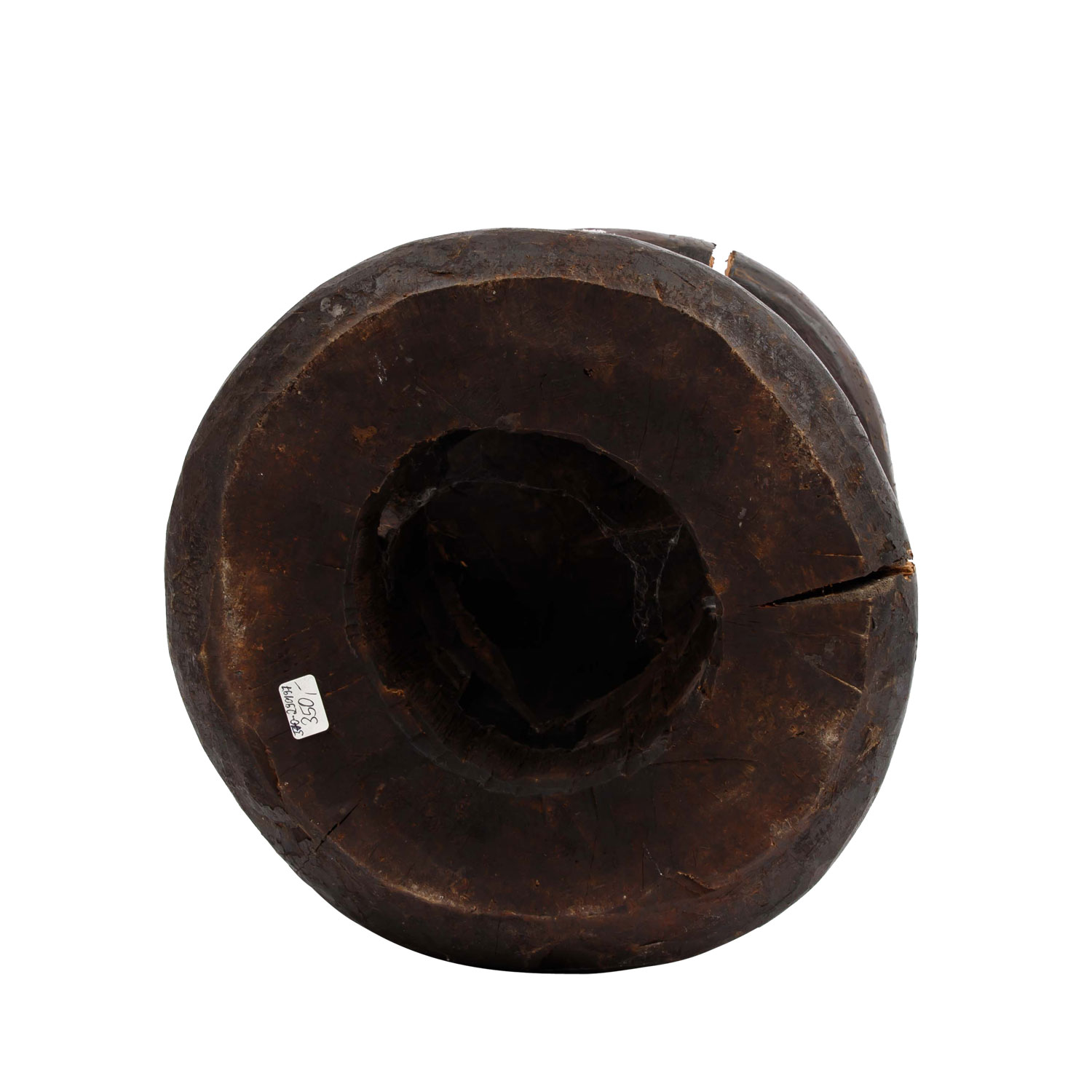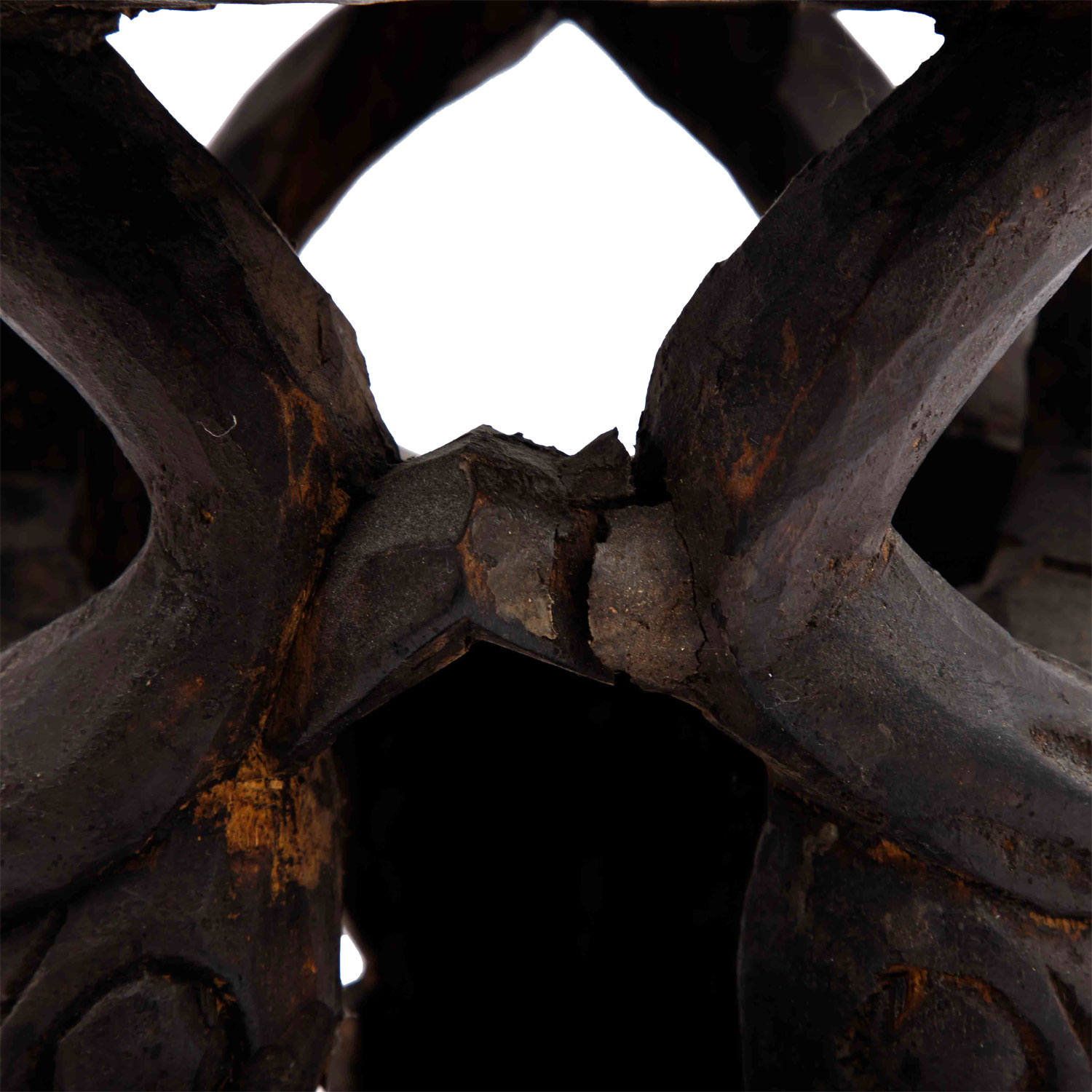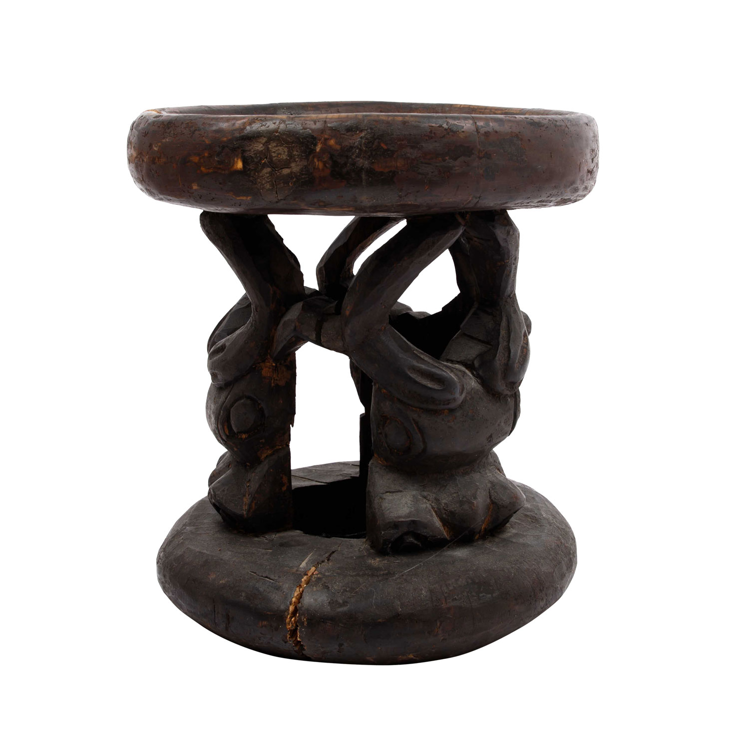 Wooden stool with ox carving. CAMEROON GRASSLAND. The round seat is supported by three ox heads, h: 29 cm/d: 26 cm. Cracks because of the age in seat and standing ring.