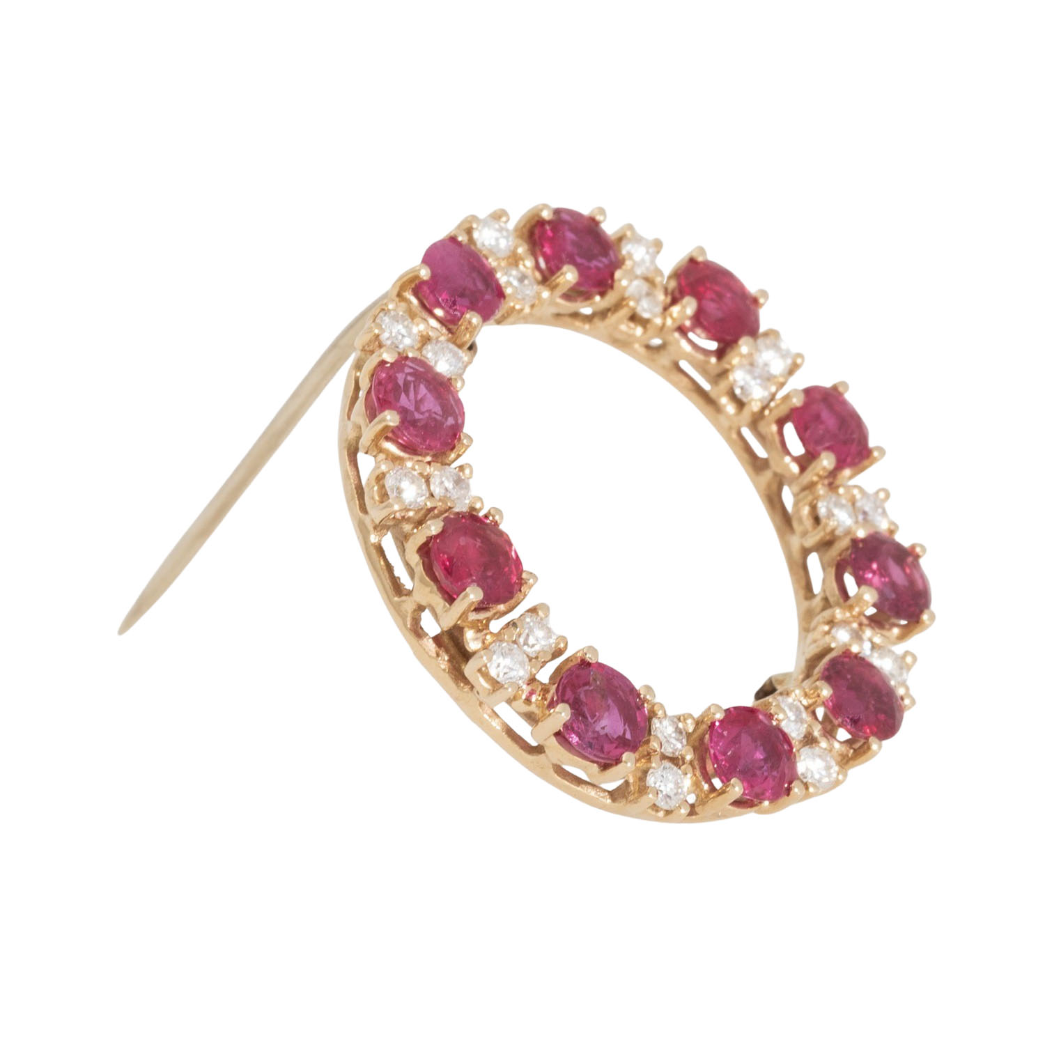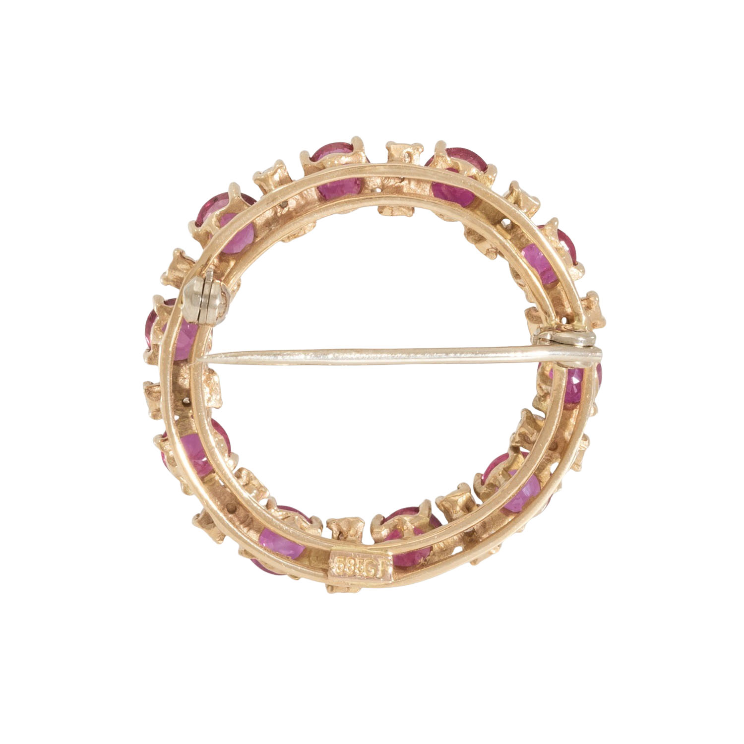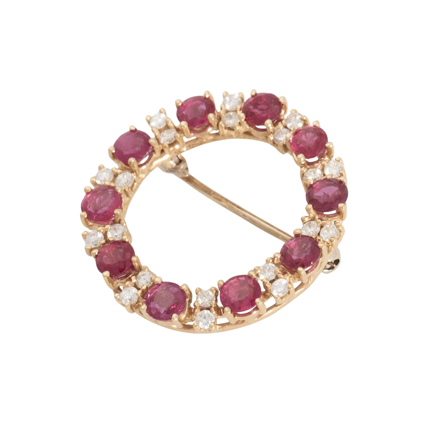 Wreath brooch with 10 round faceted rubies totalling ca. 3 ct and 20 brilliant-cut diamonds totalling ca. 0.3 ct, 14K yellow gold 5.6 g, D: 2.8 cm, around 1980, good condition.