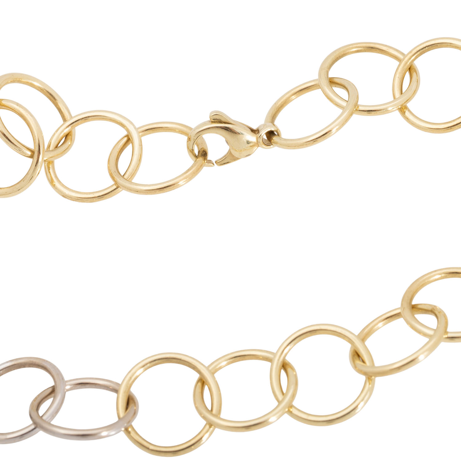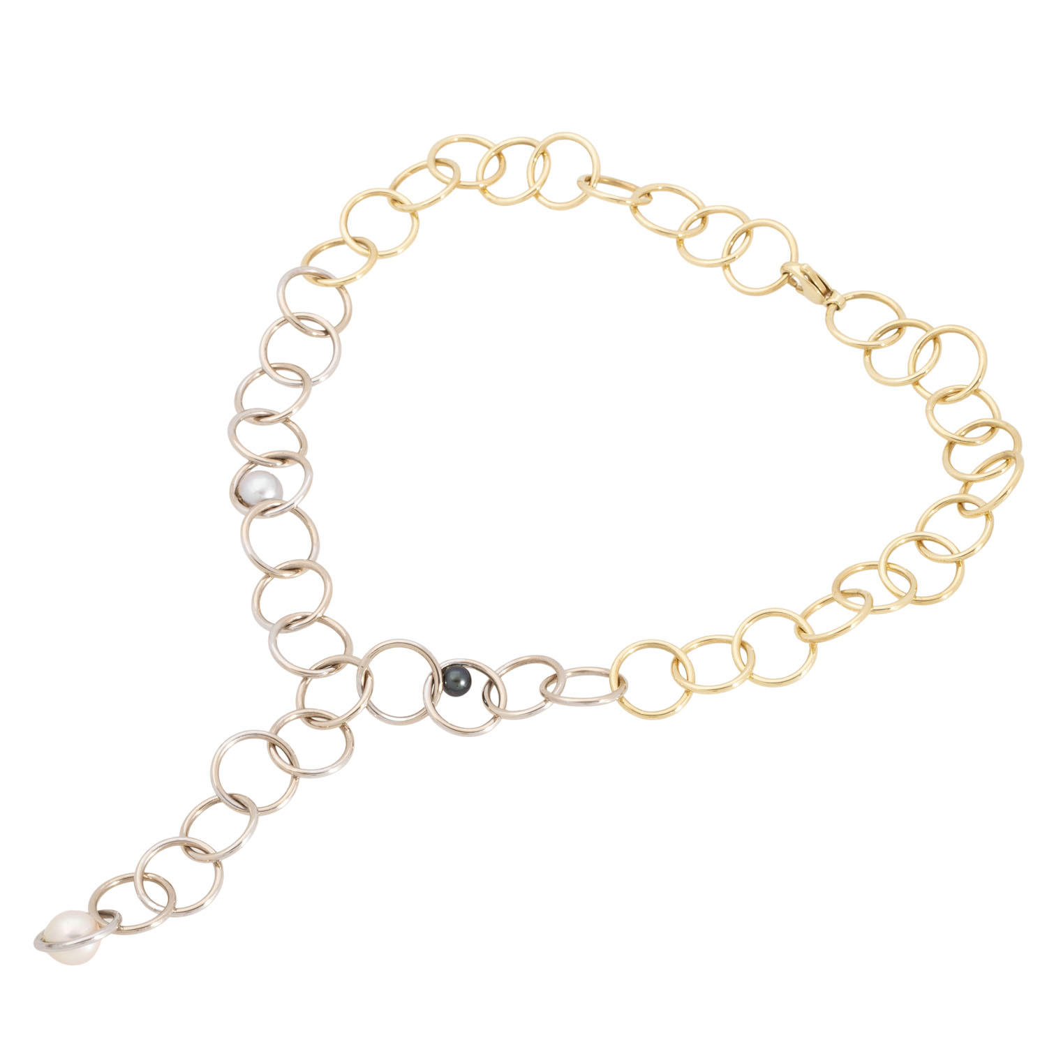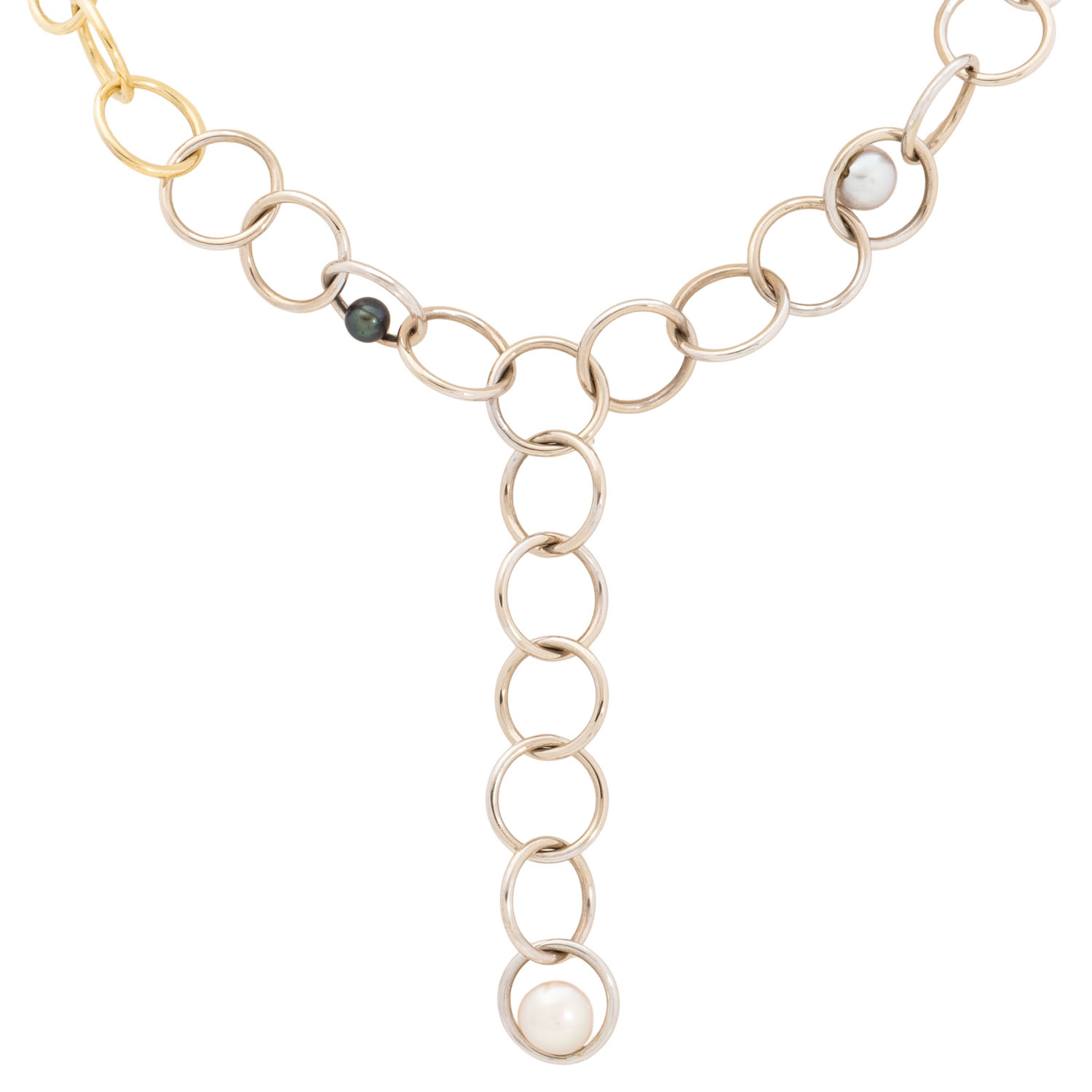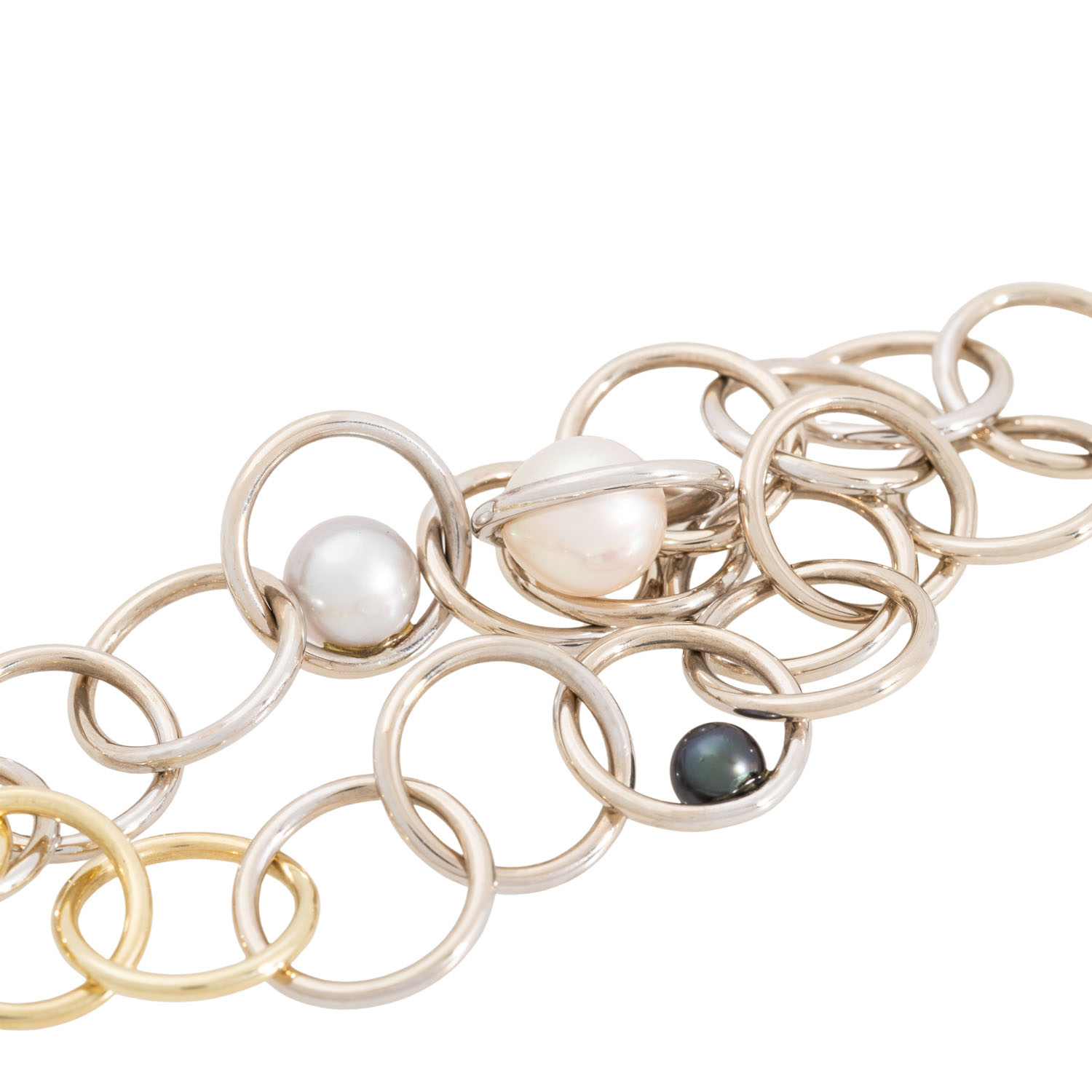 Y-necklace, anchor chain with 3 cultured pearls, D (white/grey/black): 7.9/6.6/4.5 mm, good lustre, 14K yellow gold, 18K white gold, totalling 42.8 g, lobster clasp GG 14K, L: 40 cm, D (loops): 12.9 mm, end of the 20th century, minimal signs of wear, handcrafted.