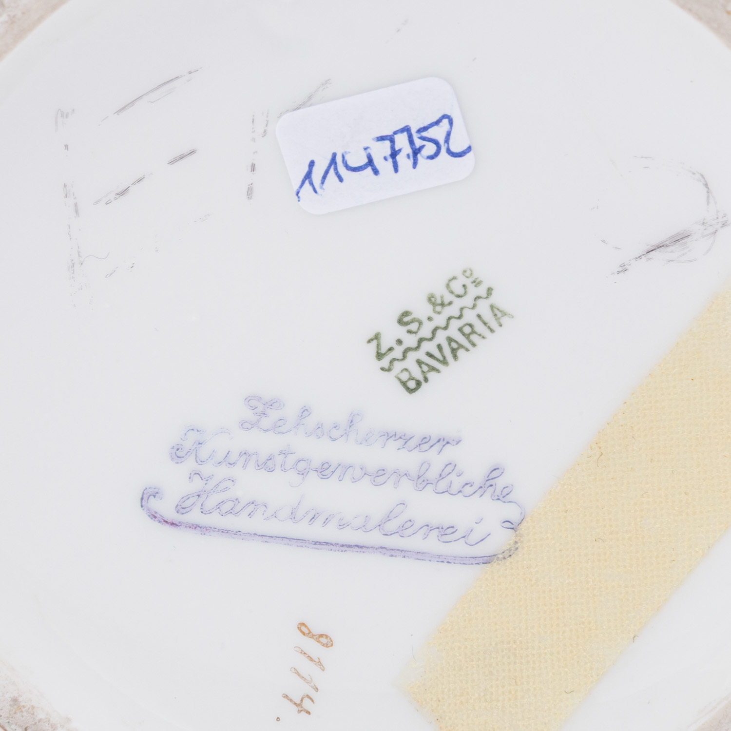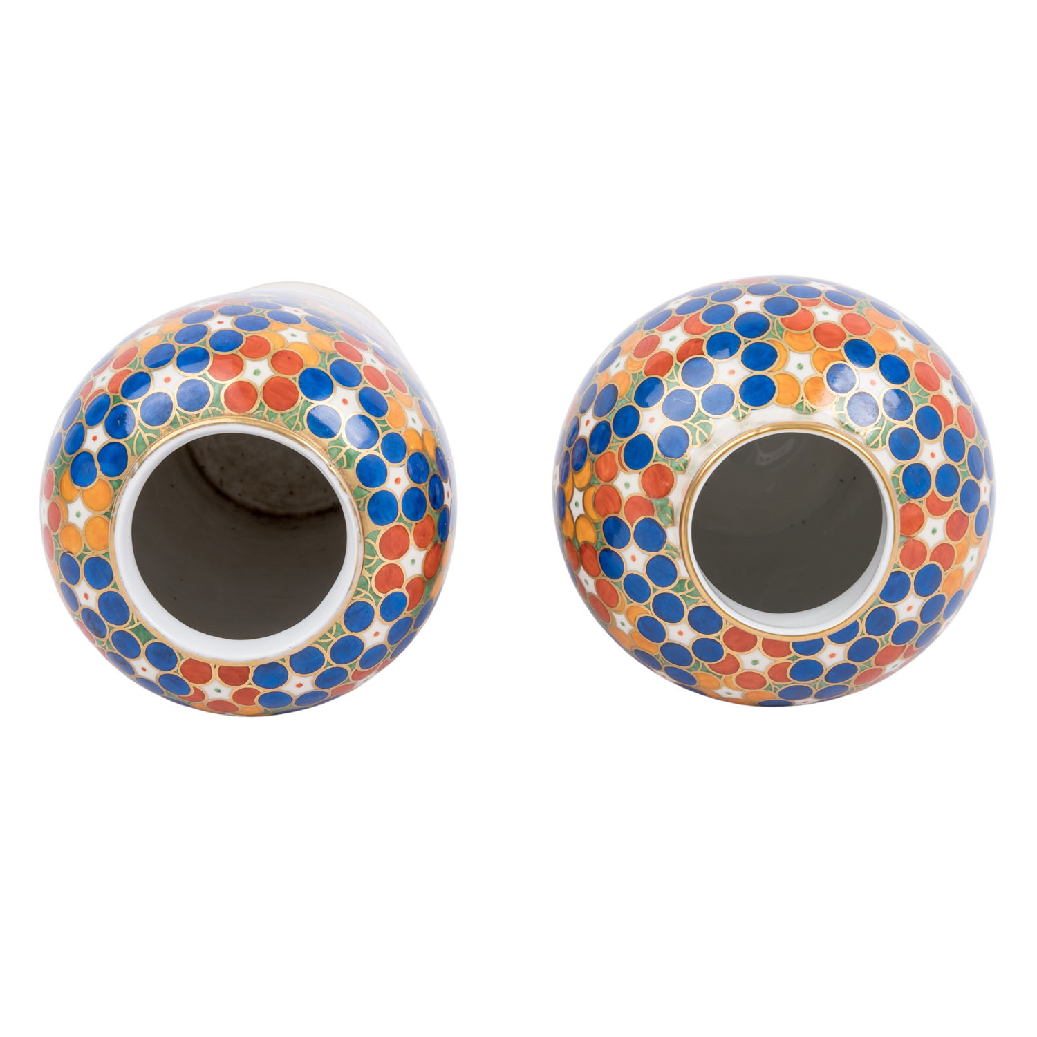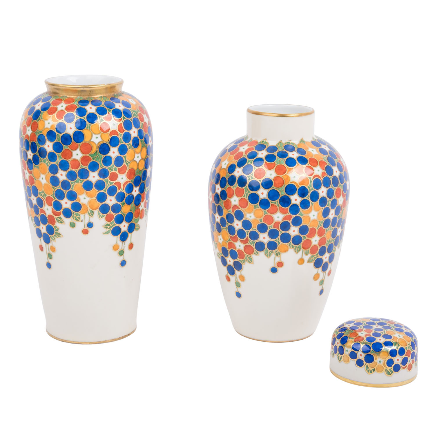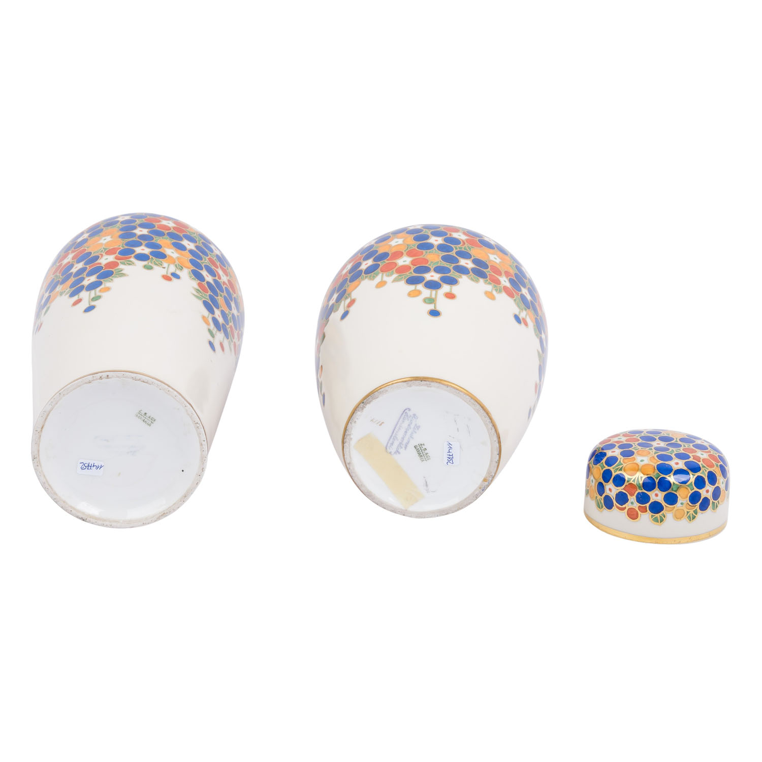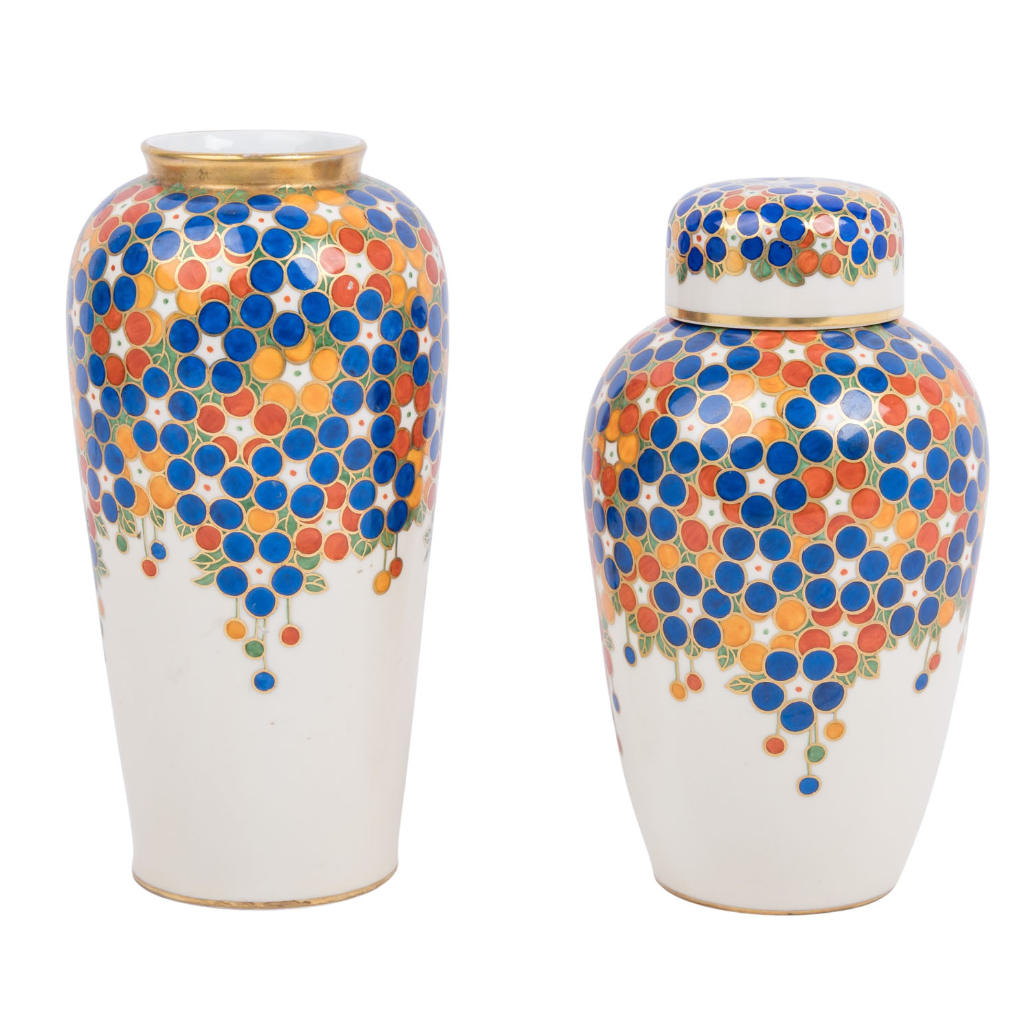 ZEH SCHERZER Pair of Art Nouveau Vases, 1880-1918, white porcelain, each cream-colored background with polychrome painting of circular ornaments, gilded, 1 vase with bulbous shoulder, H 25 cm and 1 lidded vase, H 23.5 cm, each with a green stamp from 1880-1918 and the addition 'Zehscherzer Kunstgewerbliche Handmalerei', gilding partly rubbed, each with signs of age and wear.