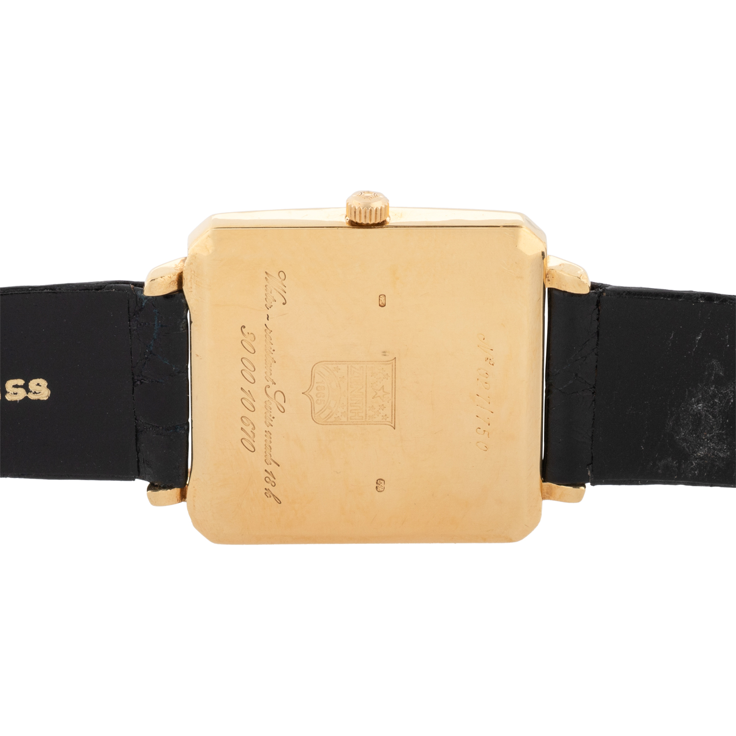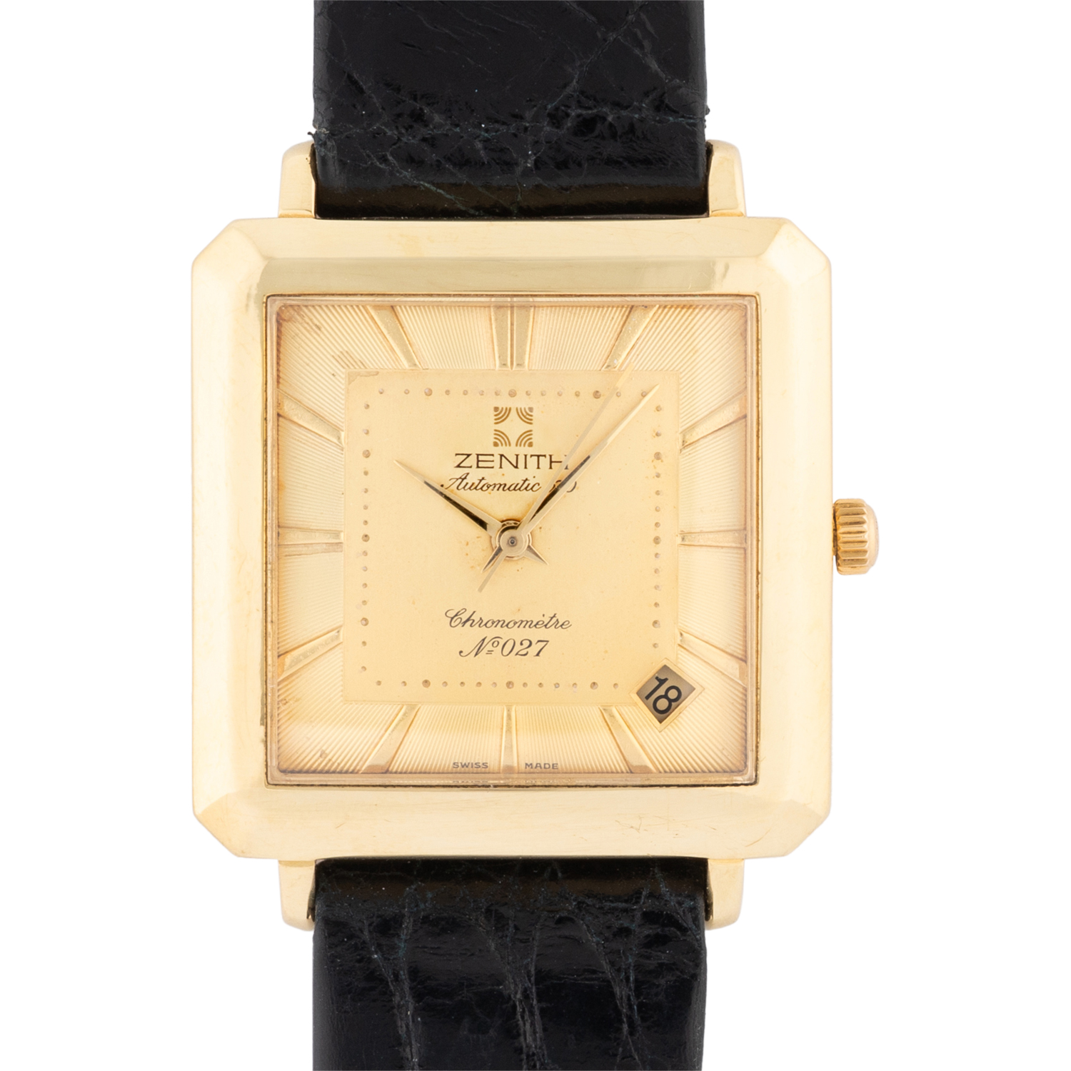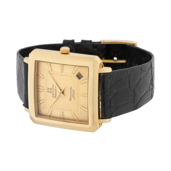 ZENITH Elite 670 Limited Edition “Cioccolatone” Chronometer Ref 300010670 Men's watch. Approx. late 1990s. 18K yellow gold. Automatic movement Cal. 670 with new revision (11/2025), very good performance (+7 s/d, 293° amplitude). Limited edition No. 027 of 750 pieces. The individual limited edition number is on the dial and the case back. Gold-colored, textured dial (with small bubbles) with applied indices and date display between 4 and 5 o'clock. Favre Leuba leather wristband with original Zenith buckle in 18K yellow gold. Used, visible signs of wear on the case and buckle. Proof of service included. Diameter approx. 33 mm (measured without crown).