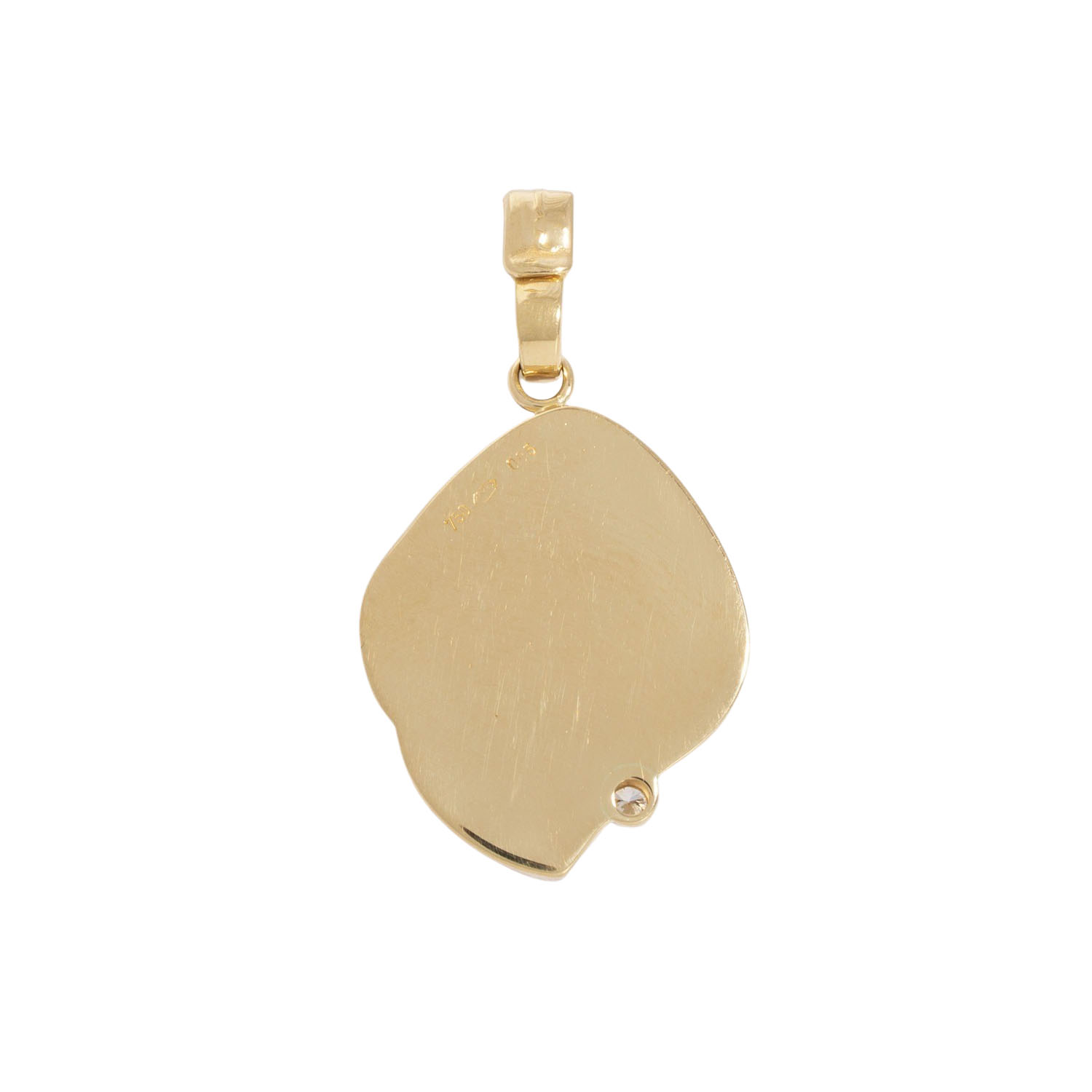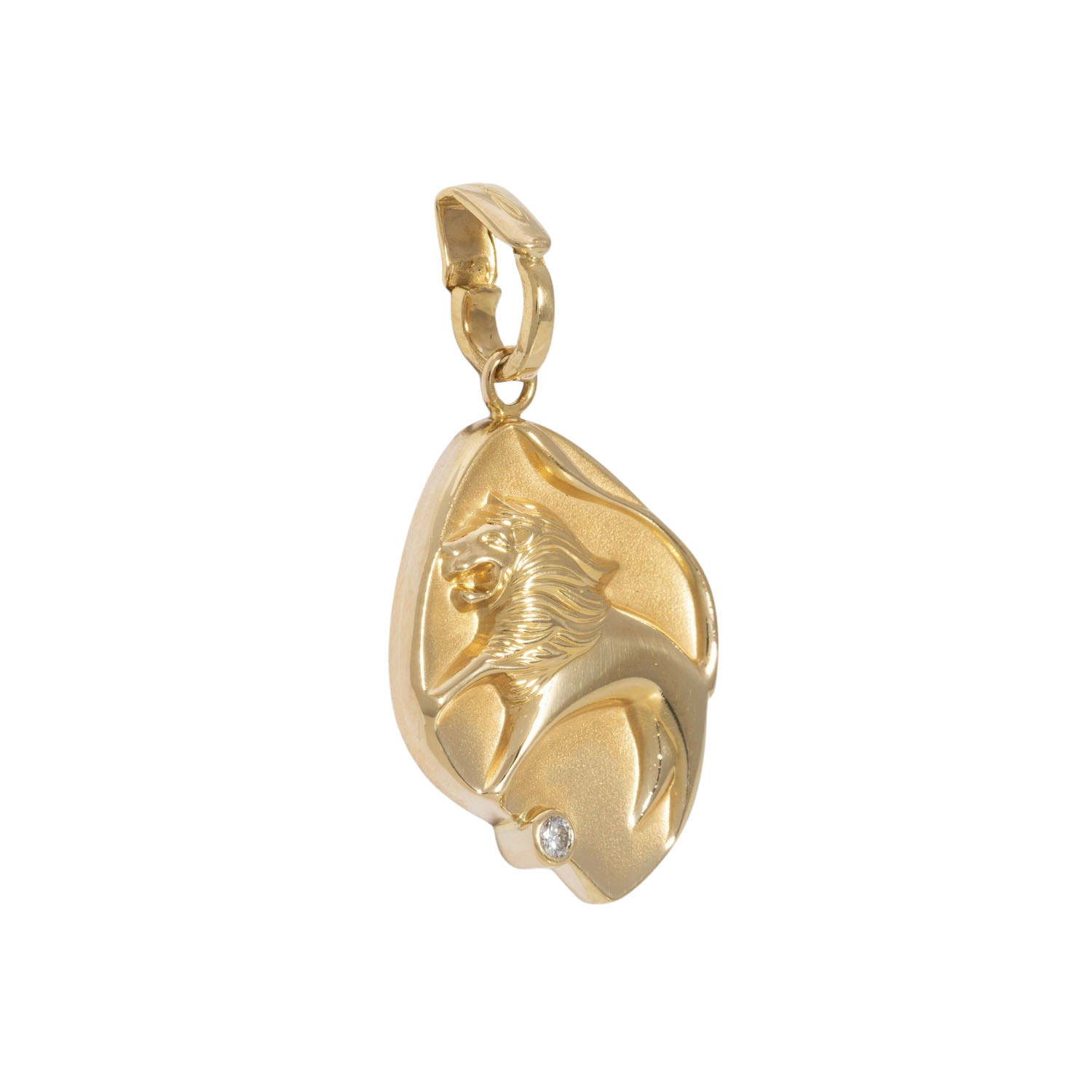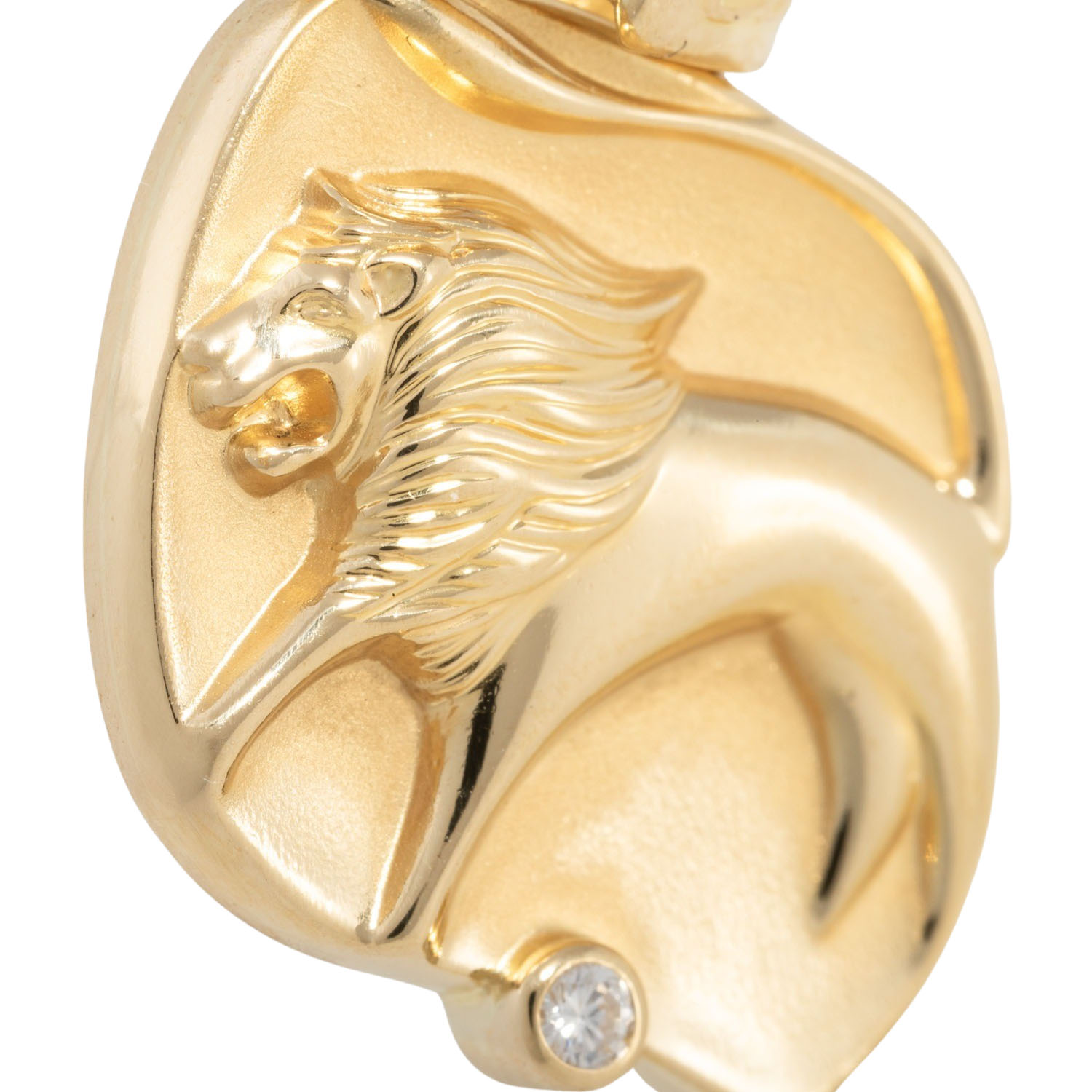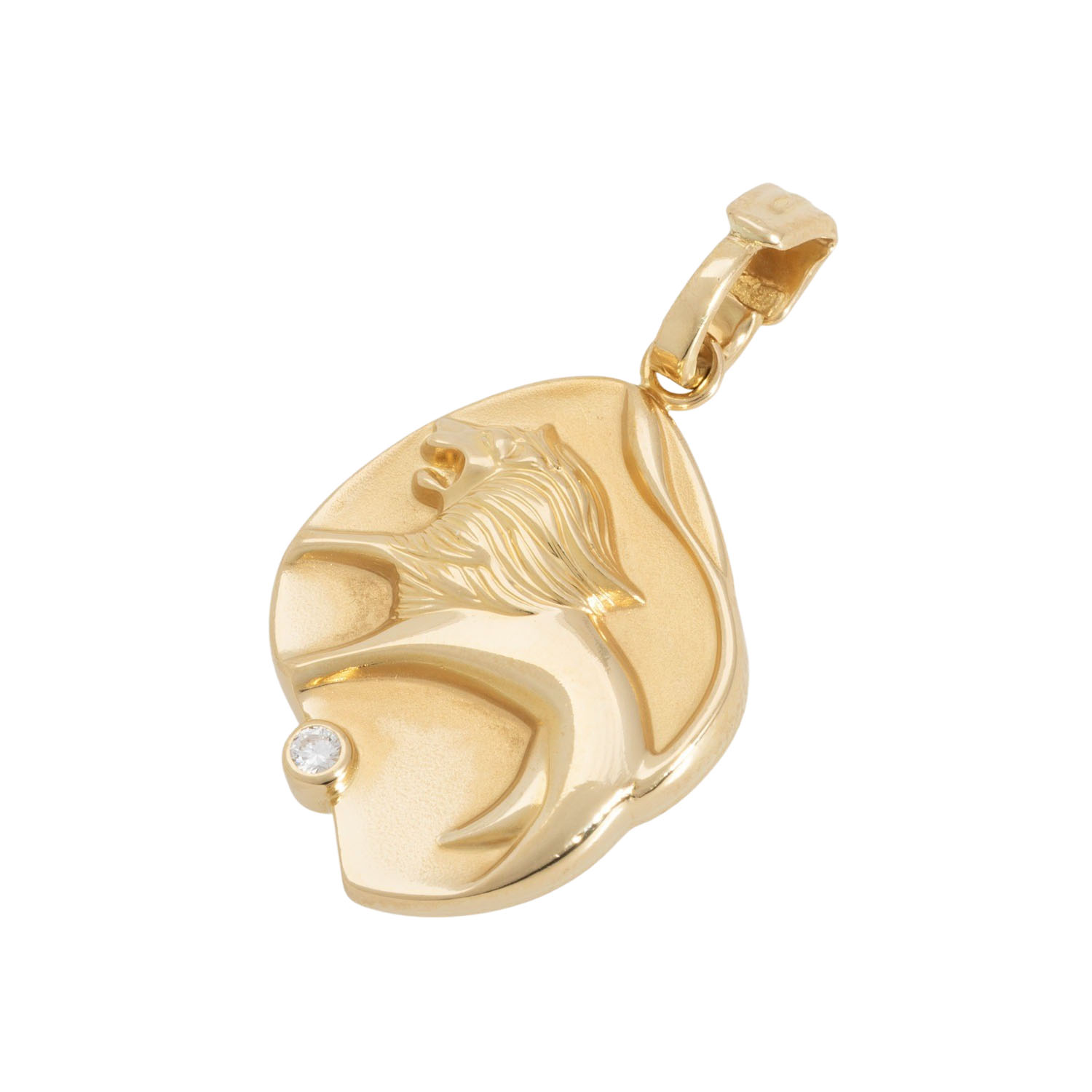 Pendant zodiac sign 'Lion' with one brilliant cut diamond, 0.05 ct (marked), good colour and clarity, 18K yellow gold, 8.6 g, L x W: 36 x 20 mm, late 20th century, minimal signs of wear.