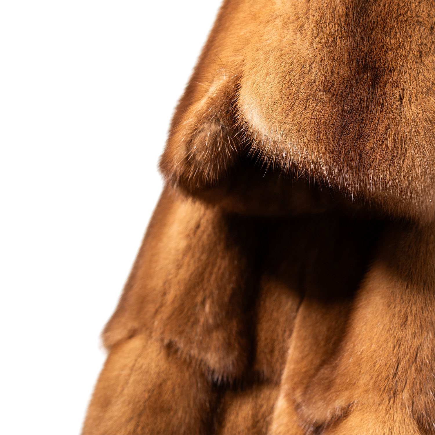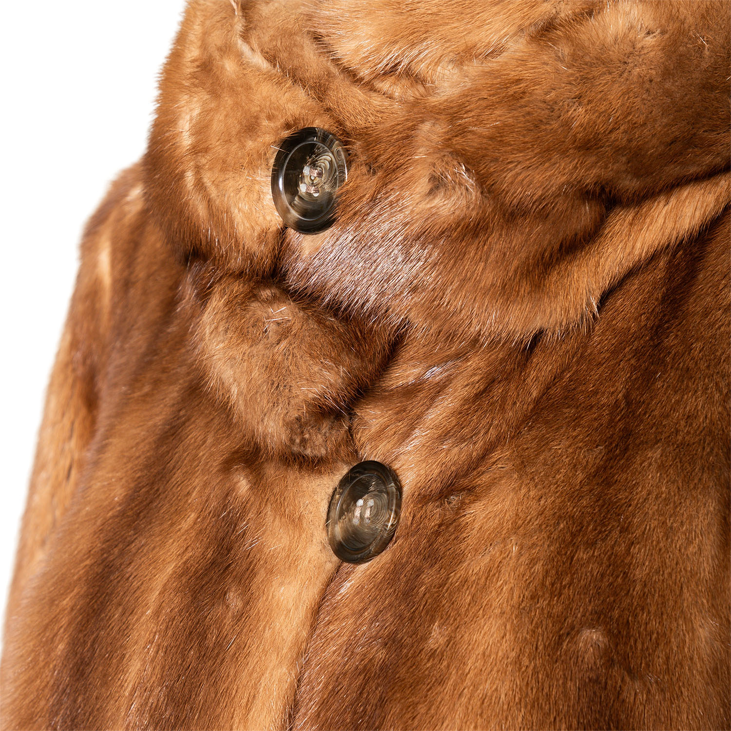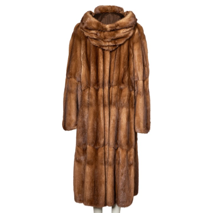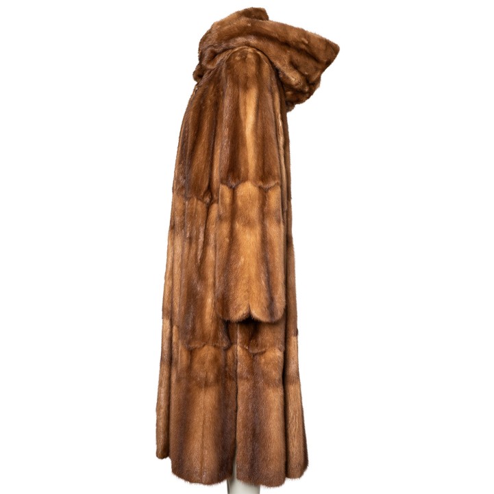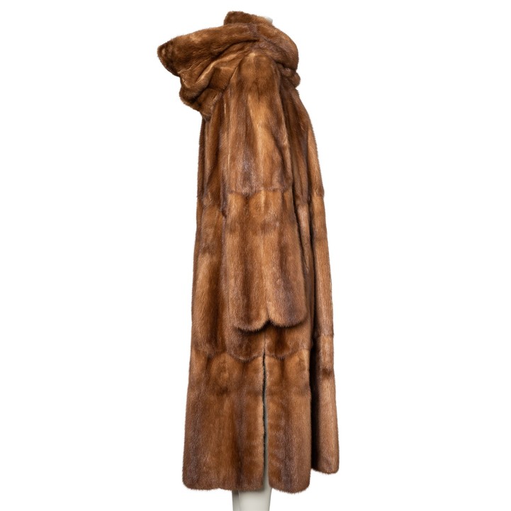 Hochwertige Nerzfelle in Hellbraun mit Kapuze, seitlichen Schlitzen und Eingrifftaschen. Guter Erhalt.