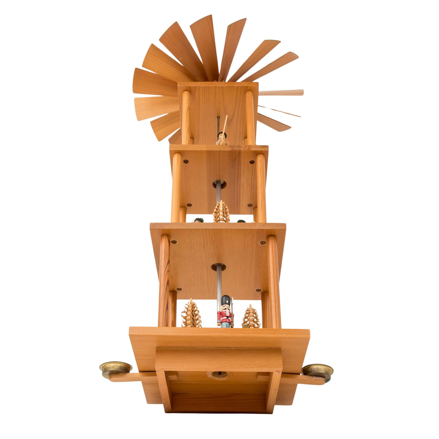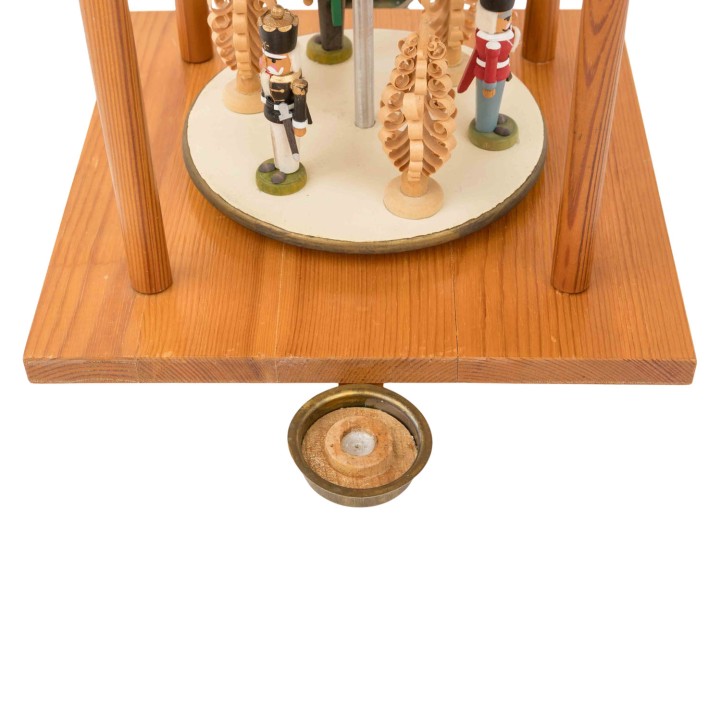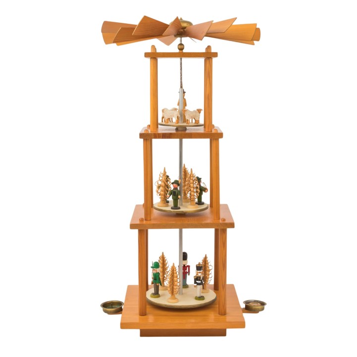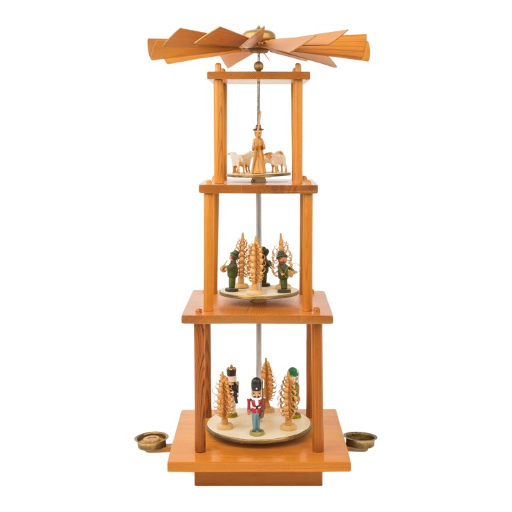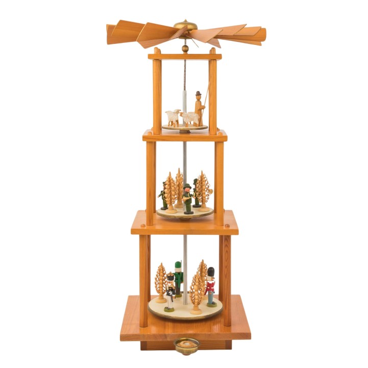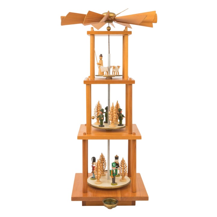 bestehend aus 3 quadratischen Etagen, sich nach oben verjüngend, Holz, teils farbig gefasst, bestückt mit Nussknacker, Jäger, Hirte mit Schafen und Bäumen, 2 seitliche Kerzentüllen, Flügelrad und Ebenen steckbar, Altersspuren.