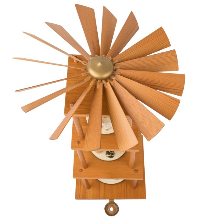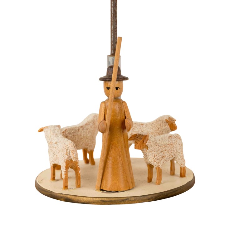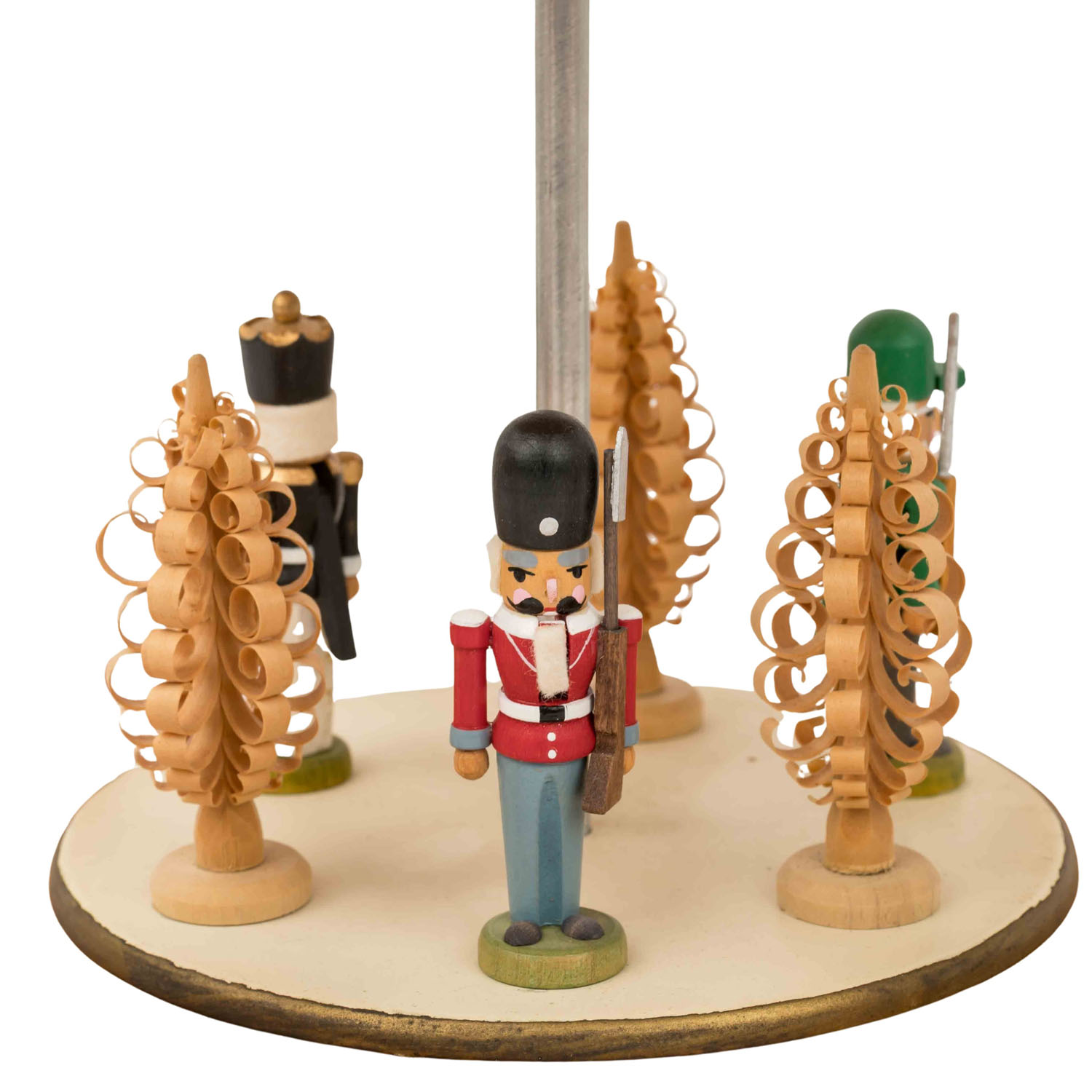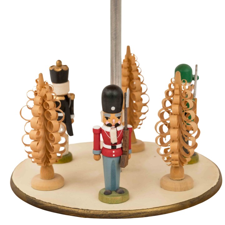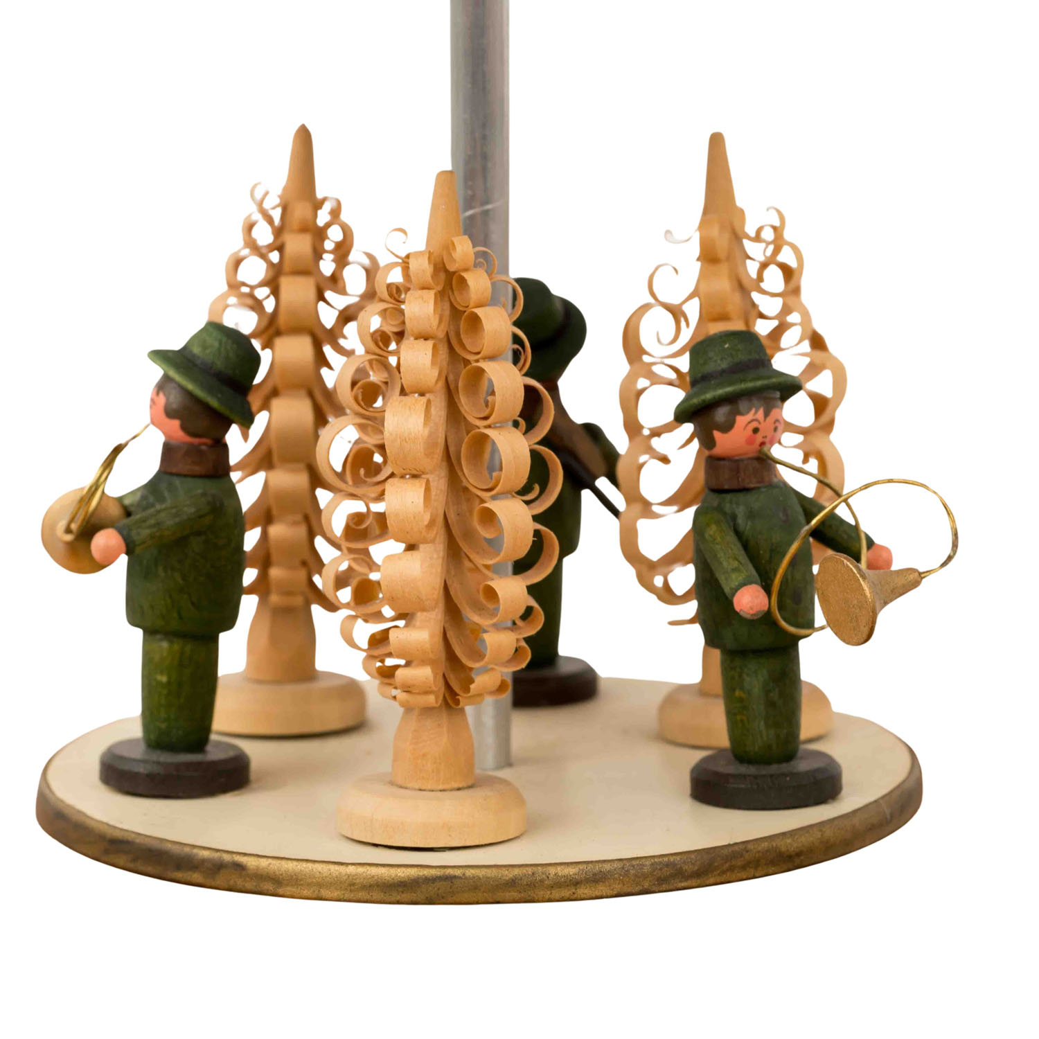 bestehend aus 3 quadratischen Etagen, sich nach oben verjüngend, Holz, teils farbig gefasst, bestückt mit Nussknacker, Jäger, Hirte mit Schafen und Bäumen, 2 seitliche Kerzentüllen, Flügelrad und Ebenen steckbar, Altersspuren.
