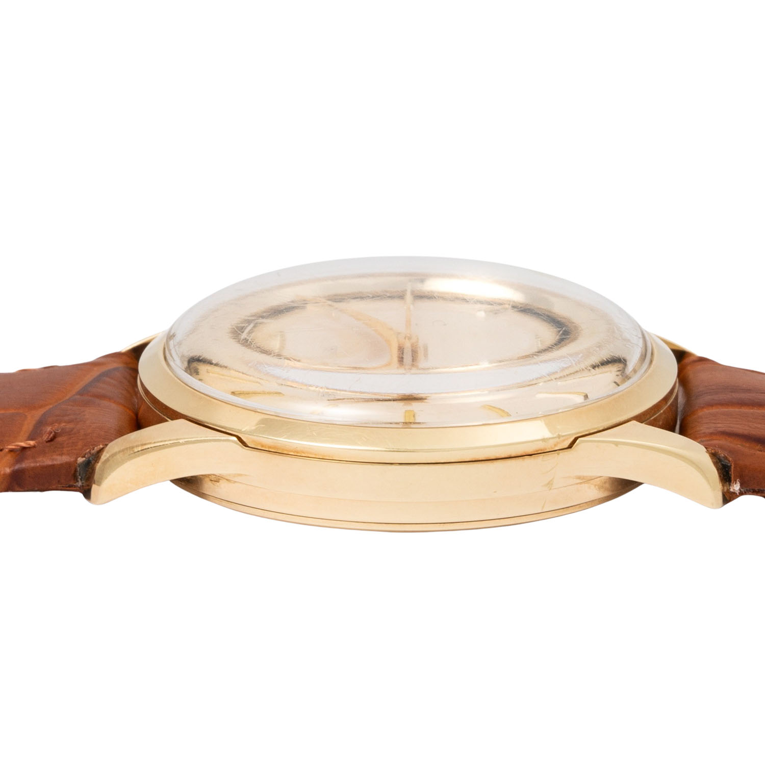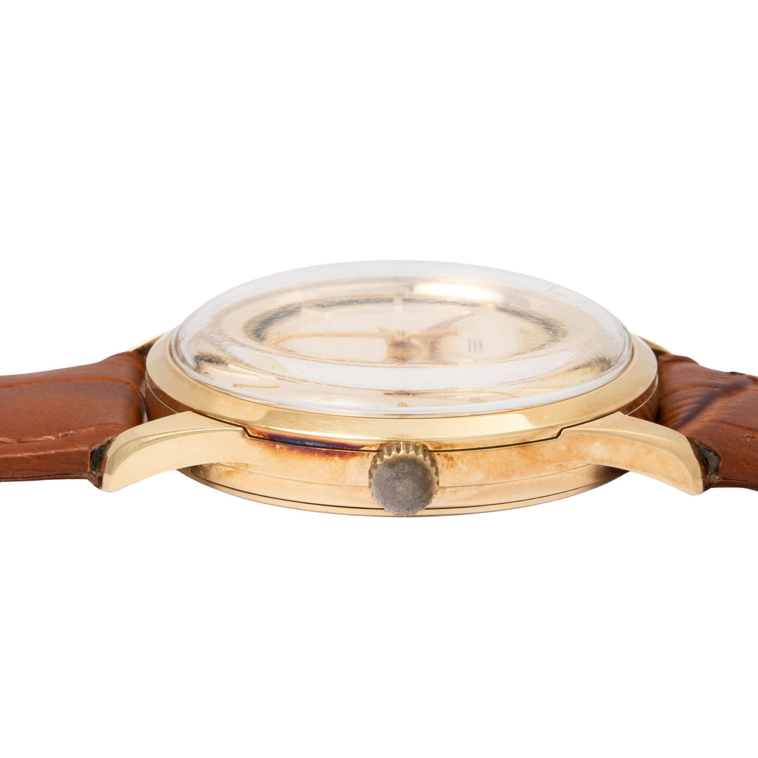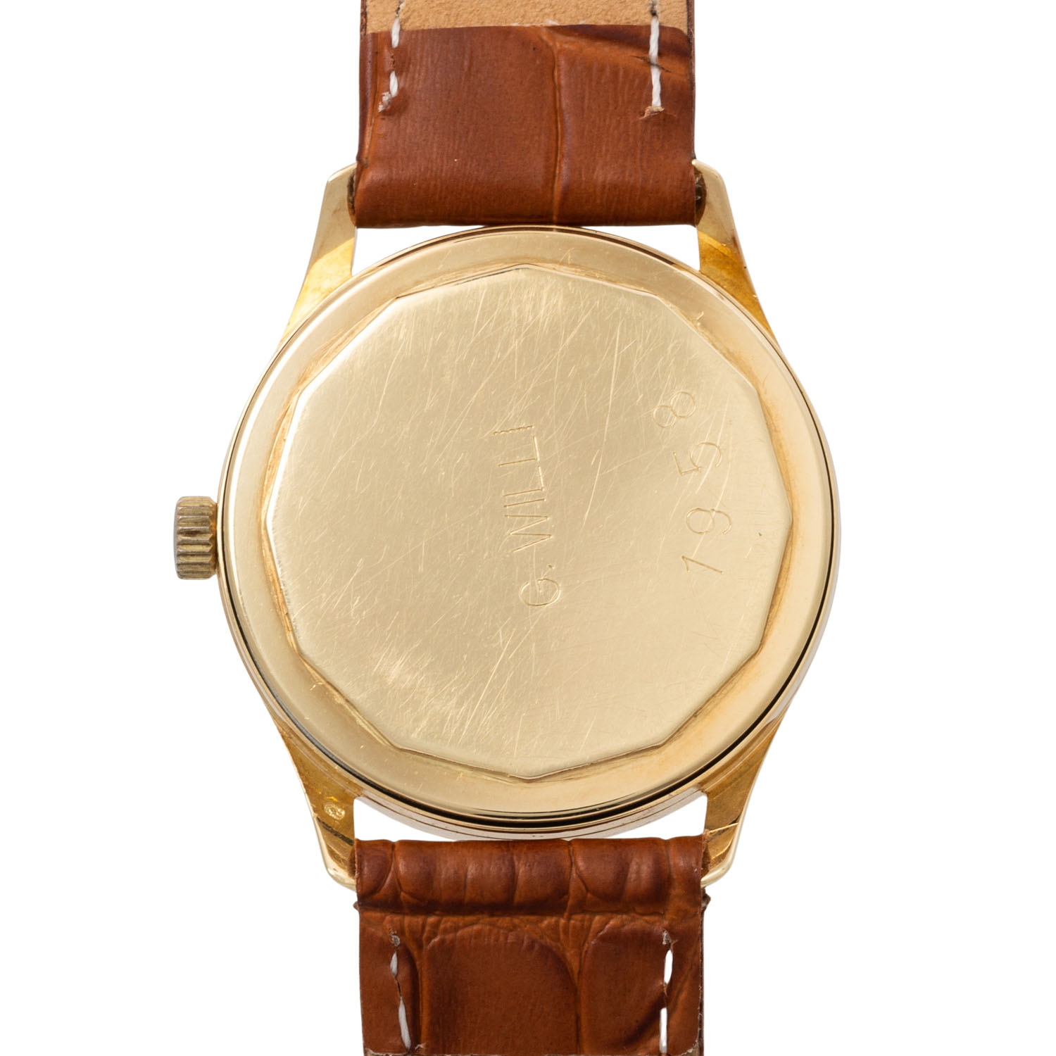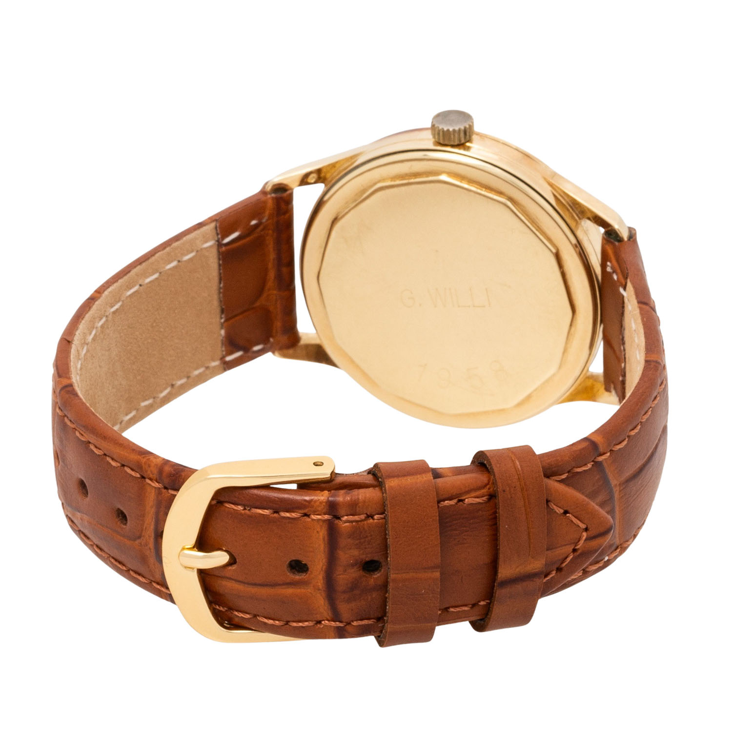 Gelbgold 14K. Werk umgebaut auf Quarzwerk. Funktionsfähiger Zustand mit neuer Batterie. Zifferblatt mit aufgesetzten Indizes. Gehäuseboden mit persönlicher Gravur 'G. Willi 1958'. Guter Vintage Zustand mit Tragespuren. Durchmesser ca. 33 mm (gemessen ohne Krone).