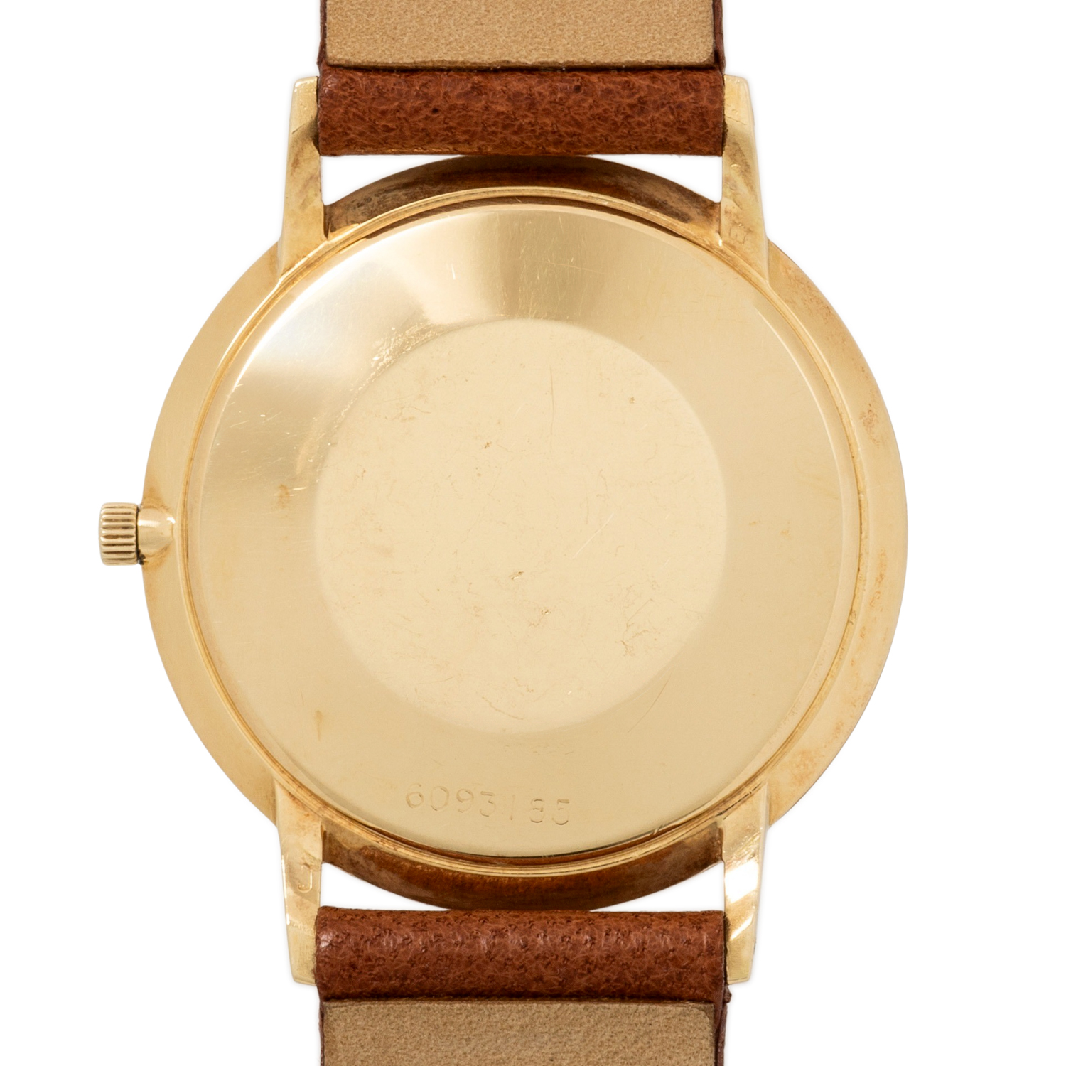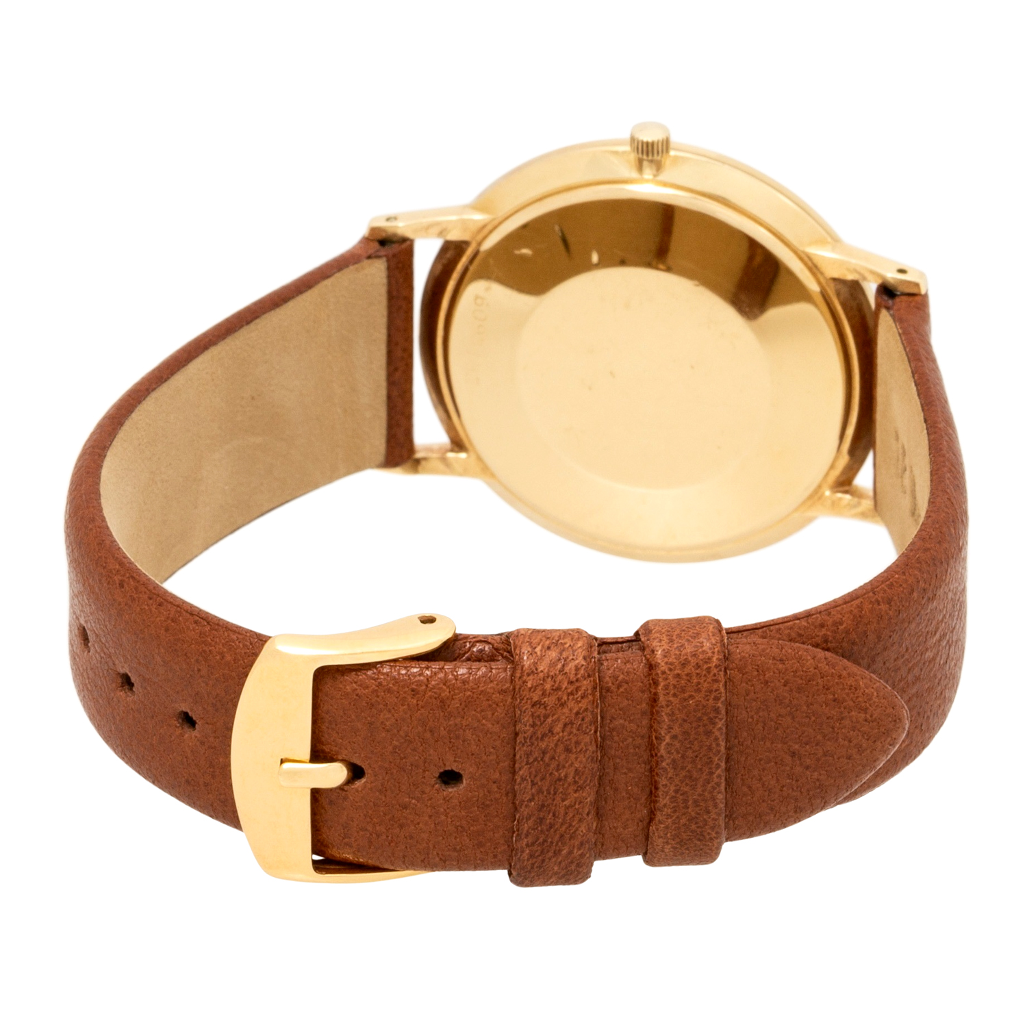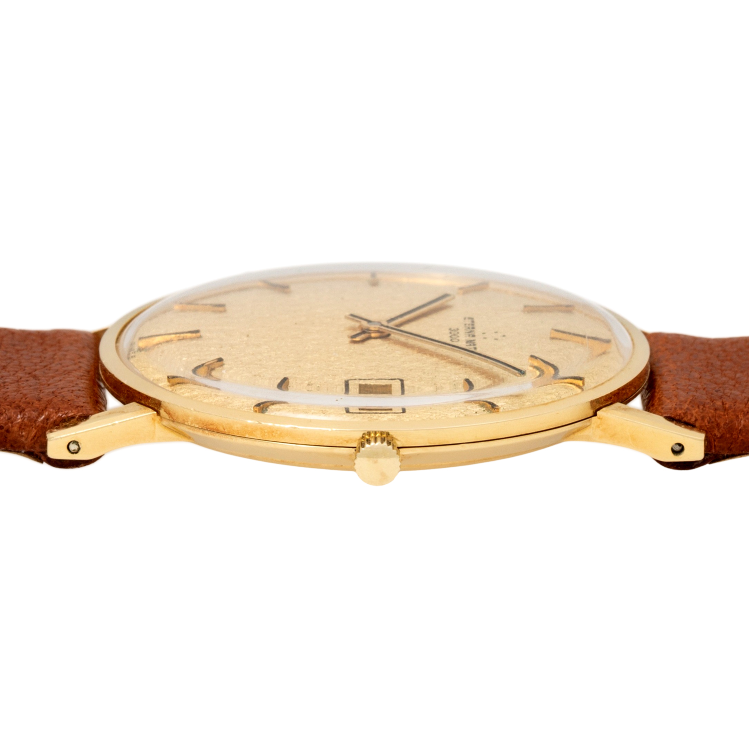 Gelbgold 18K. Automatik-Werk Kal. 1500 mit. sehr guten Gangwerten (+6s/d. 275°). Goldfarbenes Zifferblatt (Reprint) mit strukturierter Oberfläche, Stabindizes und Datumsanzeige. Neues Lederband mit vergoldeter Dornschließe. Guter Zustand mit Tragespuren. Ursprungszeugnis und Garantiezertifikat anbei. Gekauft im Mai 1971 bei Juwelier Kutter in Stuttgart. Durchmesser ca. 34,5 mm (gemessen ohne Krone).