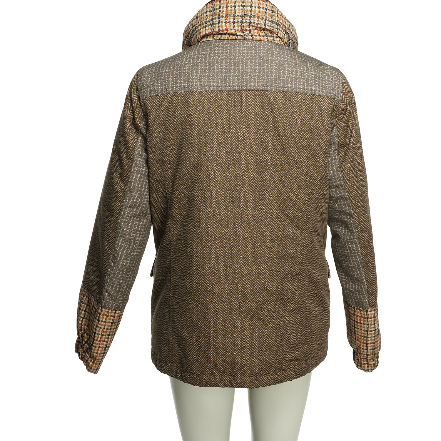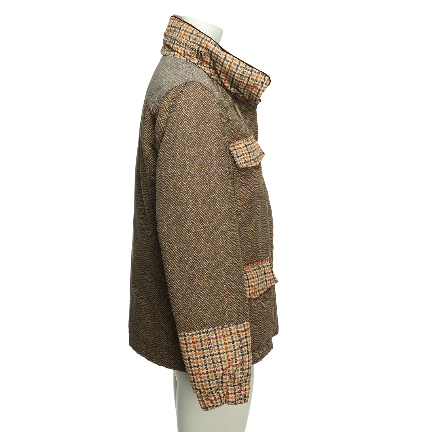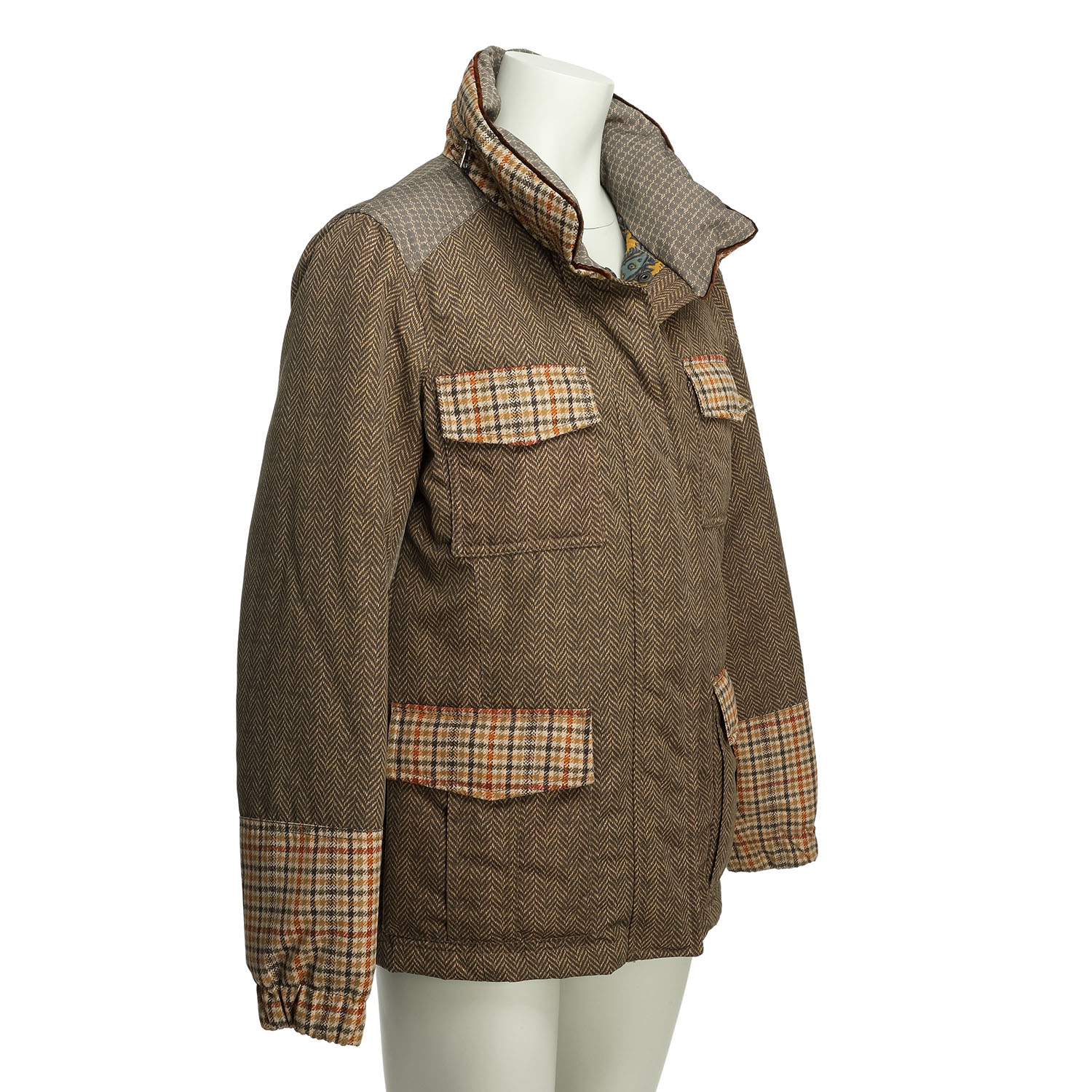 Wattierte Jacke in Erdtönen mit vier Außentaschen, Stehkragen mit verdeckter Kapuze und elastischen Ärmelbündchen. Verdeckte Knopfleiste mit Druckknopfverschluss. Guter Erhalt.