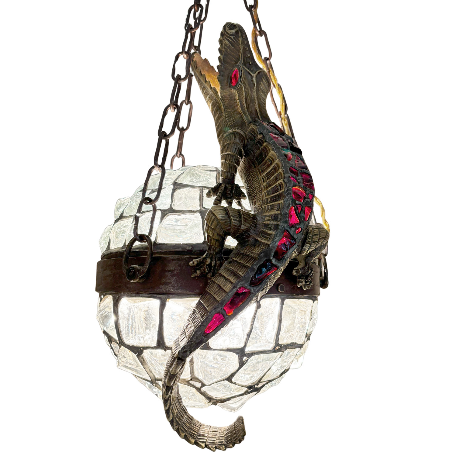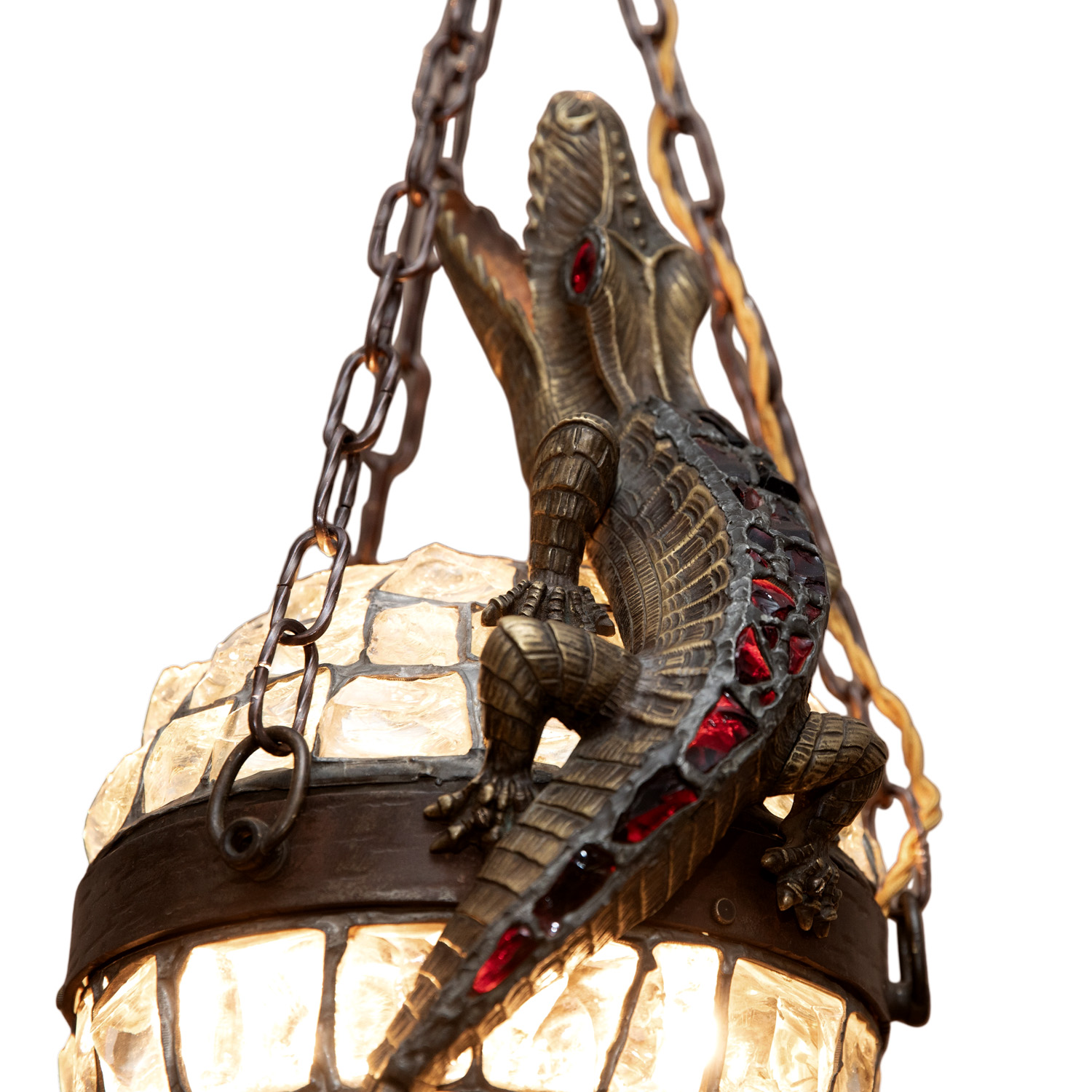 aus geschliffenen Glaselementen, Messing- und Bronzerahmen, mit wunderschöner Darstellung eines nach oben schauenden Nibelungen-Drachens, H x B 80 x 30 cm, guter Zustand.