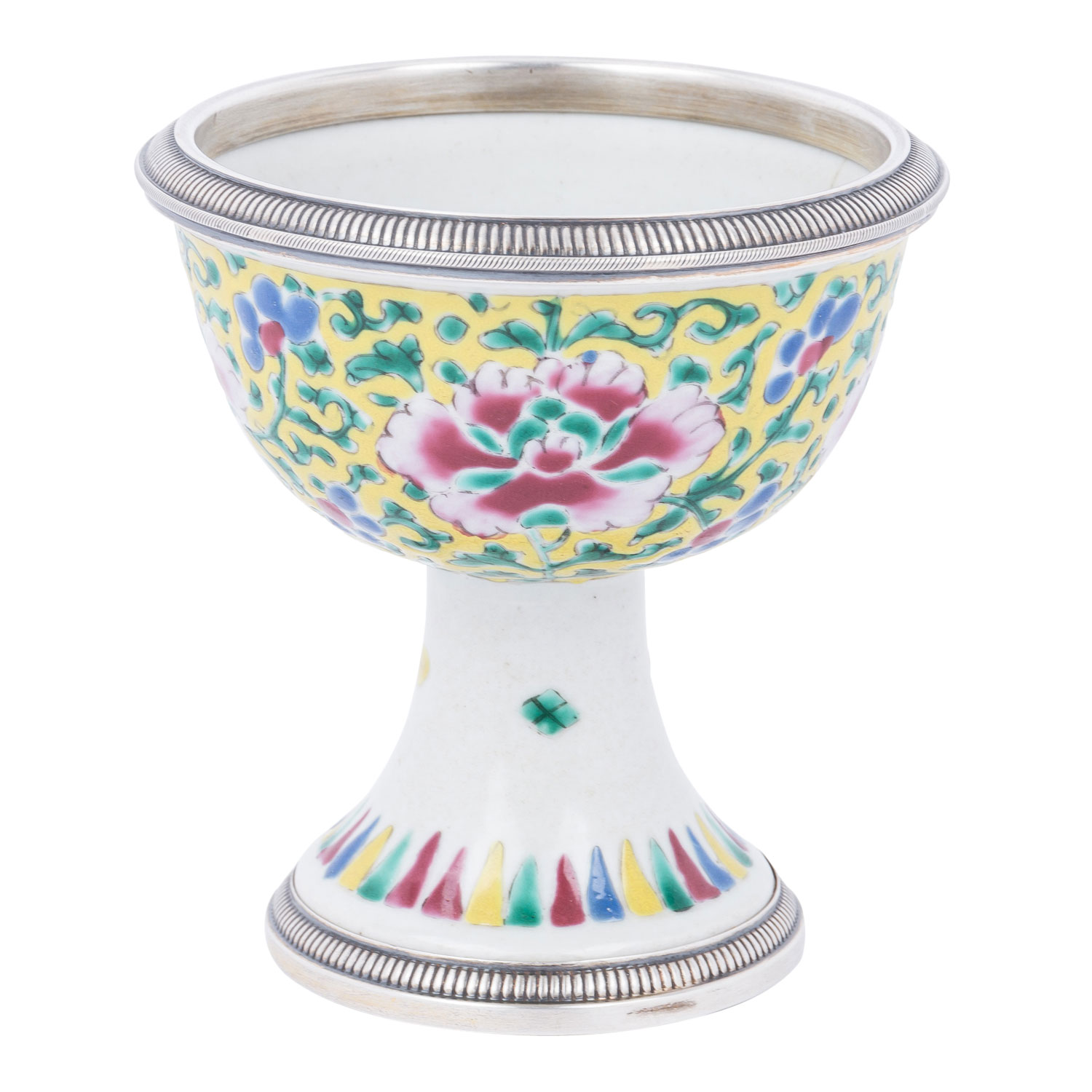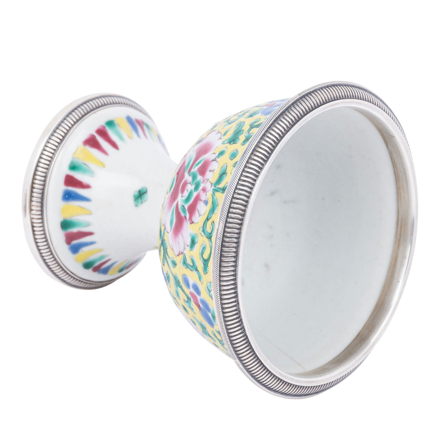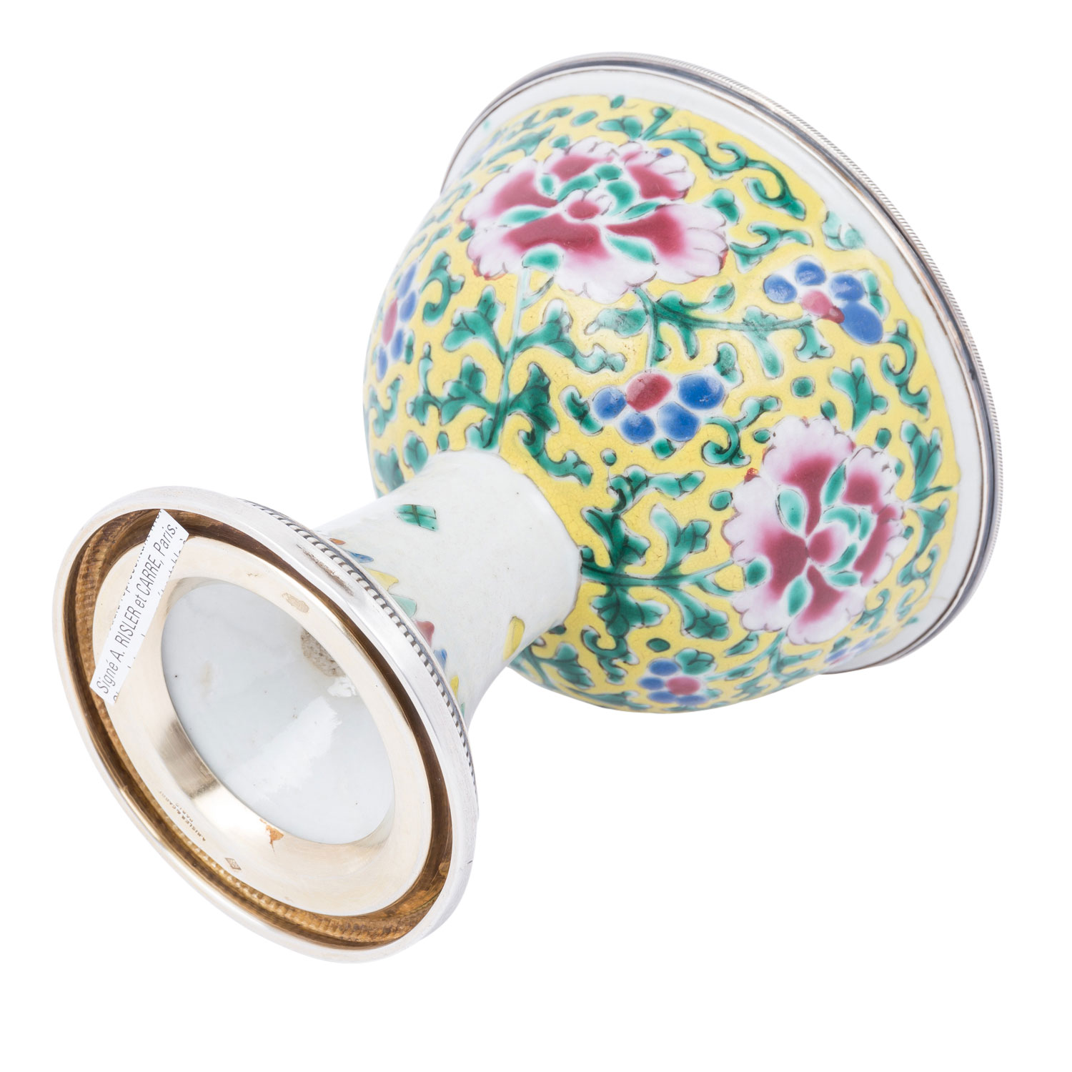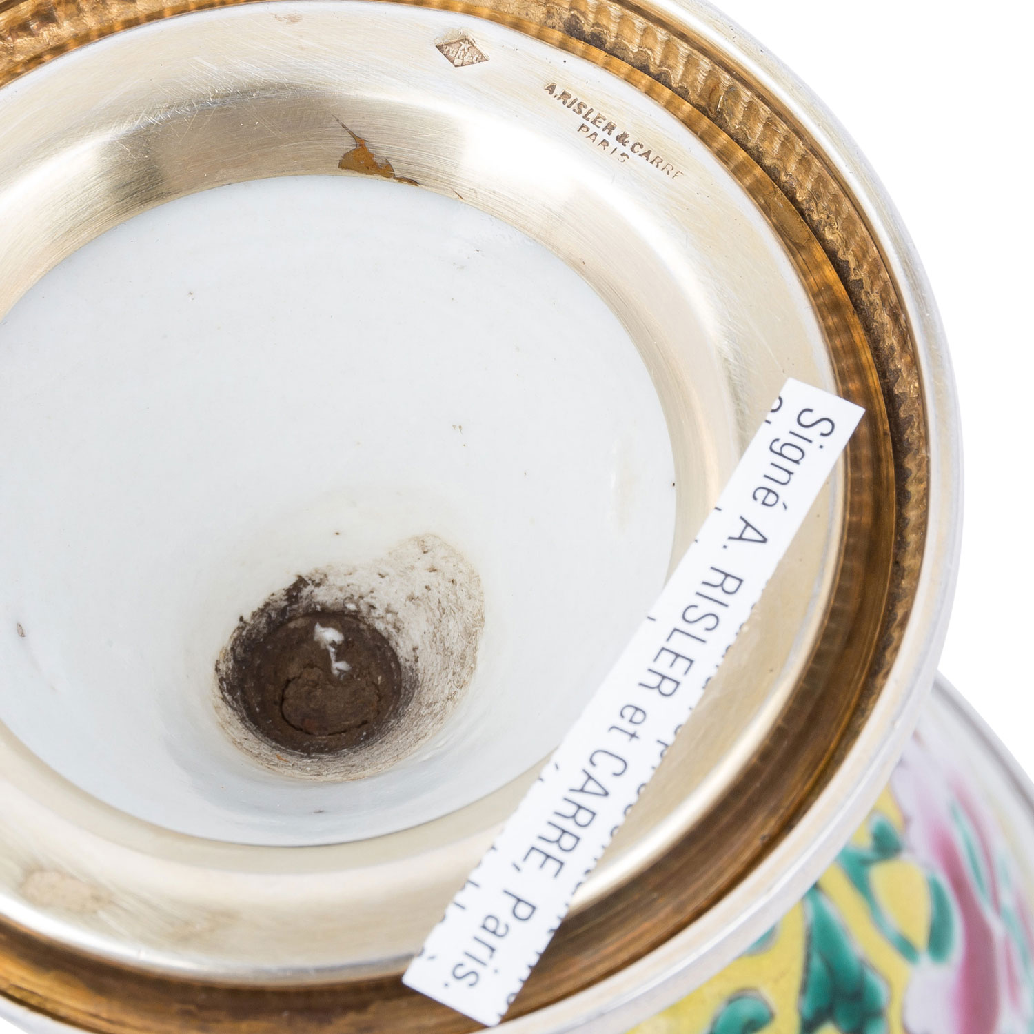 Am oberen Rand sowie am Standfuß mit Silbermontur, verso gepunzt 'Risler et Carre Paris' (1897-1912), H: 12,5 cm. Altersspuren.