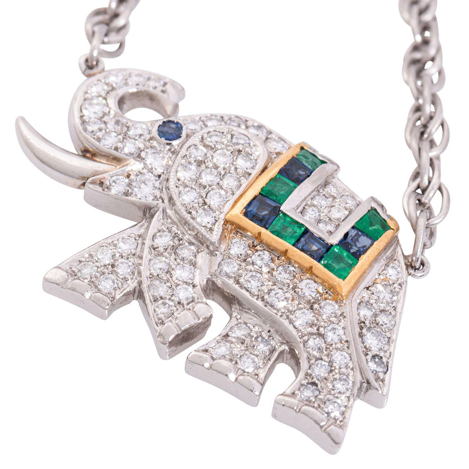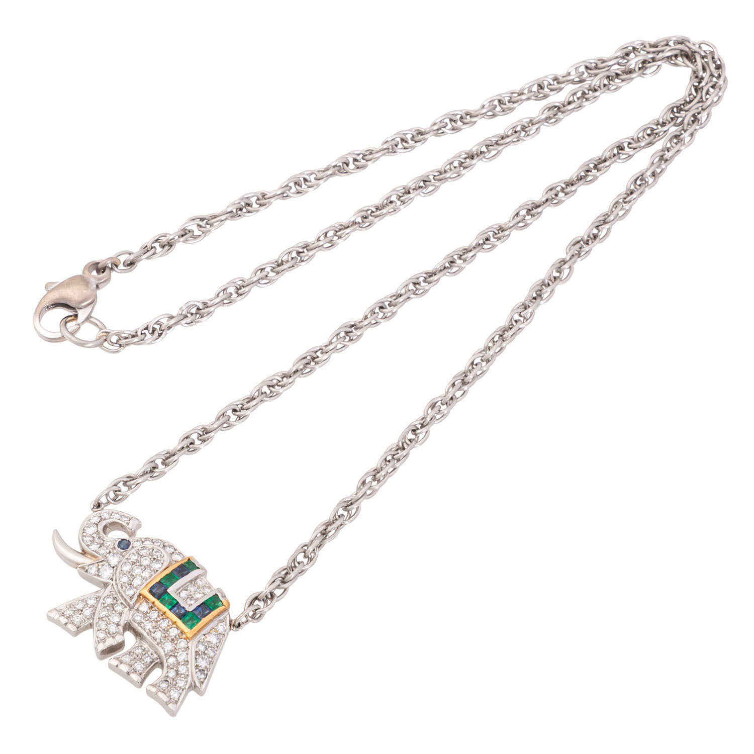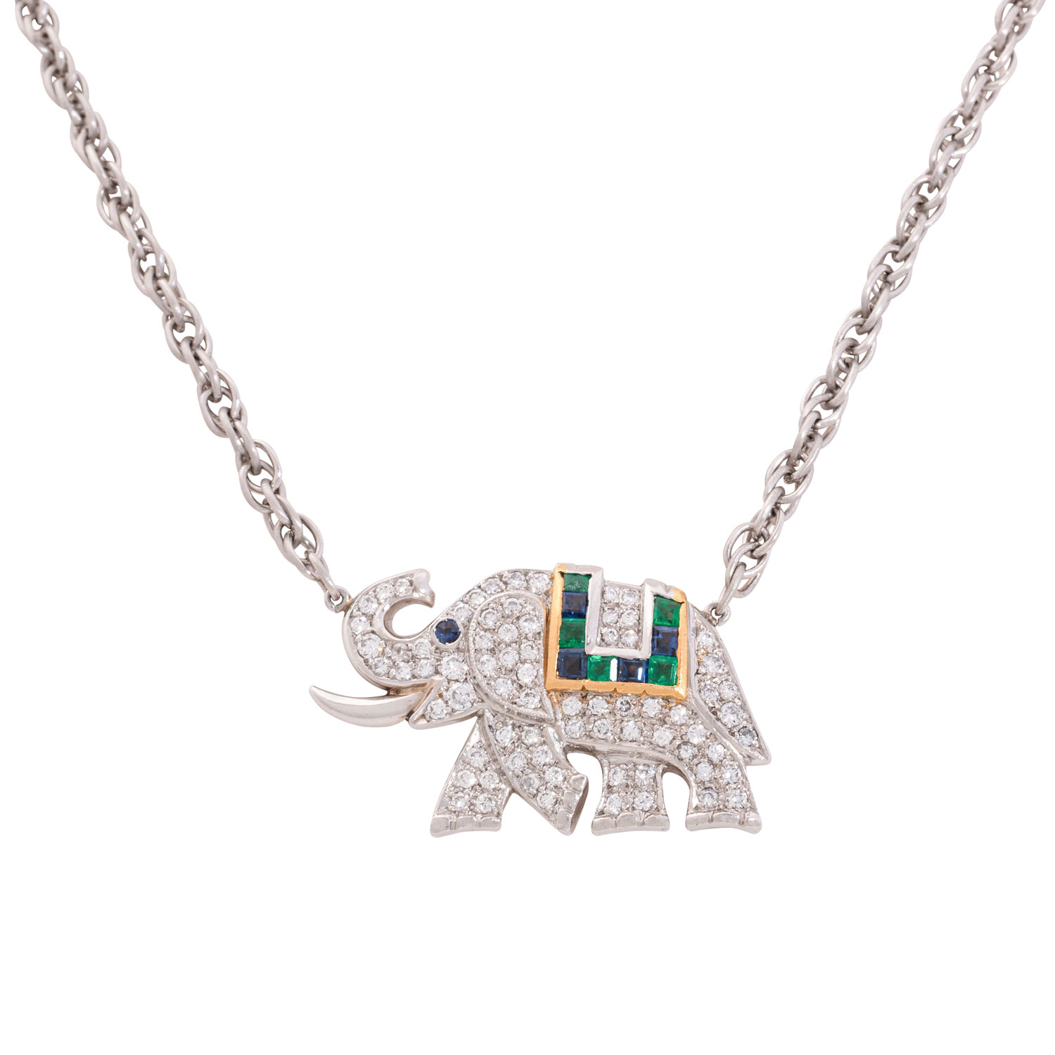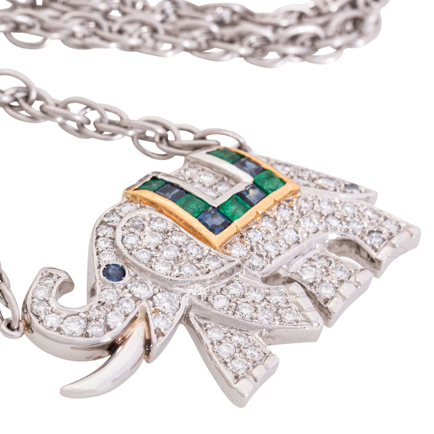 zus. ca. 0,80 ct, ca. WEISS (H)/SI, 1 Stein best., Pavé gefasst, Saphire und Smaragde im Carreéschliff, ca. 1,7 x 1,7 mm, 1 Saphir im Rundschliff, D: ca. 1,3 mm, Anhänger: PLATIN/GG, ca. 18,6 x 30,8 mm, Kette: PLATIN, L: ca. 45 cm, B: ca. 2,6 mm, teilw. mattiert, Karabiner und Öse: GG 18K, rhodiniert, mattiert, ges. Gewicht: 29,2 g, 20./21. Jh., Tragespuren.