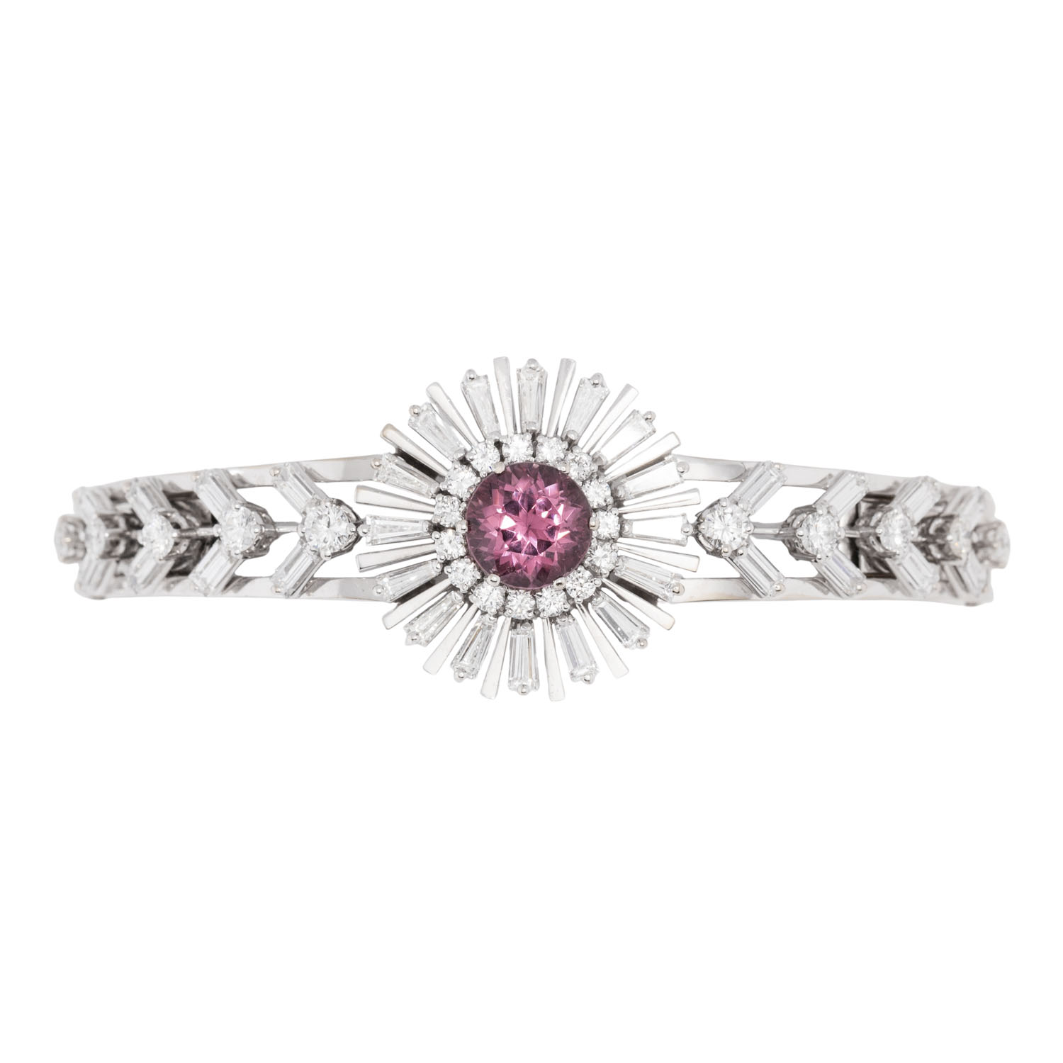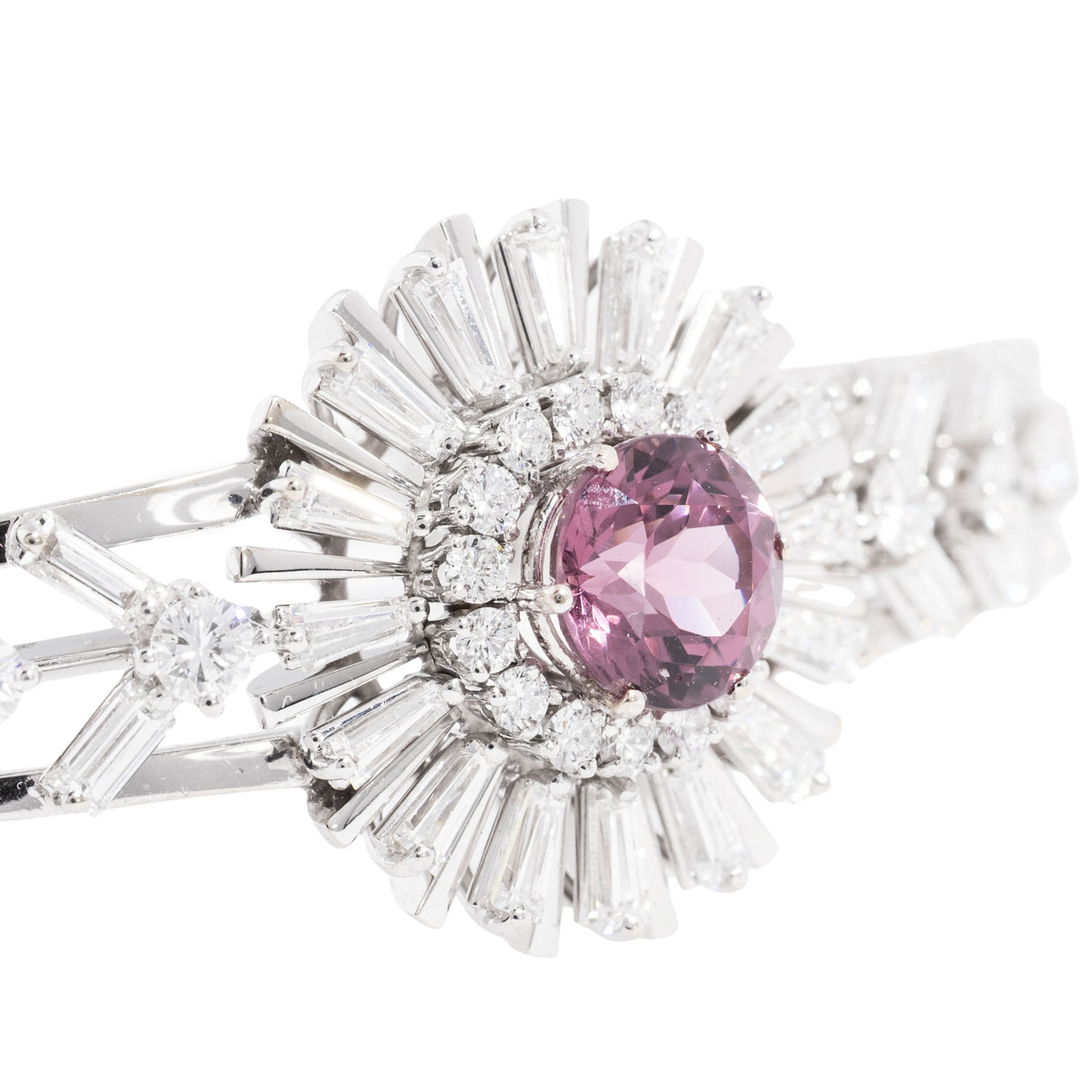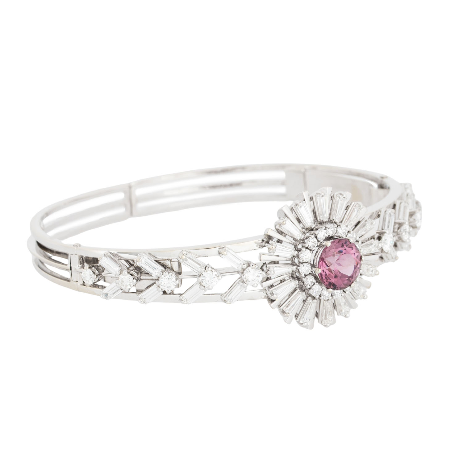 Sternschliff, umgeben von Diamanten im 25 Brillant-, 16 Bageutt- und 16 Trapezschliff von zus. 4,28 ct, FW (G)/VS-SI, WG 18K, 27,8 g, L: 18cm, WBW: 24.000 €, 20. Jh., guter Zustand. Juwelierqualität. DeGEB Zertifikat 18418 von 07/2025 anbei.