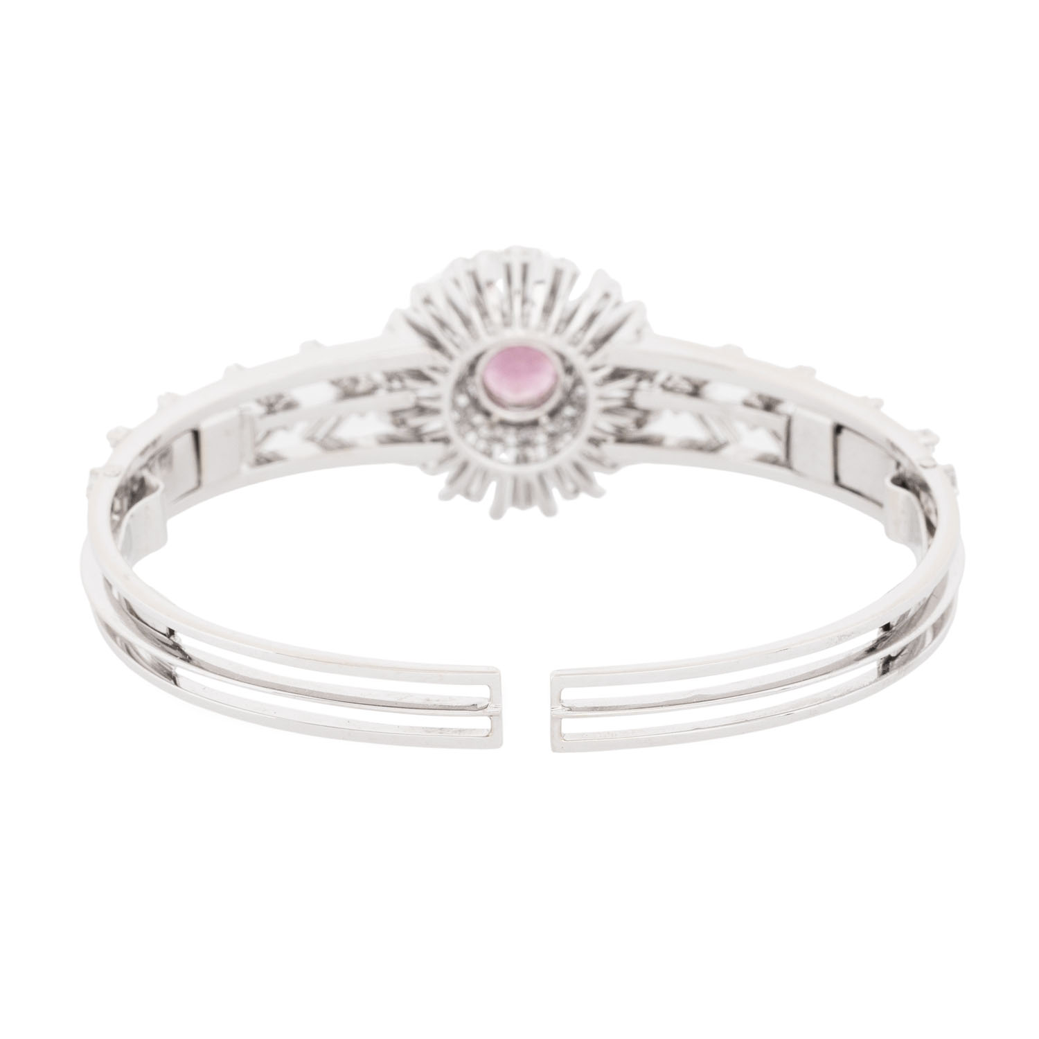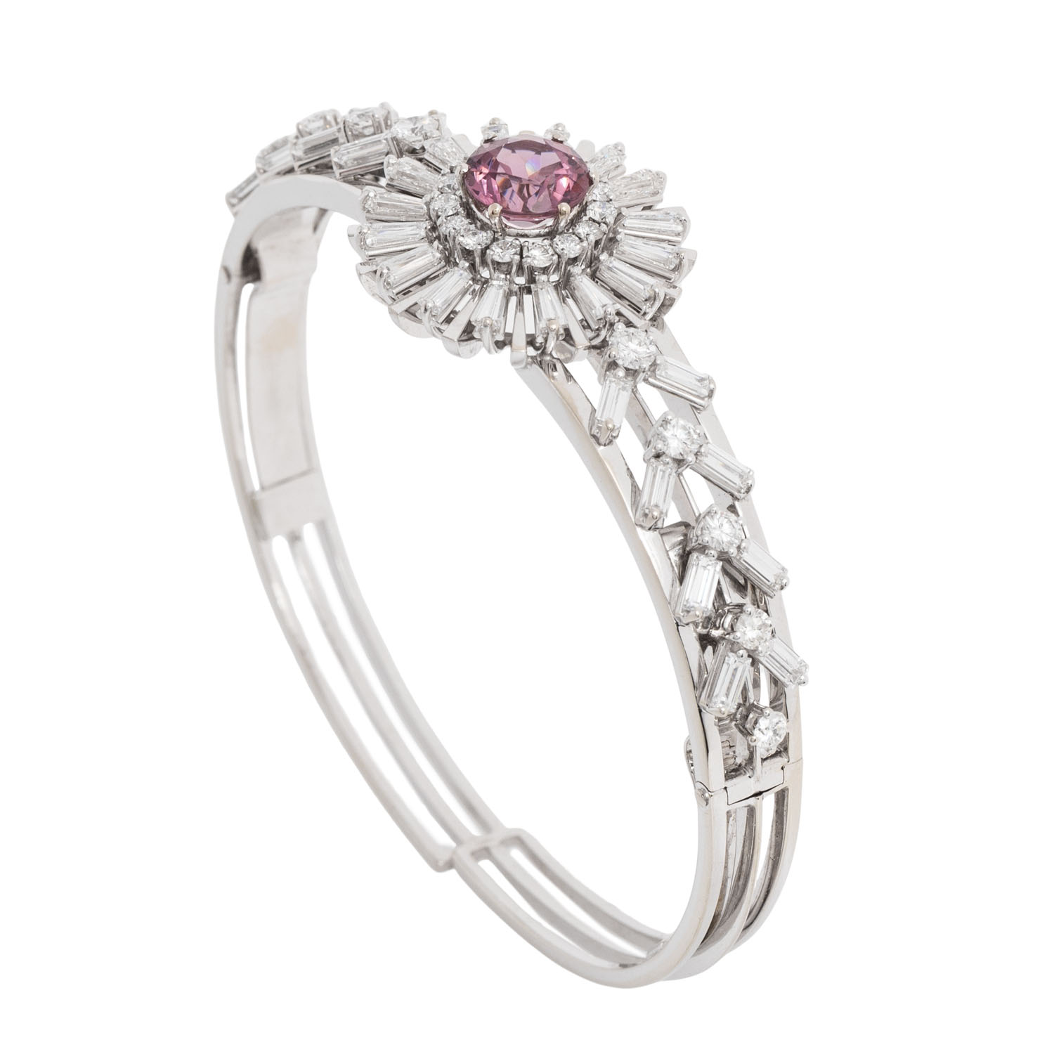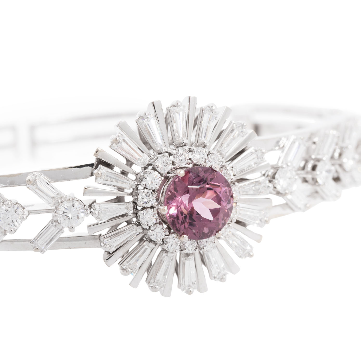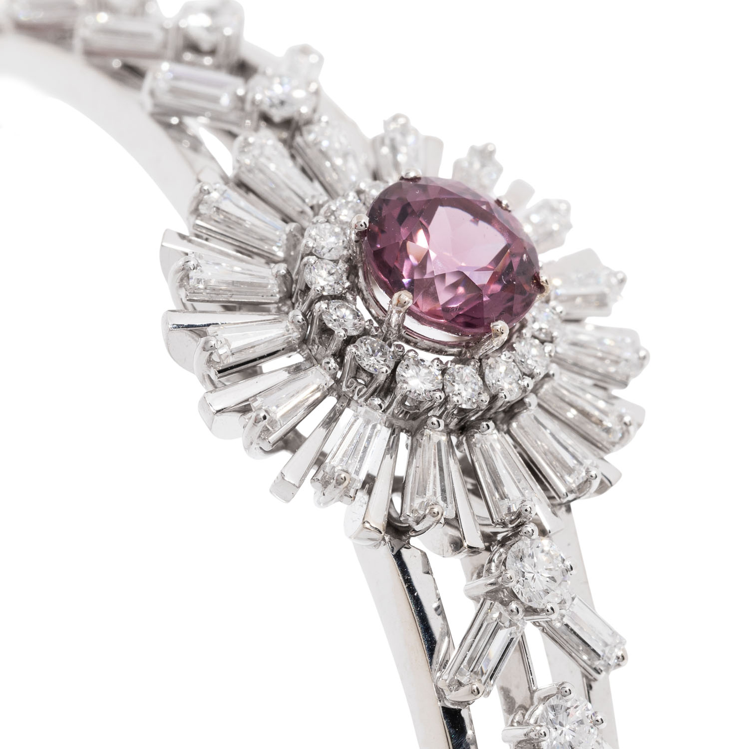 Sternschliff, umgeben von Diamanten im 25 Brillant-, 16 Bageutt- und 16 Trapezschliff von zus. 4,28 ct, FW (G)/VS-SI, WG 18K, 27,8 g, L: 18cm, WBW: 24.000 €, 20. Jh., guter Zustand. Juwelierqualität. DeGEB Zertifikat 18418 von 07/2025 anbei.