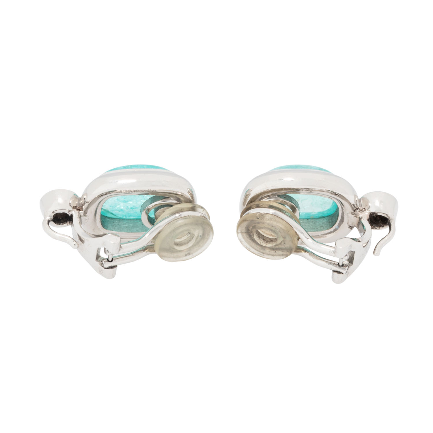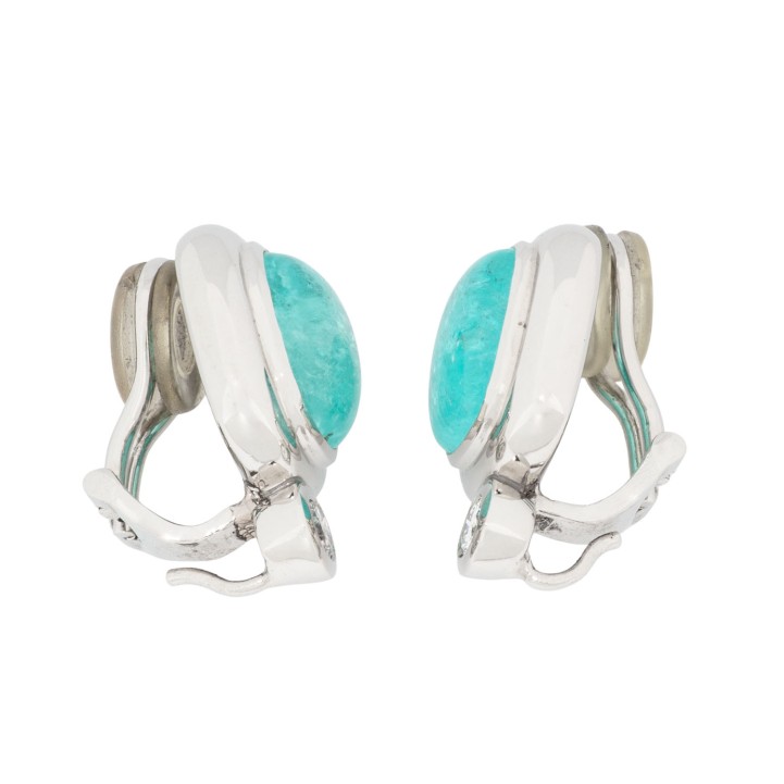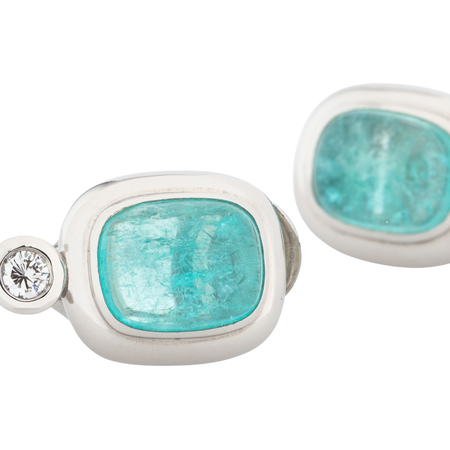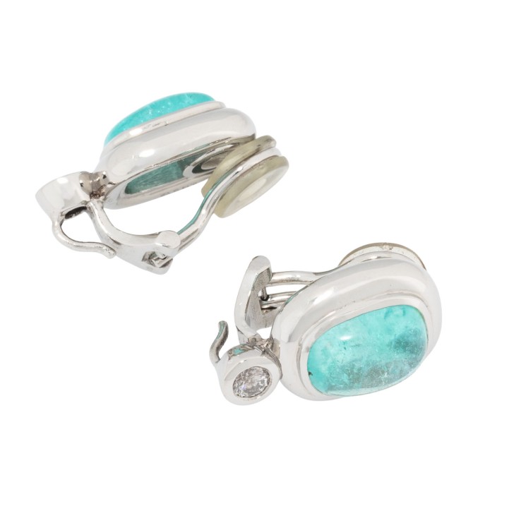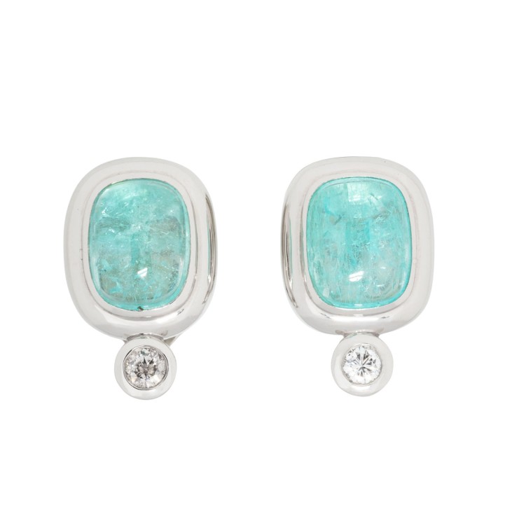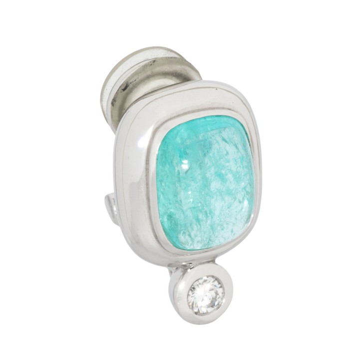 im Antik-Cabochonschliff, 6,71 ct. und 2 Brillanten zus. 0,27 ct., FW(G)/VSI, Platin 950, 18,5 g, mit verdeckten Einhängeösen.