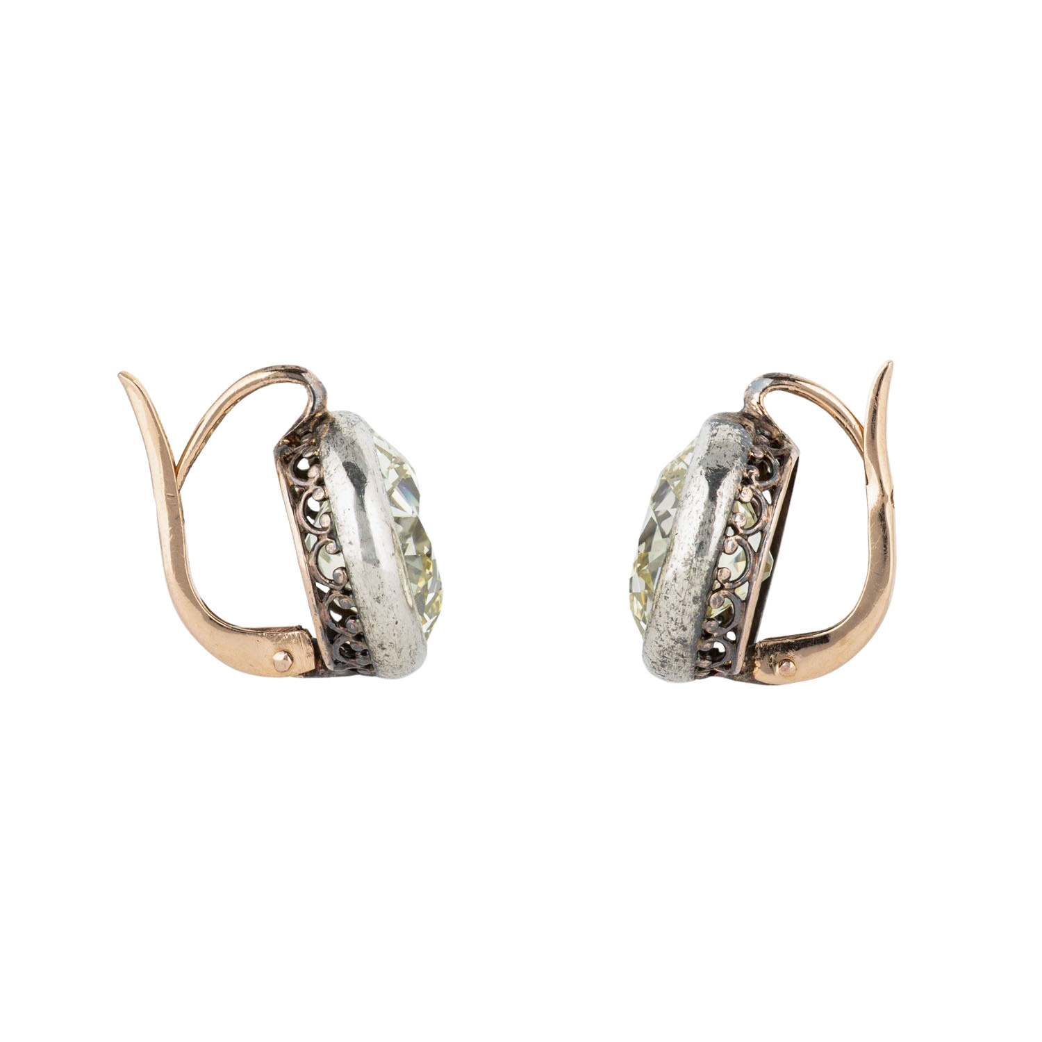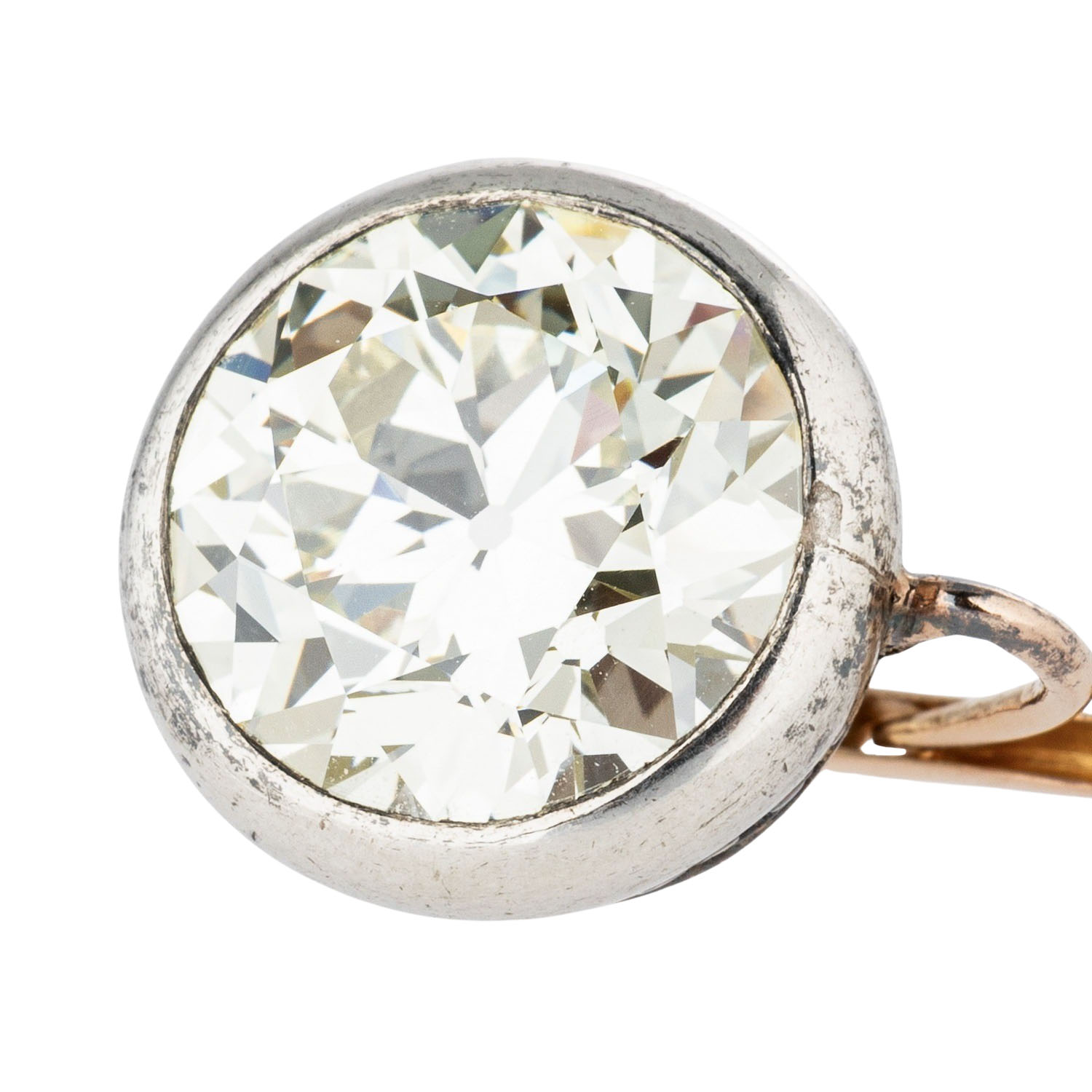 mit 2 Diamanten mit Altschliff zus. 9,80 ct, getöntes Weiß (L) VS1, RG 18 K, 5,17 g. Zargenfassung mit feiner Verzierung am Galerierand. Hochwertige Handarbeit.