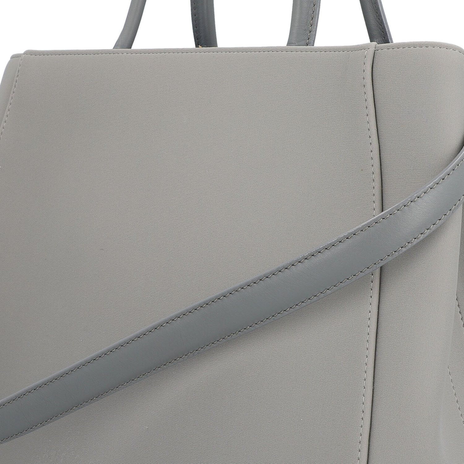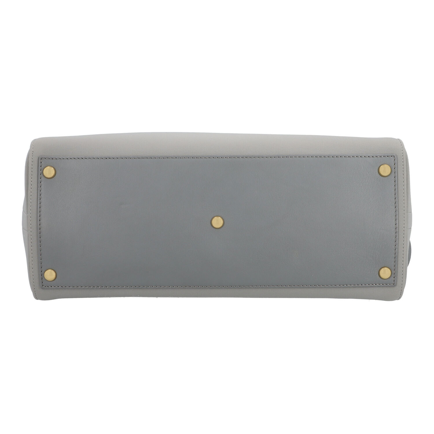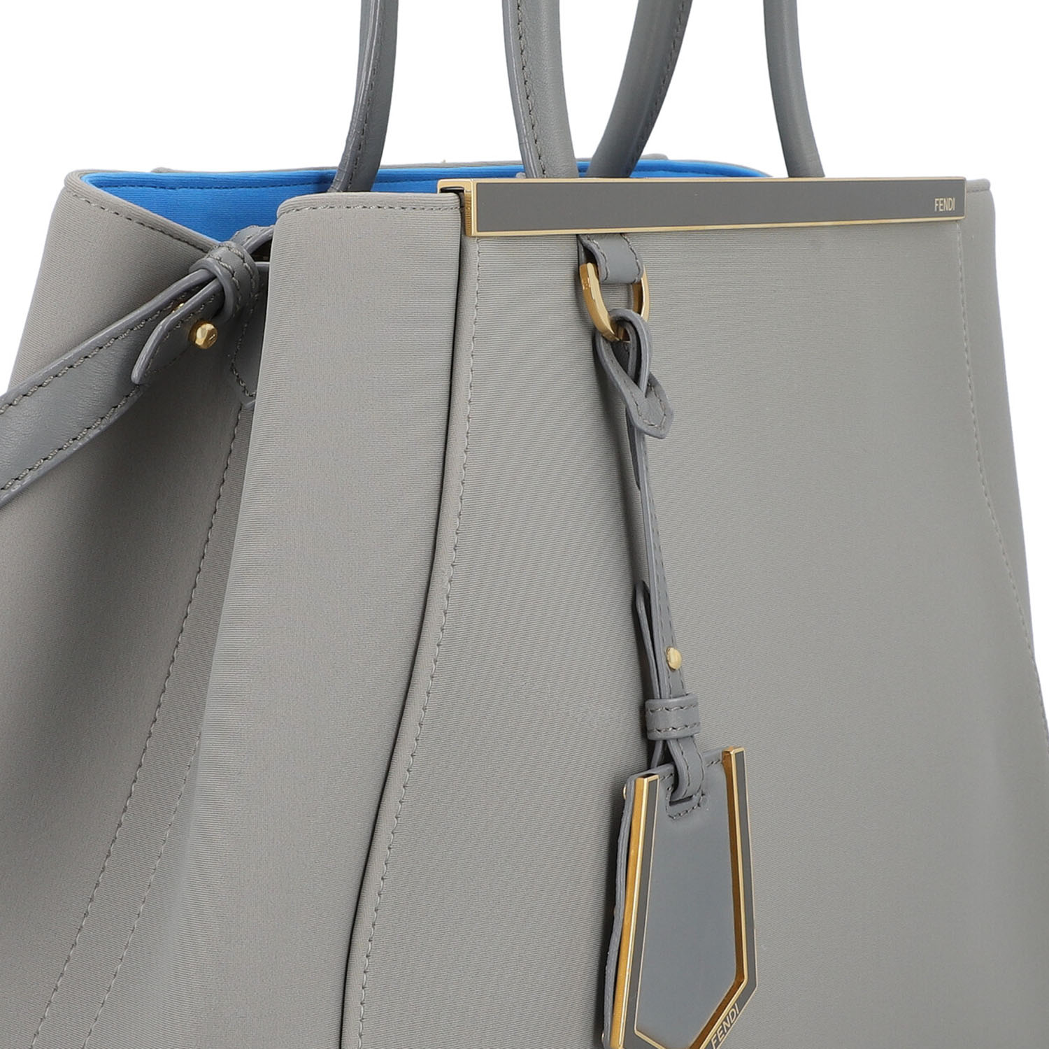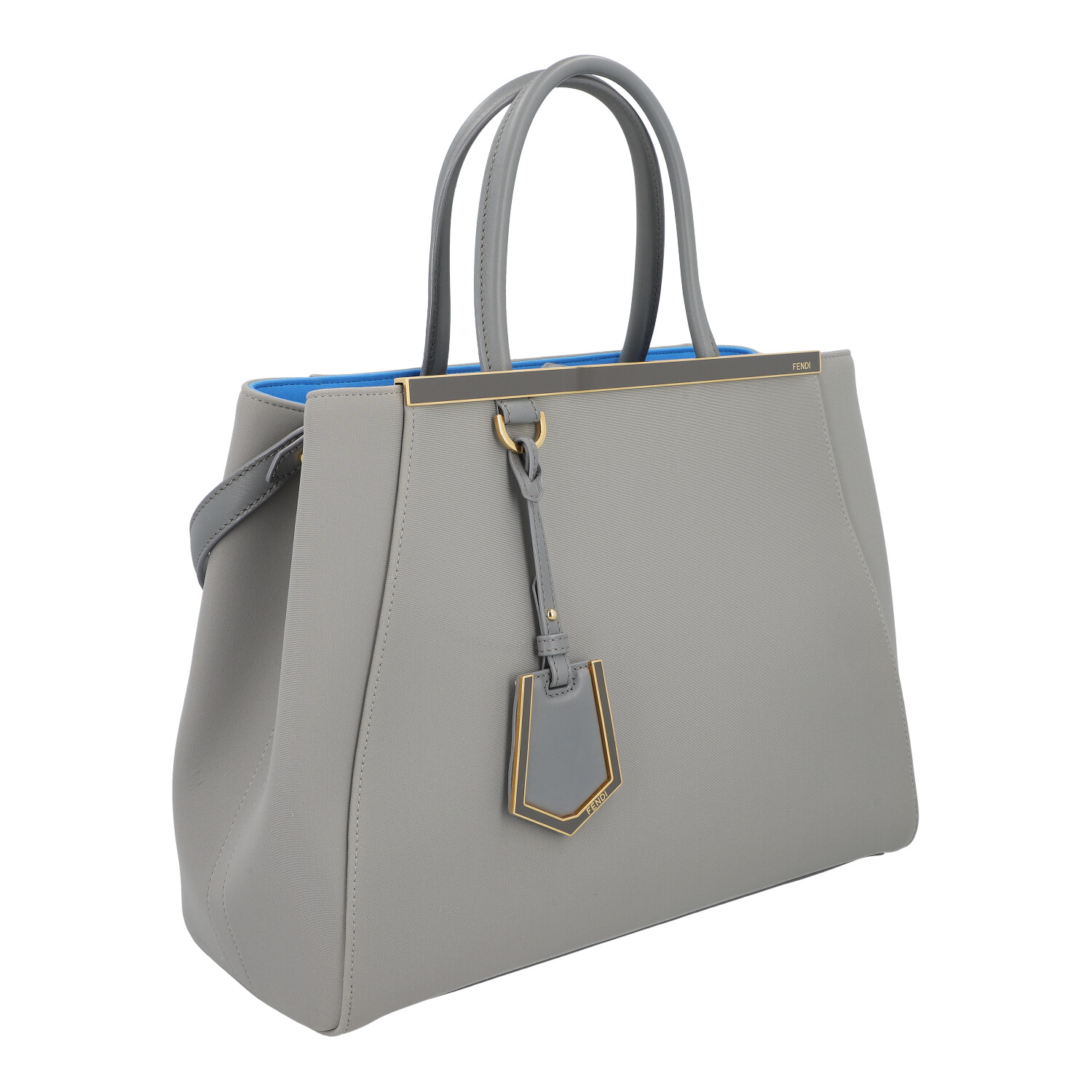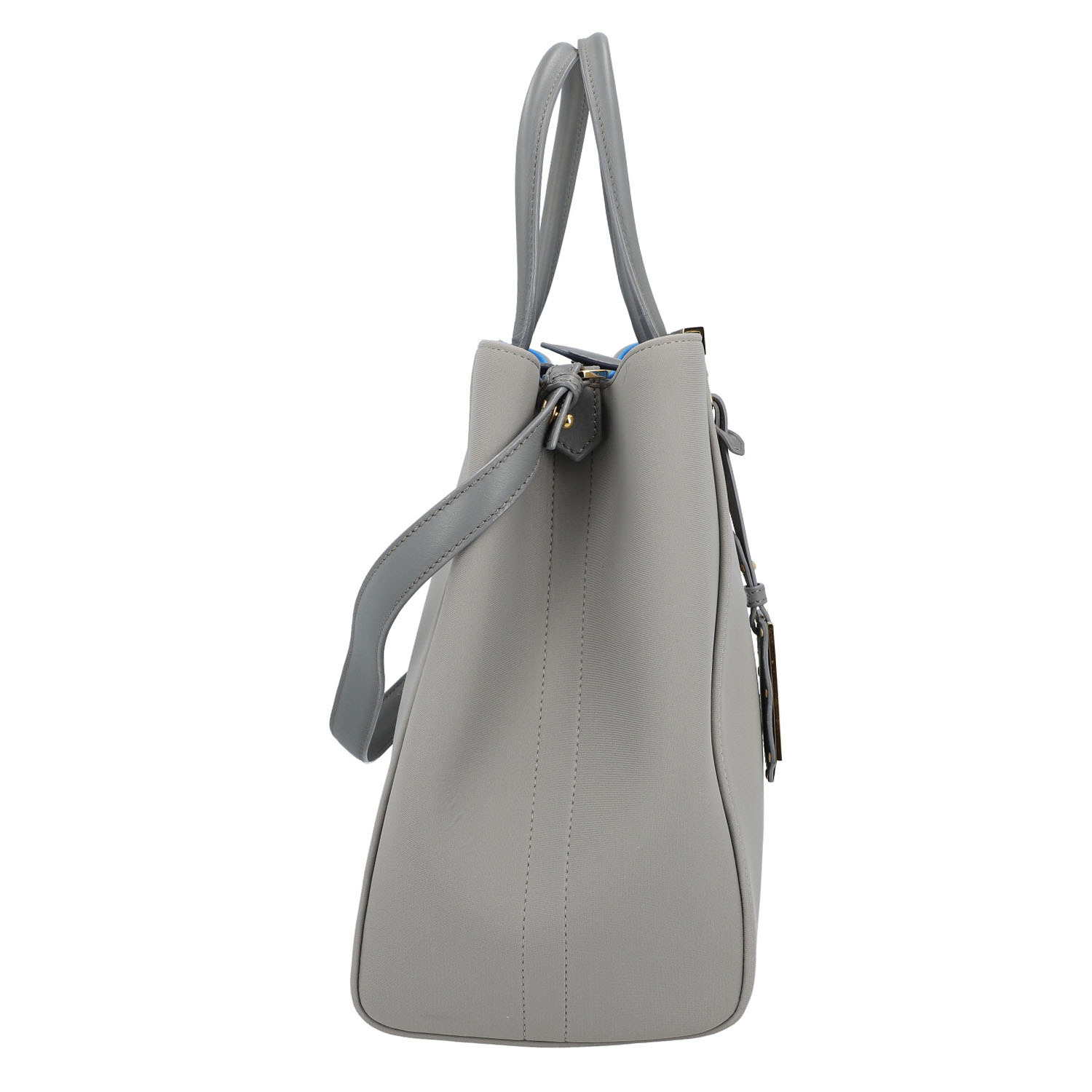 Korpus aus Textil in Hellgrau mit hellblauem Innenfutter und goldfarbener Hardware. Klassisches Modell mit Schulterriemen, Adressanhänger und Innenfach mit der Mitte. Leichter Abrieb und leichte Gebrauchsspuren vorhanden. 35,5x16x27cm.