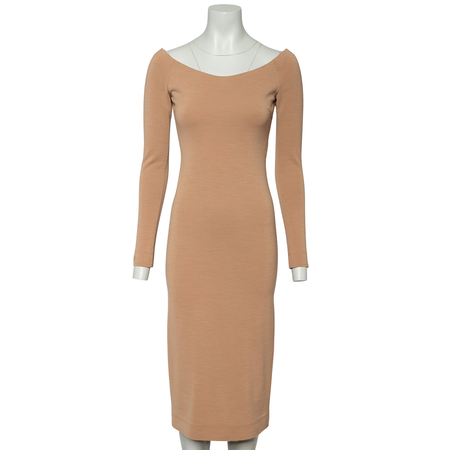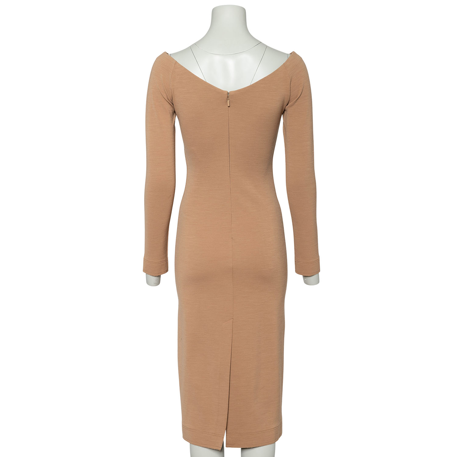 Off-Shoulder-Midi-Modell in Beige mit Reißverschluss und Schlitz im Rückenteil. Tragespuren vorhanden, Etikett teilweise entfernt.