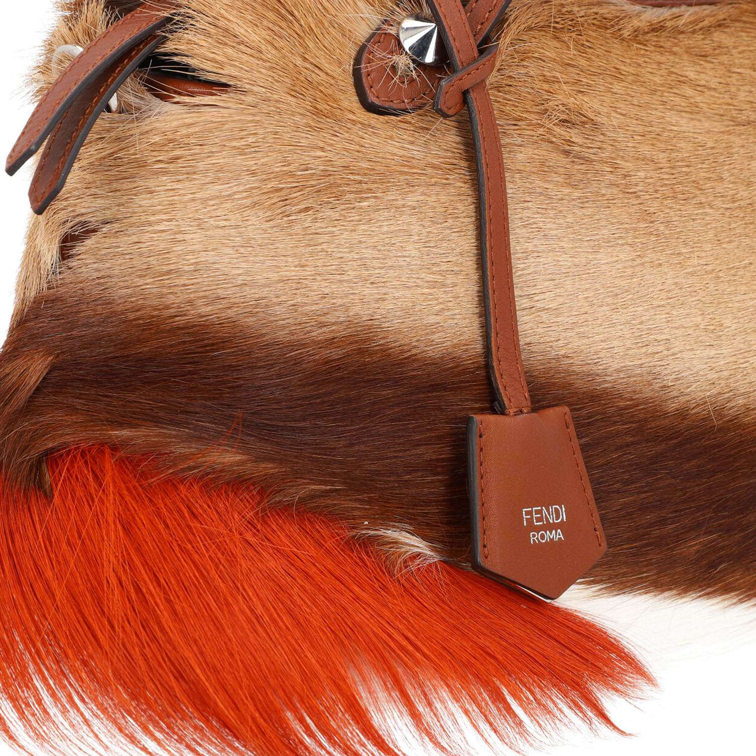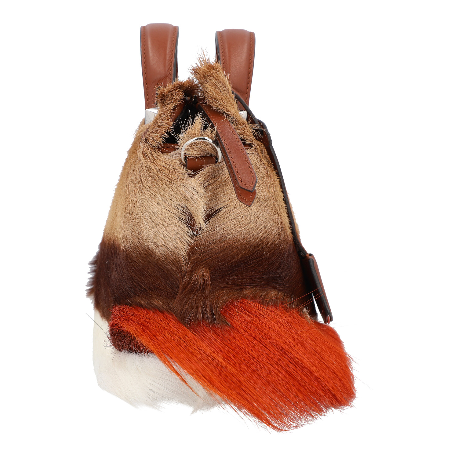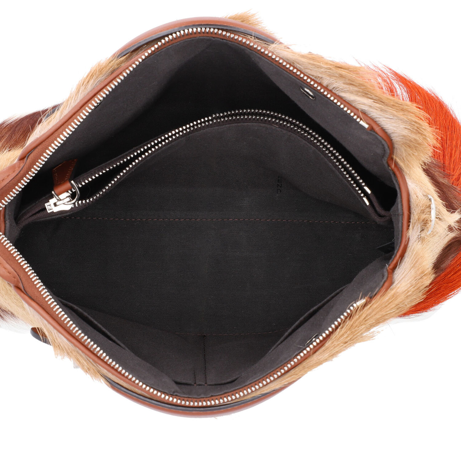 Fell mit Farbverlauf und orangefarbenem Detail, silberfarbener Hardware, Doppelhenkeln, Lederdetails, Reißverschluss, abnehmbarem Schulterriemen und Anhänger. Innenraum aus Textil mit drei Fächern, eines davon mit Reißverschluss.