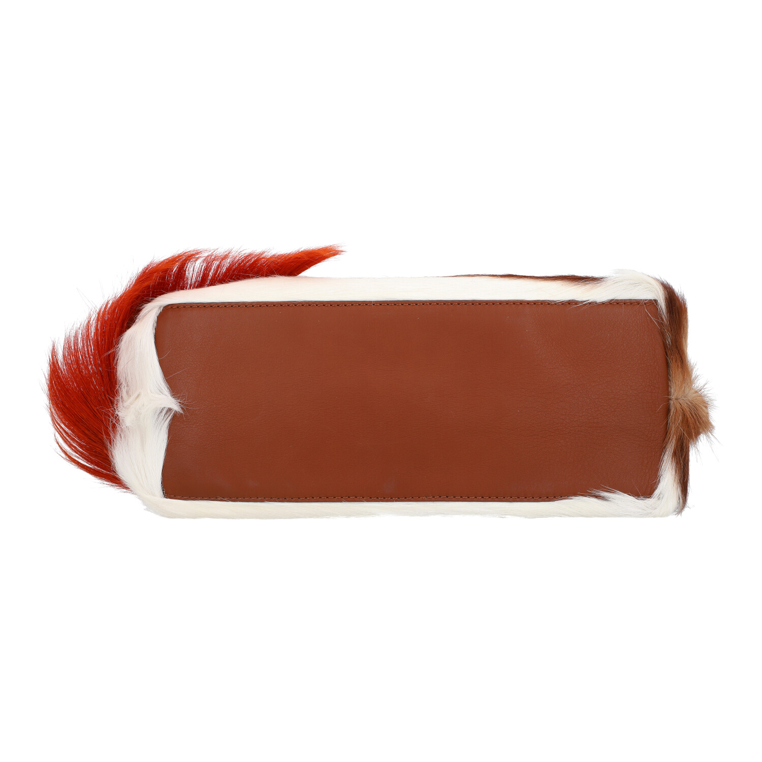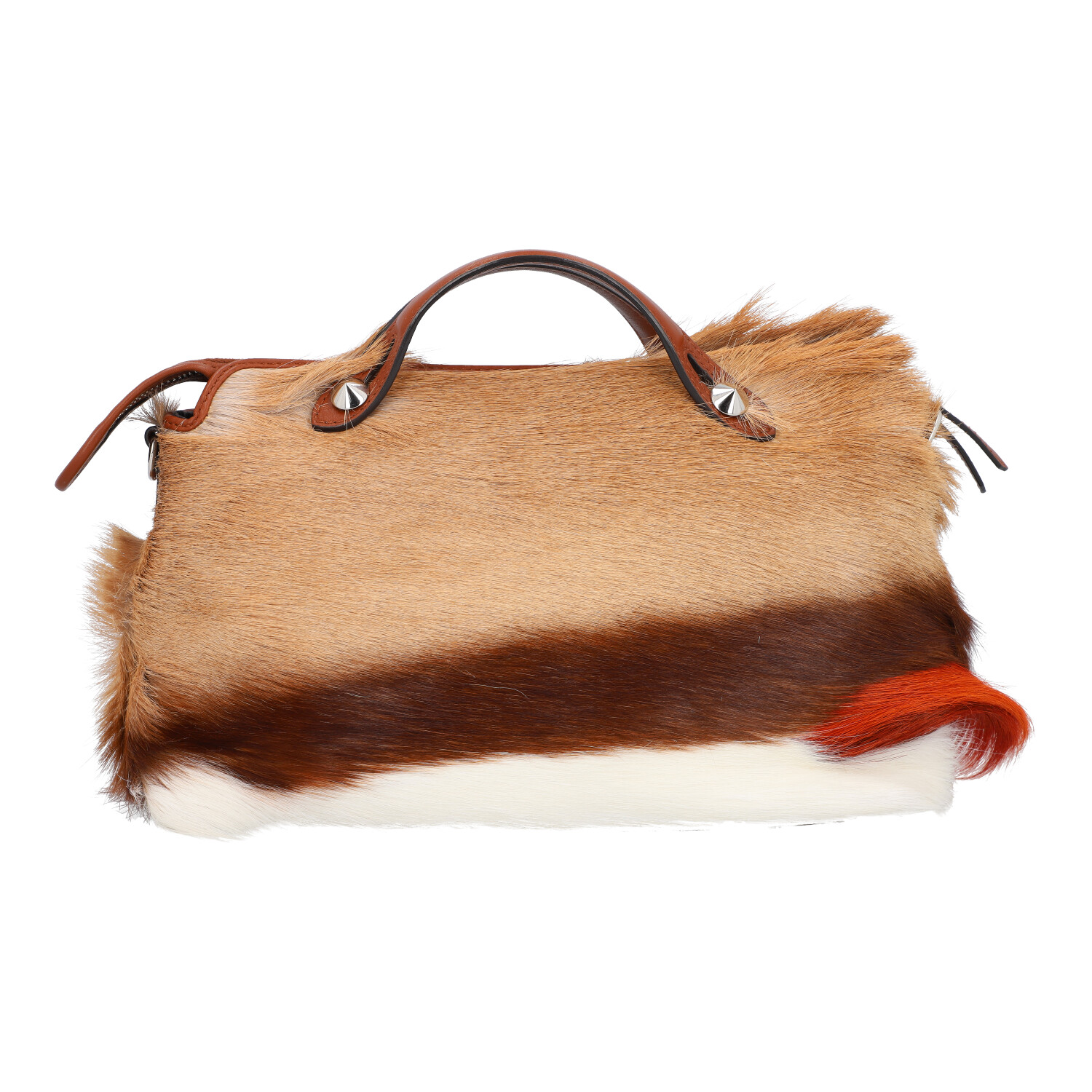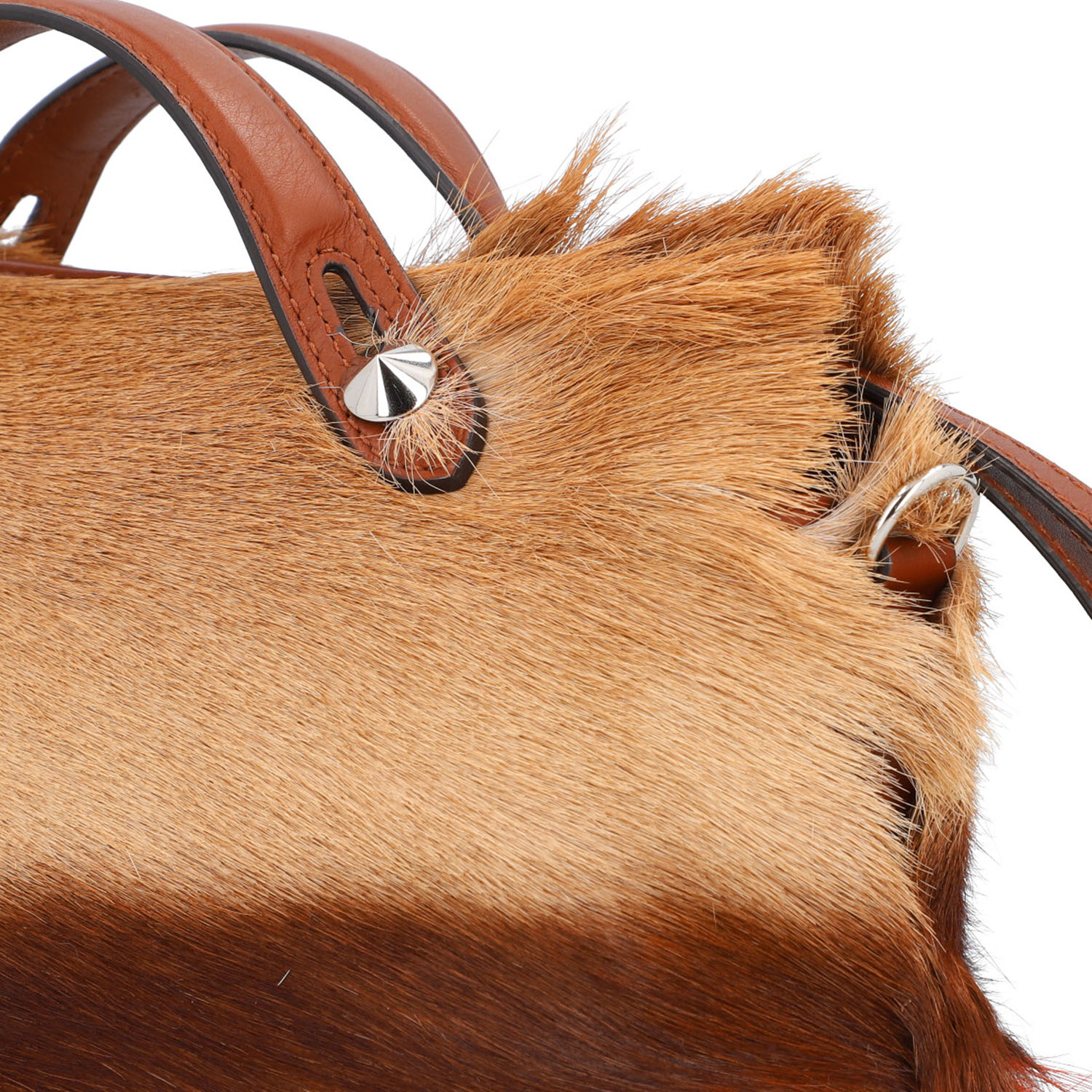 Fell mit Farbverlauf und orangefarbenem Detail, silberfarbener Hardware, Doppelhenkeln, Lederdetails, Reißverschluss, abnehmbarem Schulterriemen und Anhänger. Innenraum aus Textil mit drei Fächern, eines davon mit Reißverschluss.