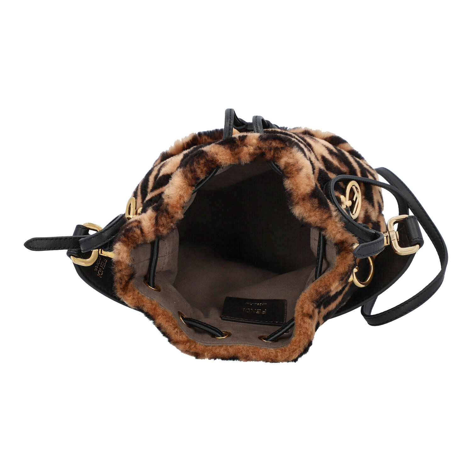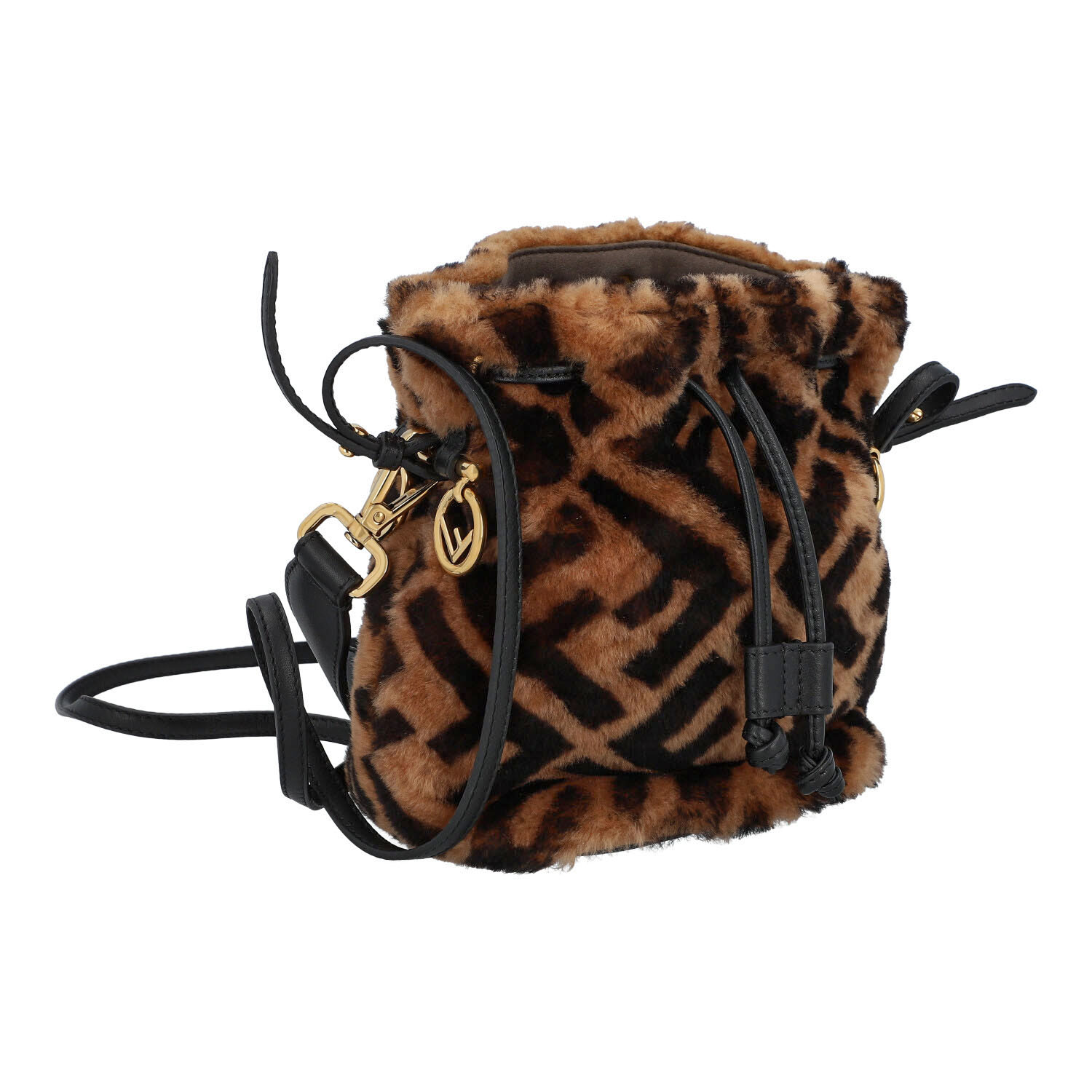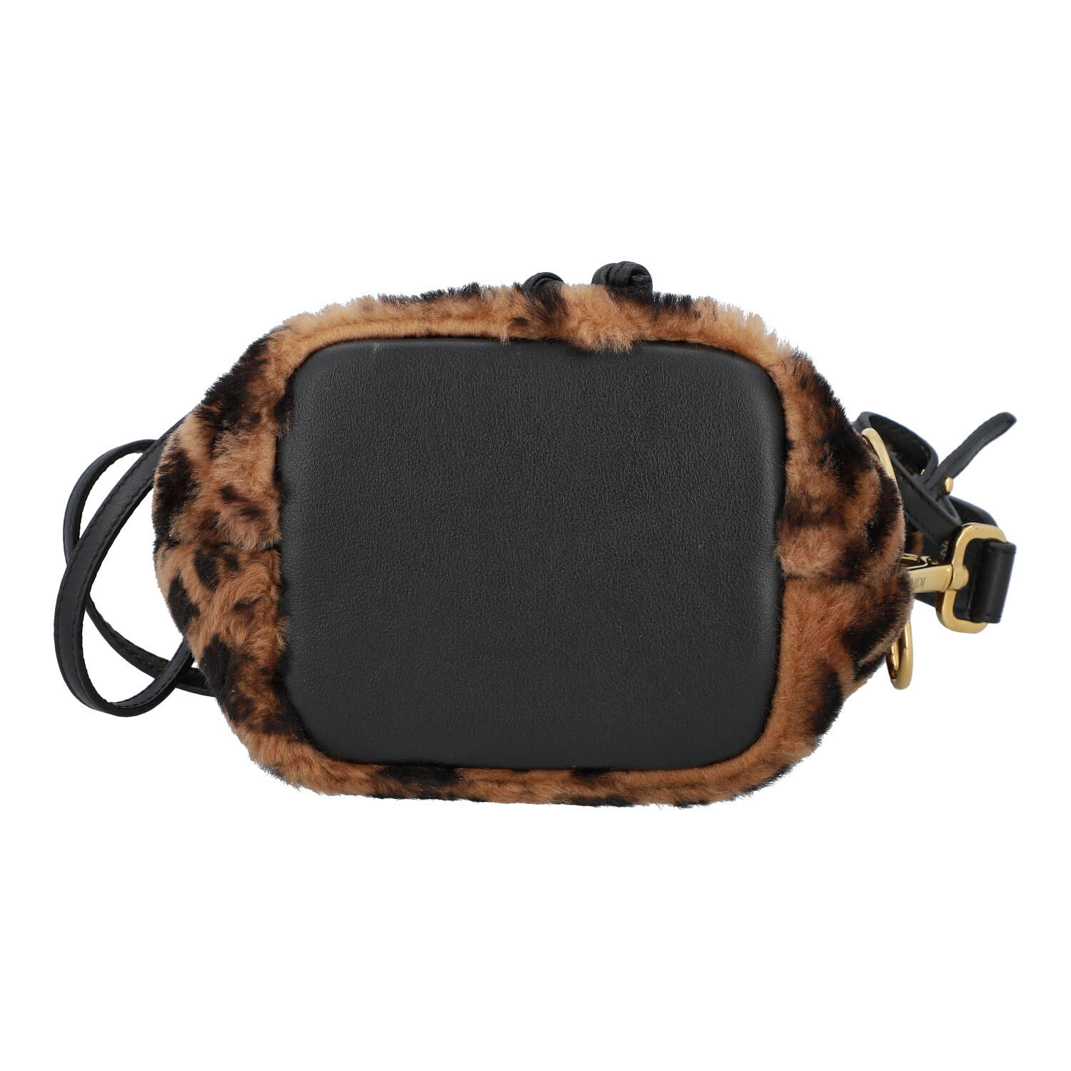 Kunstfell in Braun mit schwarzem Zucca-Design, goldfarbener Hardware, Details aus schwarzem Leder, Zugband als Verschluss, abnehmbarer Schulterriemen und Logoanhänger seitlich. Staubbeutel anbei. Lagergeruch vorhanden. 12 x 10,5 x 17 cm.