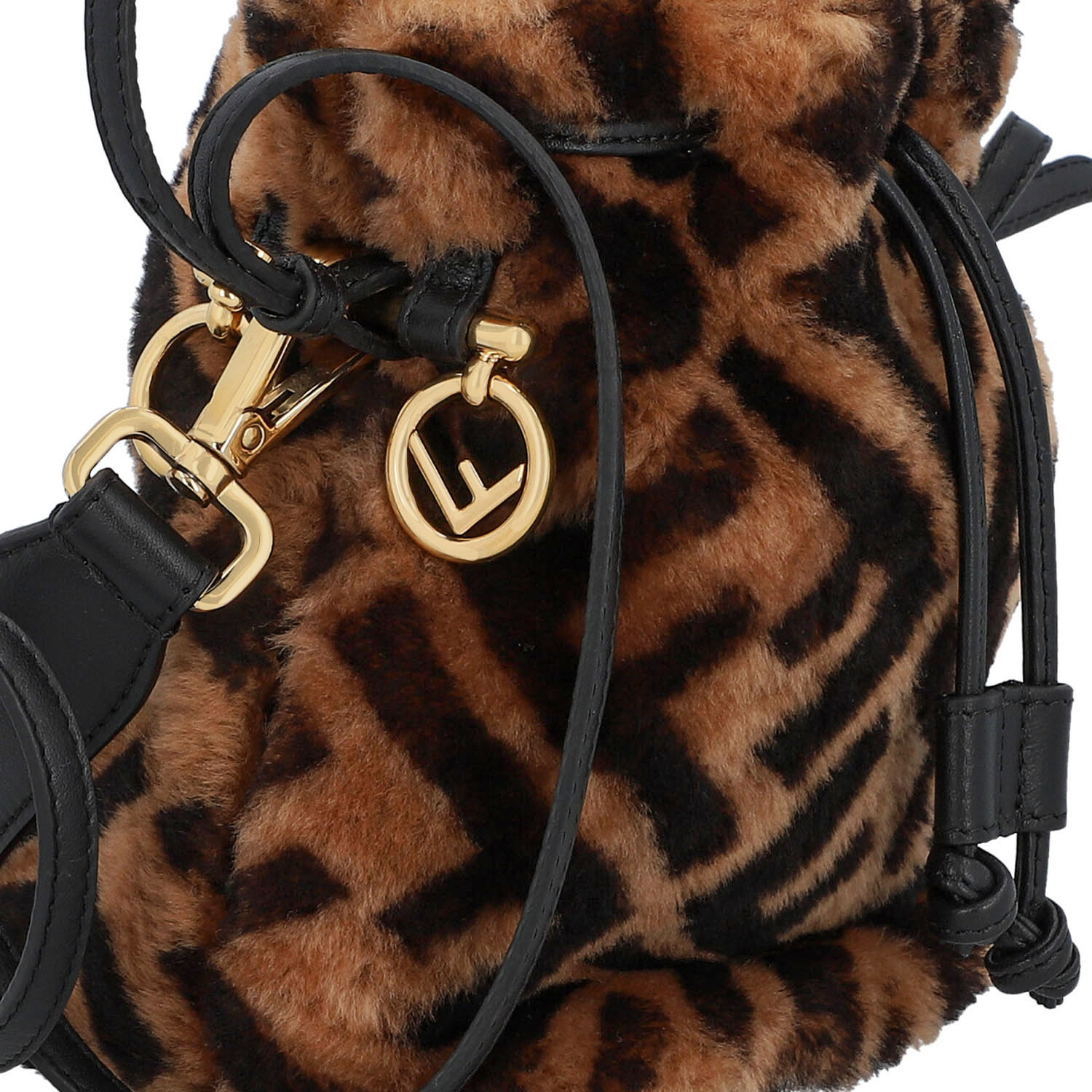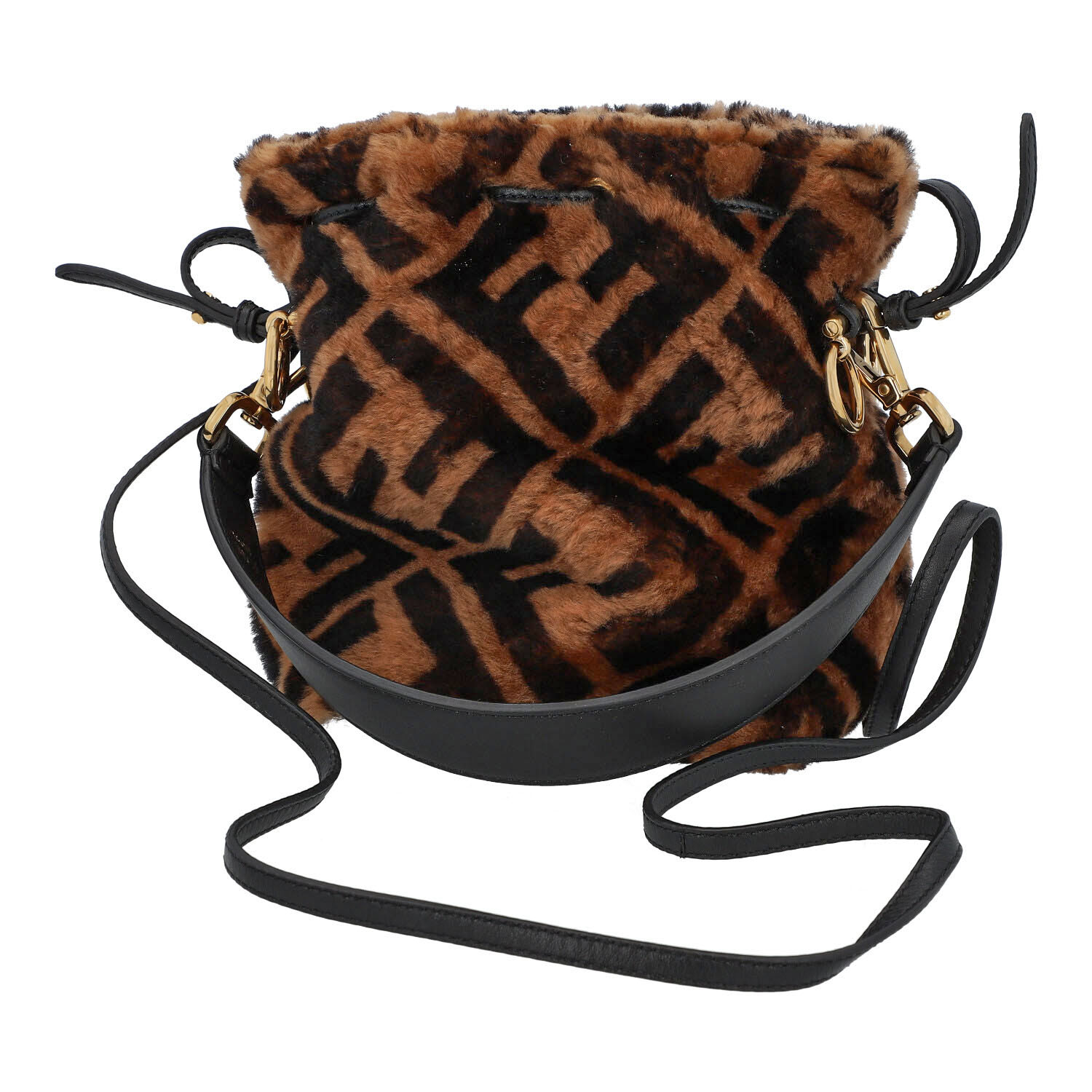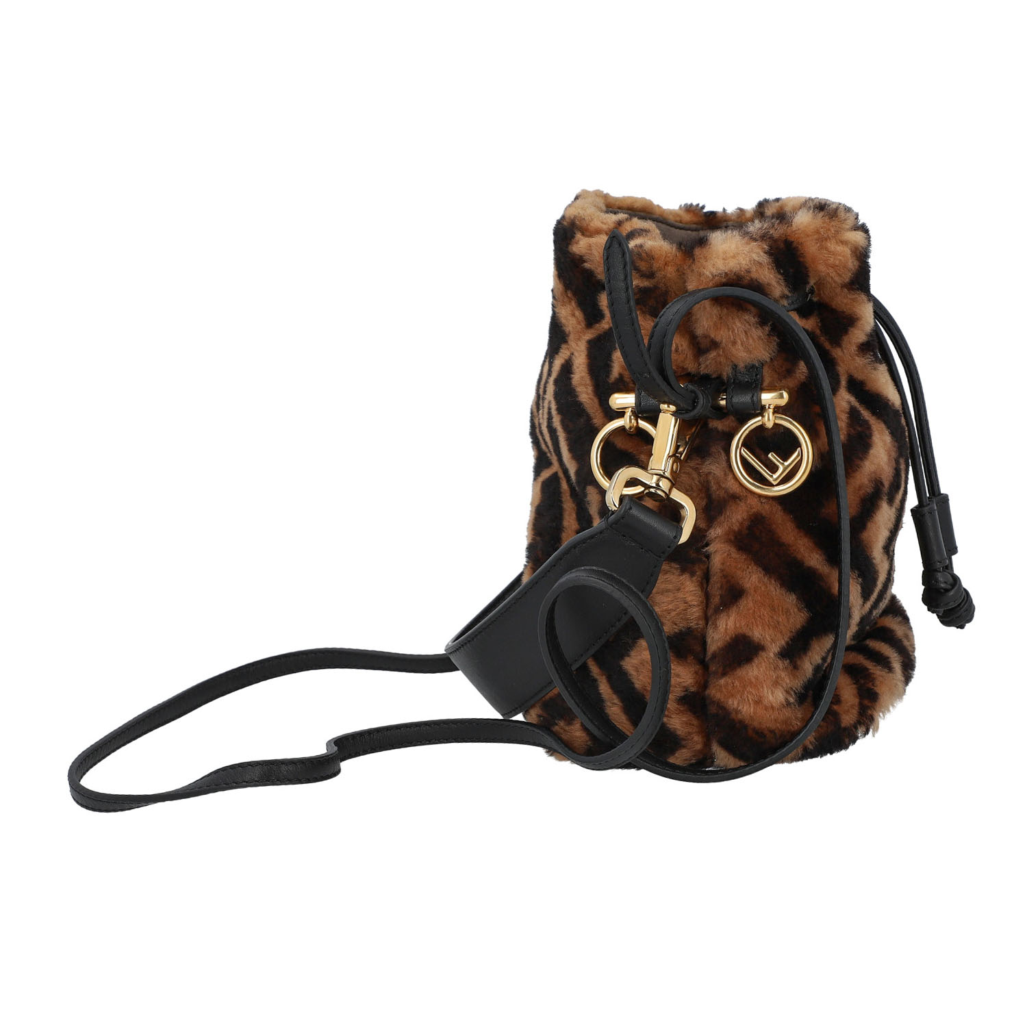 Kunstfell in Braun mit schwarzem Zucca-Design, goldfarbener Hardware, Details aus schwarzem Leder, Zugband als Verschluss, abnehmbarer Schulterriemen und Logoanhänger seitlich. Staubbeutel anbei. Lagergeruch vorhanden. 12 x 10,5 x 17 cm.