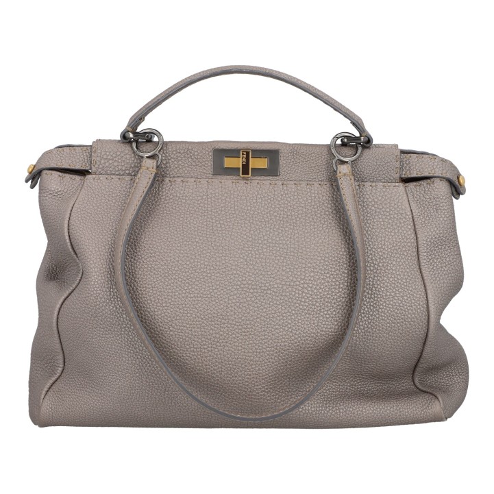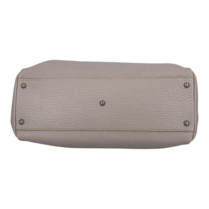 Silberfarbenes Leder mit bicolorfarbener Hardware, einem Henkel und beidseitigem Drehverschluss. Innenraum aus Canvas mit einem Reißverschlussfach. Staubbeutel anbei. Leichter Abrieb an den Kanten. 40 x 15 x 31 cm.