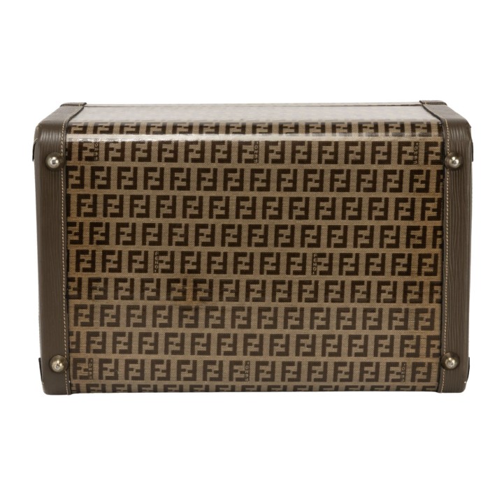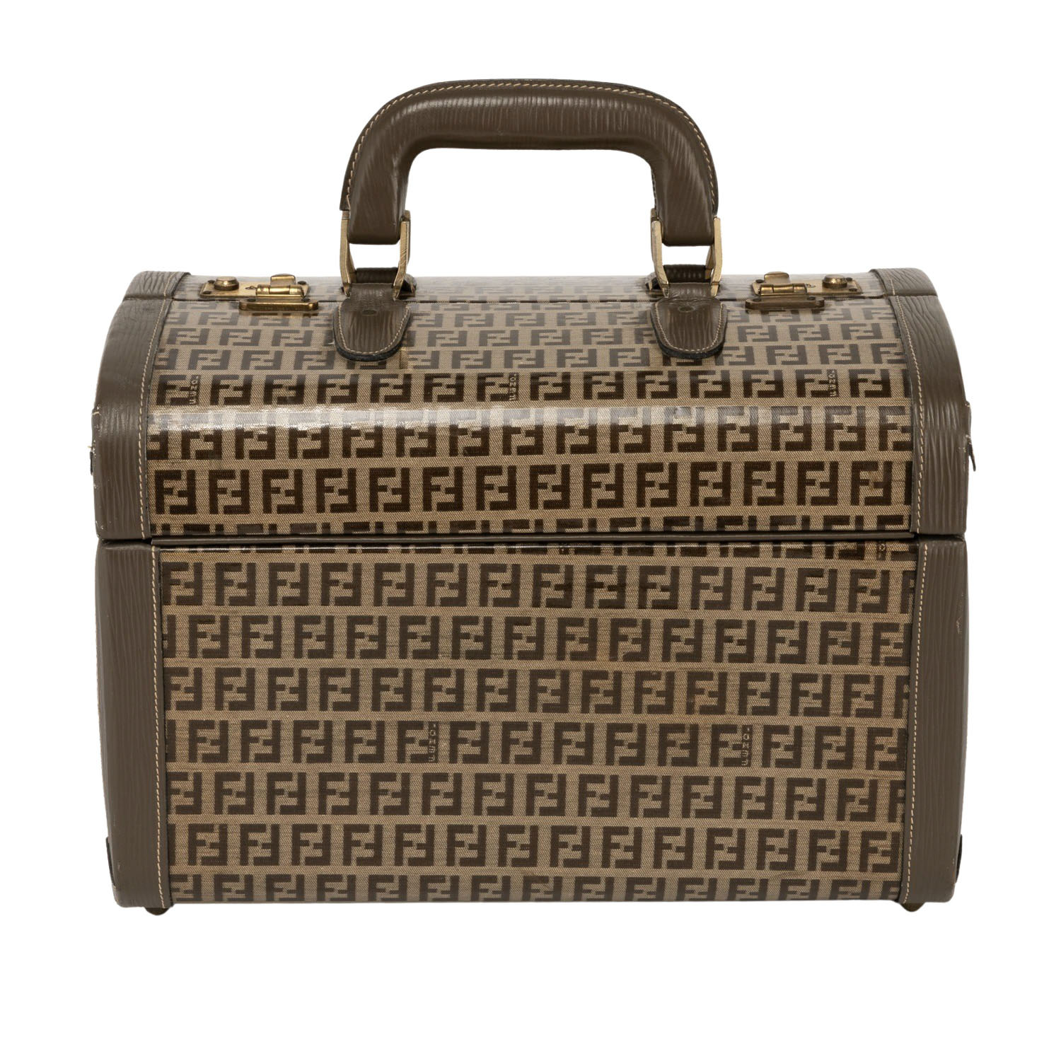 Ende 80er, frühe 90er Jahre. FF Zucca-Monogram mit Beschlägen aus Leder in Braun, Messing-Hardware, Innenleben mit Zucca-Monogram ausgestattet und Lederlaschen. Klassische Altersspuren vorhanden, Beshläge an den Kanten lösen sich leicht. 32x21x23cm.