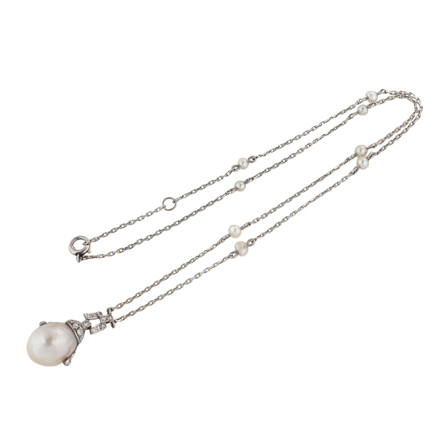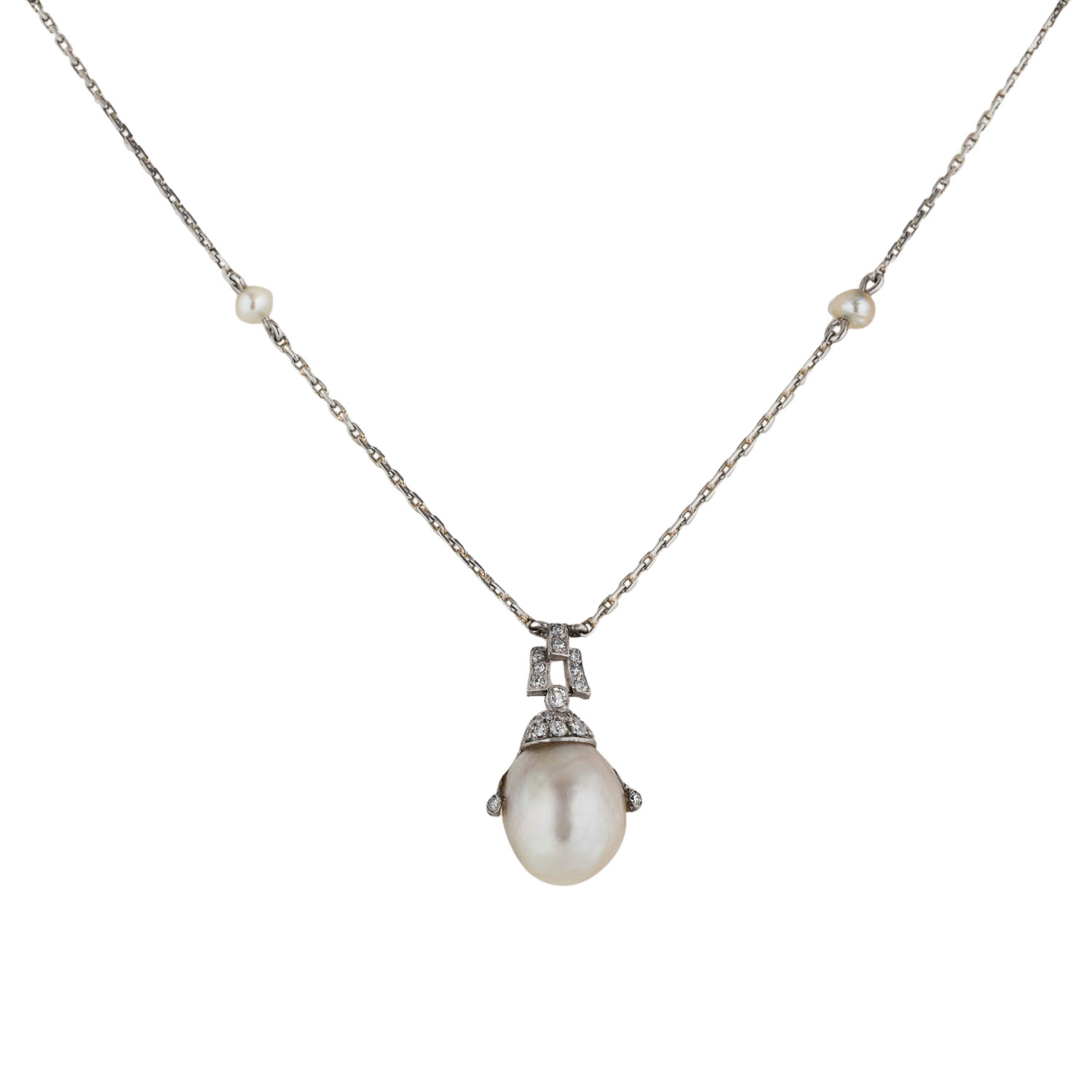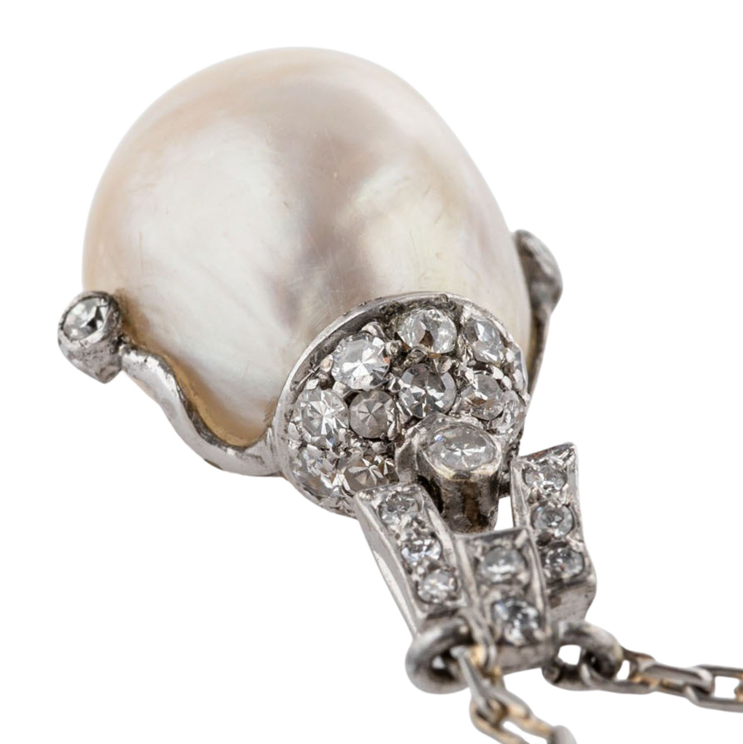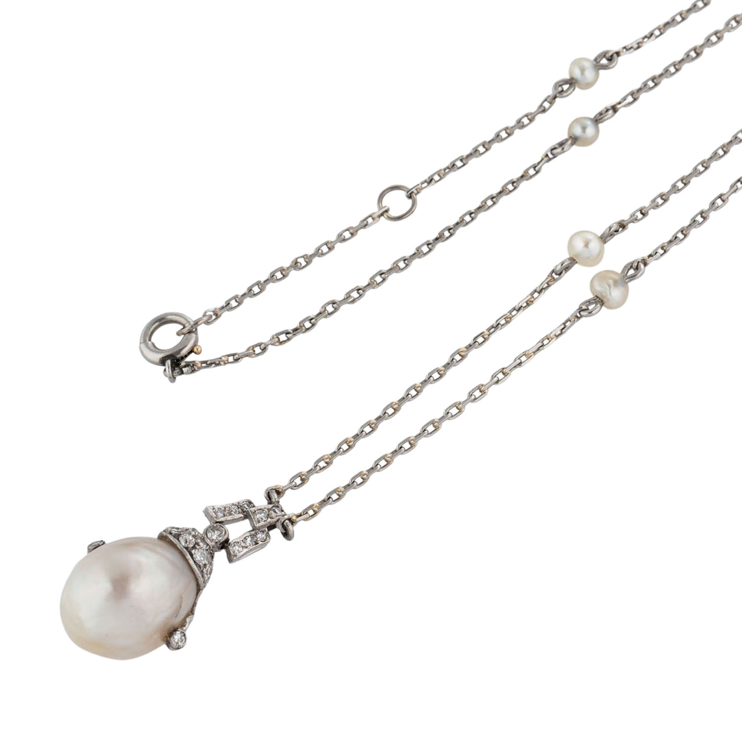 von ca. 9,5 mm Durchmeser sowie kleinen Perlen und kleinen Diamanten von zus. ca. 0,20 ct, verschiedene Qualitäten, Platin, 6,4 g, Kettenlänge 39 cm, 1920er Jahre, sehr guter altersgemäßer Zustand, inkl. DSEF Testbericht zur Perle.