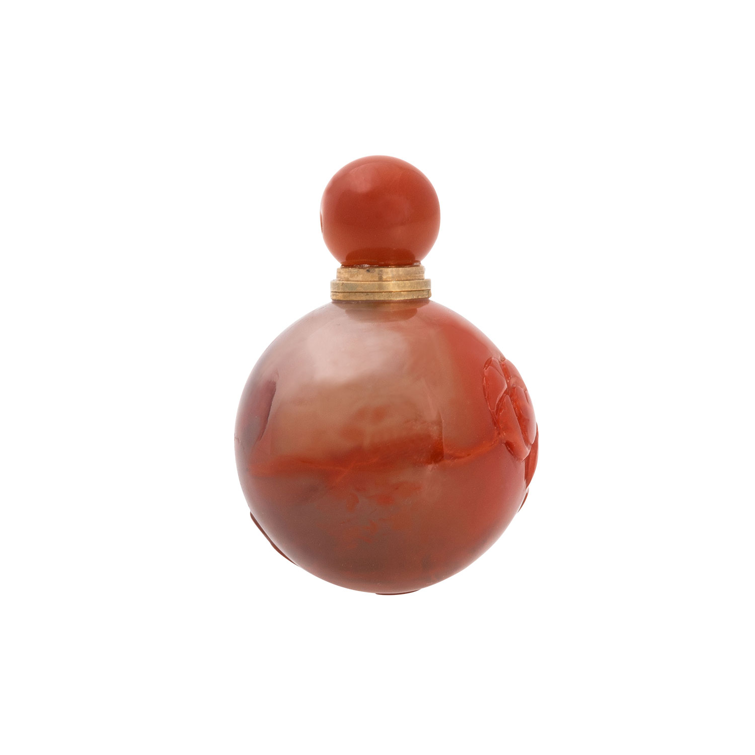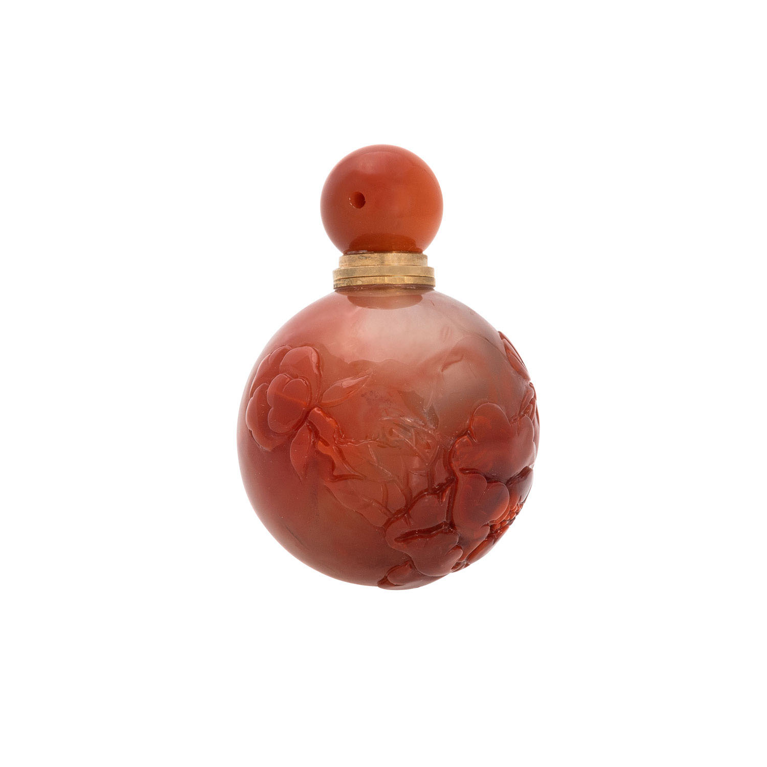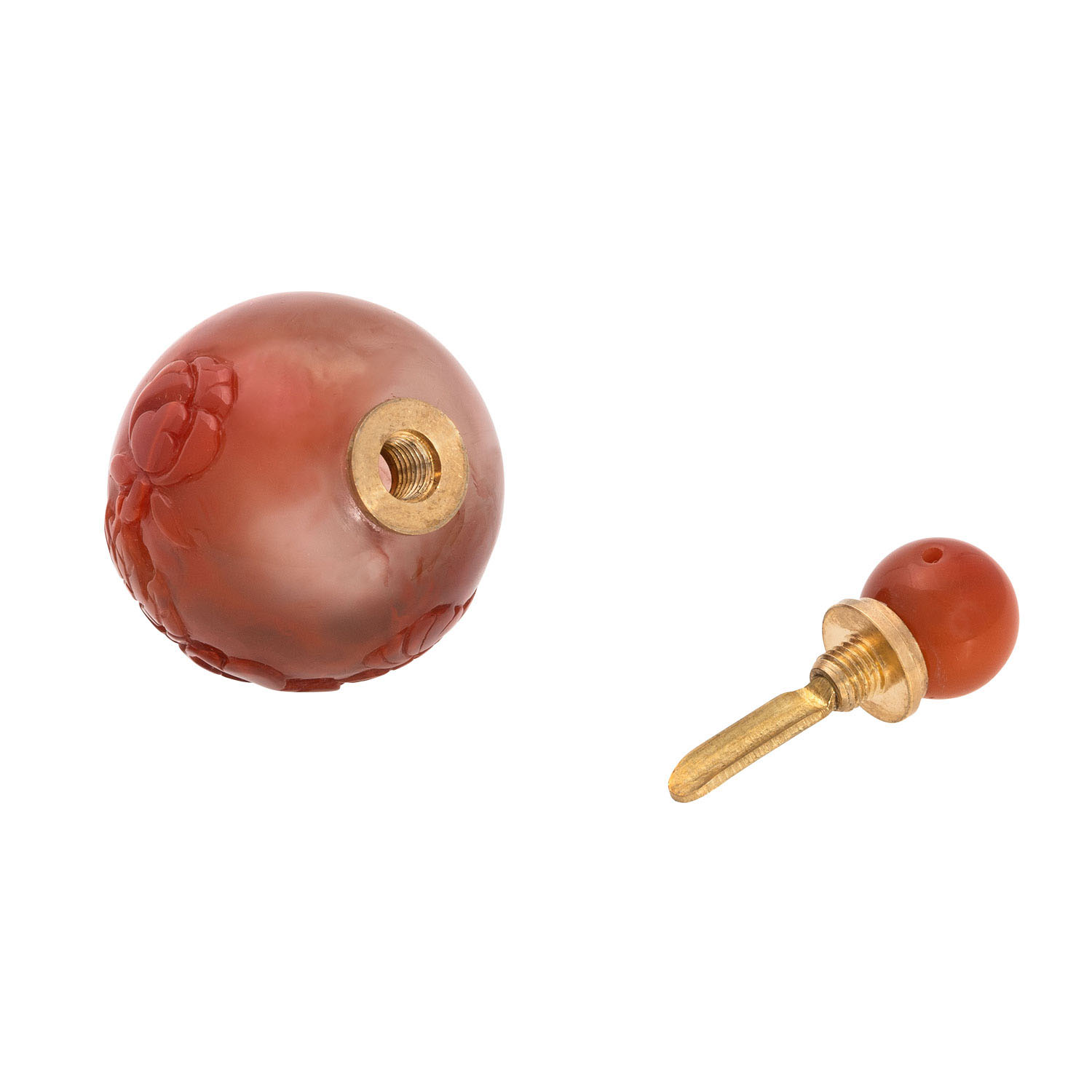 D: 2,4 cm, floral geschnitten mit Messinggewinde und Karneolperle, 20./21. Jh., sehr guter Erhalt.