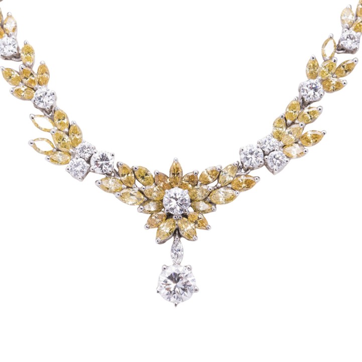ca. WEISS-LGW (H-J)/VS-SI, davon größter Stein abhängend ca. 1 ct und Diamanten im Navetteschliff zus. ca. 5,8 ct, ca. GELB/VS-SI, WG 14K, 24,5 g, L: 41 cm, 2. H. 20. Jh., guter Erhalt.