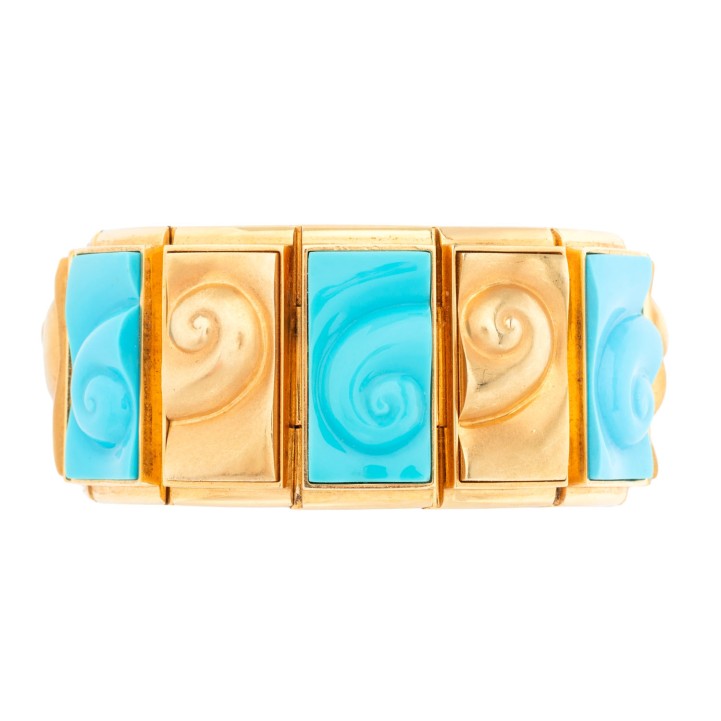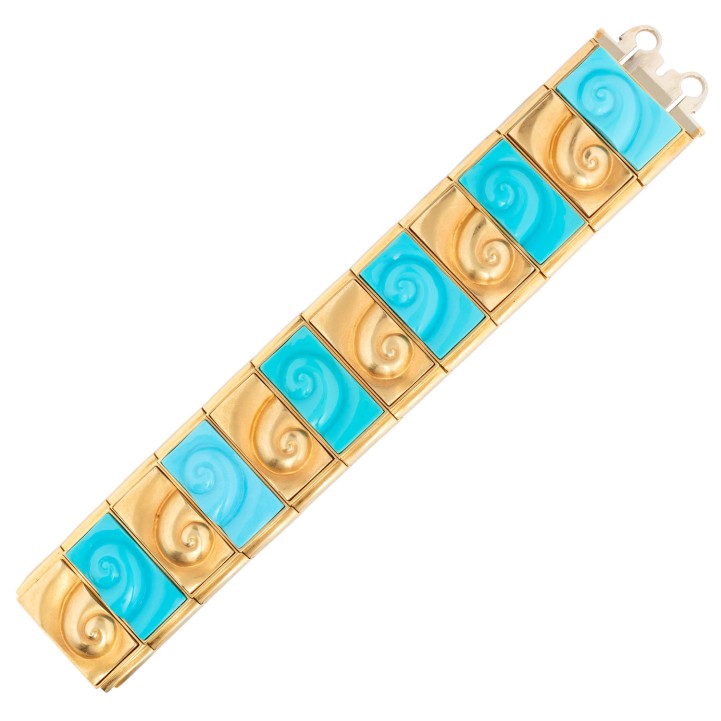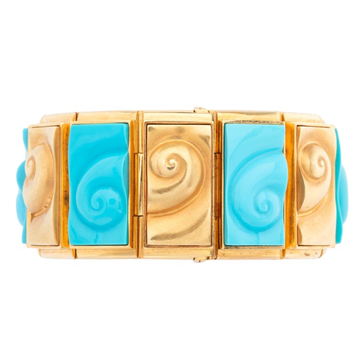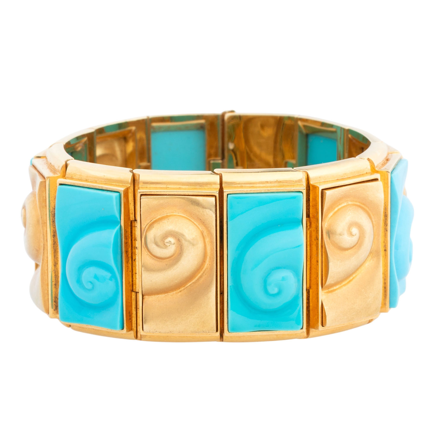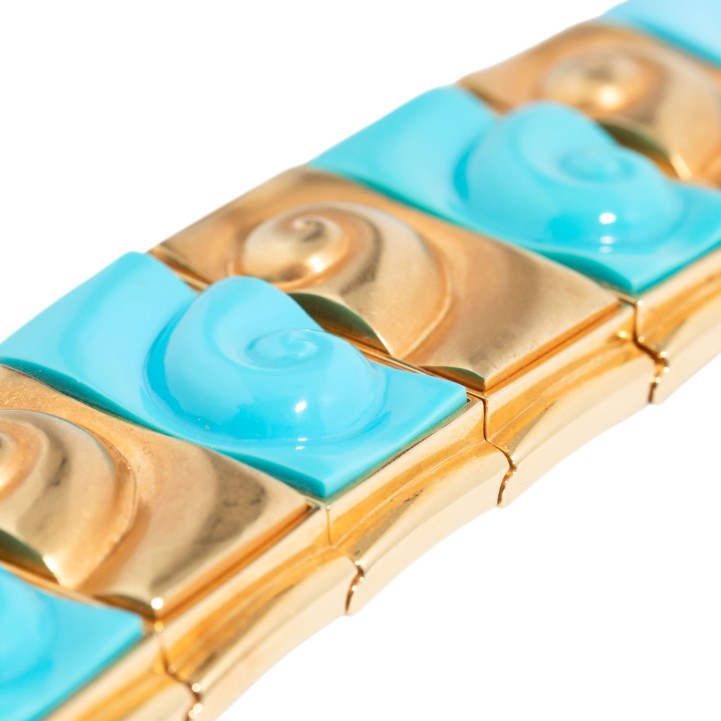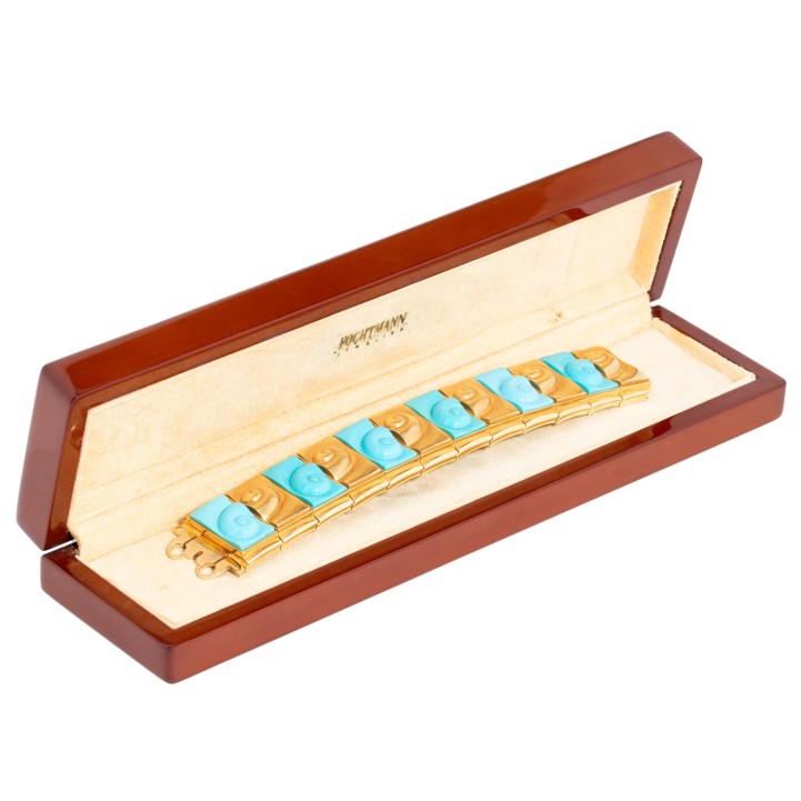 rechteckige Elemente im Wechsel aus Composit-Türkisen und Gold, GG 18K, 178,7 g, L: 17 cm, B: 3 cm, Ende 20. Jh., leichte Tragespuren, signiert 'FOCHTMANN 0885', im Originaletui, äußerst solide und präzise Handarbeit.