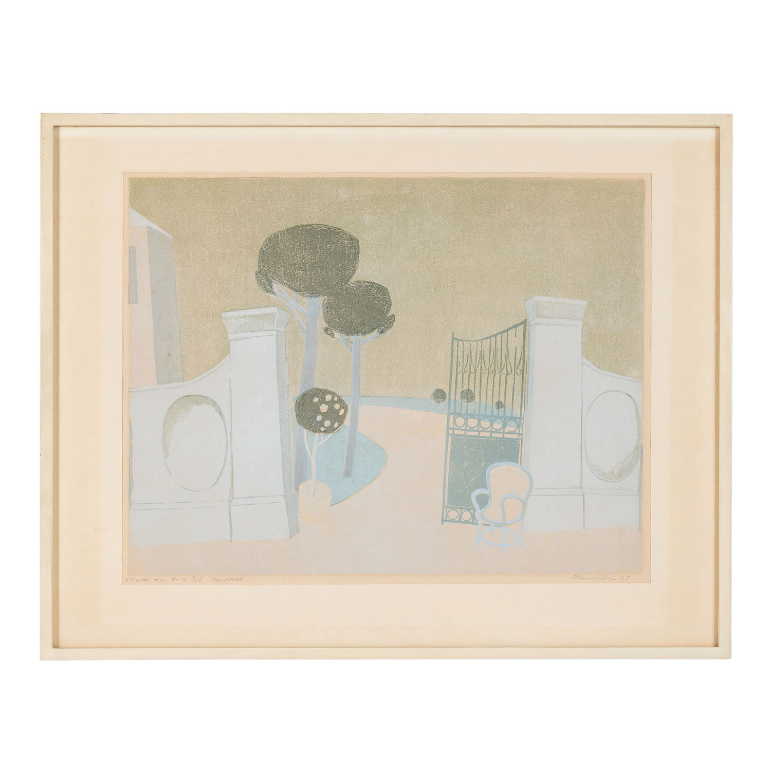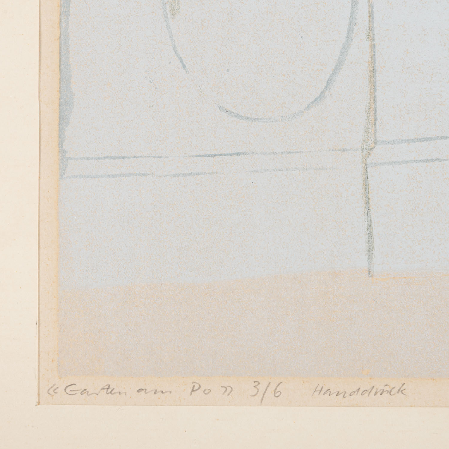 Farblithographie/Papier, u.re. mit Bleistift von Hand signiert und datiert, u.li. mit Bleistift betitelt, num. 3/6 und bezeichnet 'Handdruck', HxB: Platte ca. 41x54 cm, Passepartoutausschnitt ca. 43x56 cm, Außenmaße Rahmen ca. 57x72 cm. Altersspuren, gebräunt und Lichtrand. Im Passepartout hinter Glas gerahmt.
