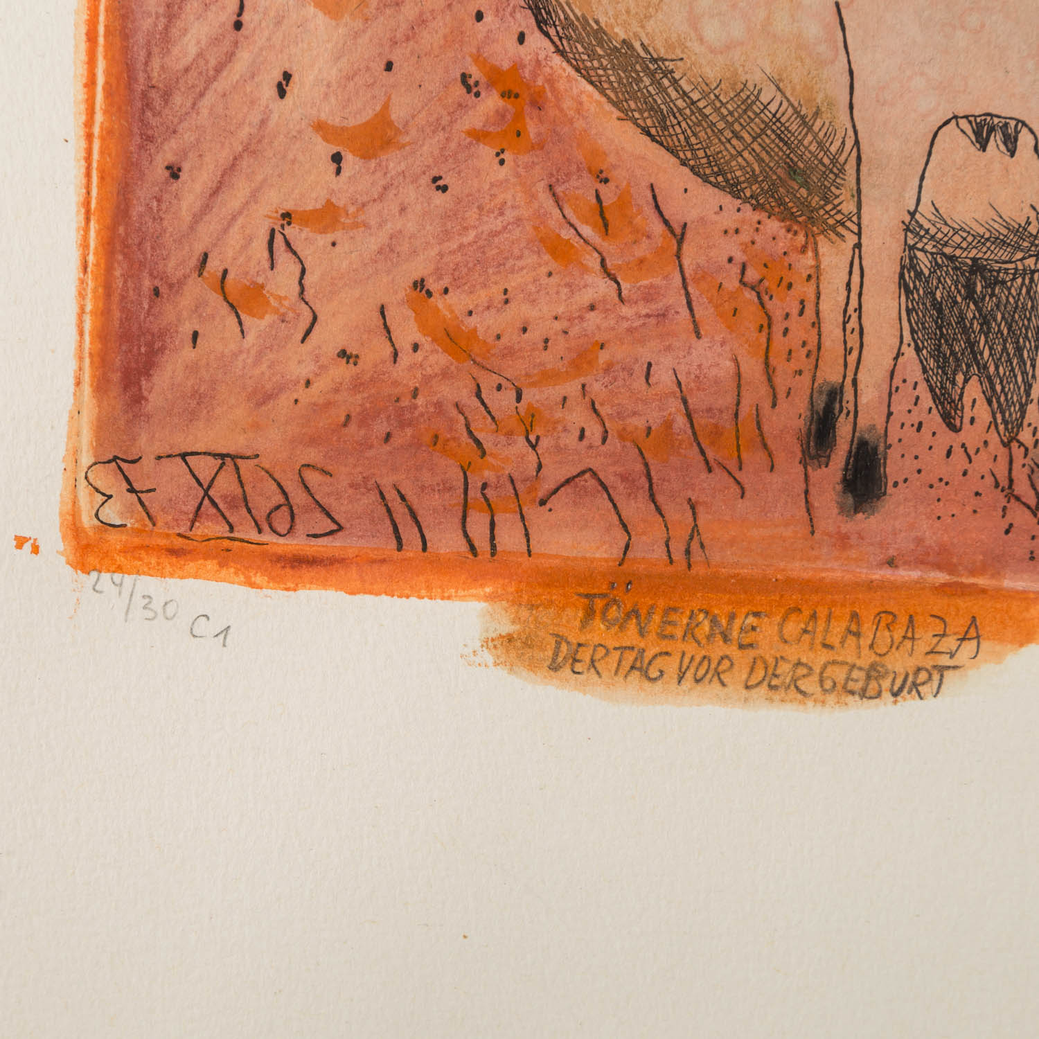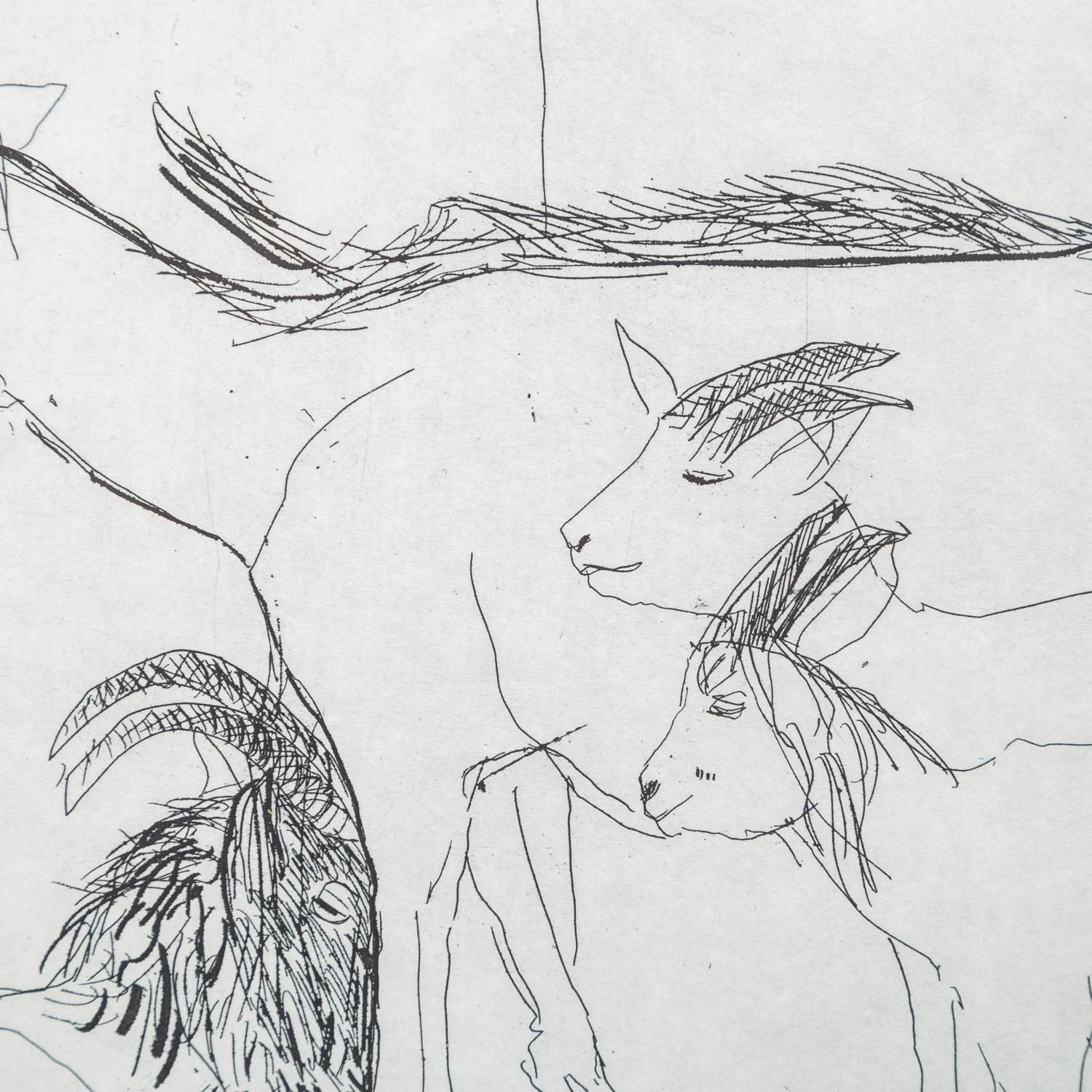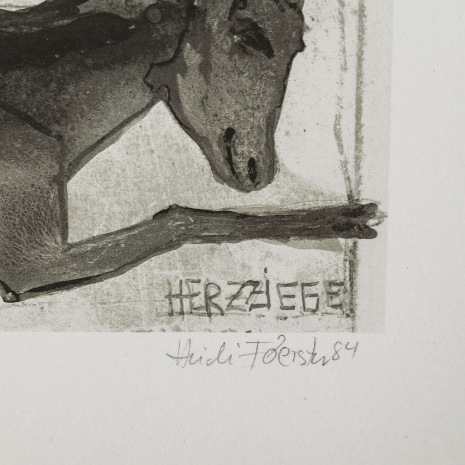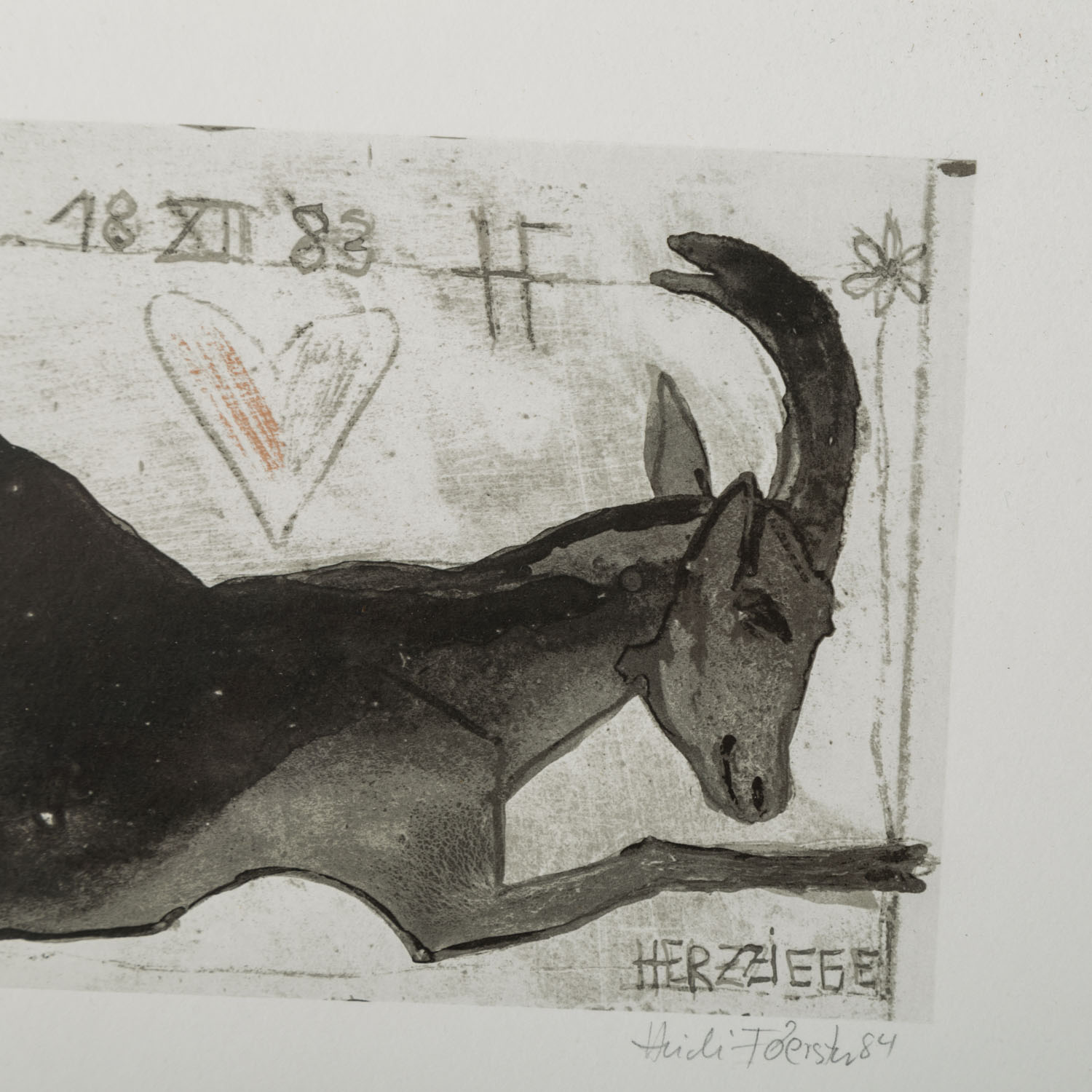 1x 'Hommage a un Chat', Gouache und Kreide über Radierung/Papier, mit Bleistift von Hand num. 5/30 C4, betitelt, signiert und datiert (19)92, HxB: Darstellung ca. 38x25 cm, Blatt ca. 45x31,5 cm, Außenmaße Rahmen ca. 49x35,5 cm; '1x 'Jasmin', kolorierte Radierung/Papier, in der Platte datiert und monogrammiert, mit Bleistift von Hand num. 2/30 C5, betitelt und signiert, HxB: Platte ca. 21x29,5 cm, Blatt ca. 31x45 cm, Außenmaße Rahmen ca. 38x52 cm; 1x 'Tönerne Calabaza...', Kreide und Gouache über Radierung/Papier, in der Platte datiert und monogrammiert, mit Bleistift von Hand num. 24/30 C1, betitelt, signiert und datiert (19)95, HxB: Darstellung ca. 27,5x20,5 cm, Blatt ca. 49x39 cm, Außenmaße Rahmen ca. 51x41 cm; 1x 'Ziegen', Radierung/Papier, in der Platte datiert 3 I 1985 und monogrammiert, mit Bleistift von Hand num 2/30 und signiert, HxB: Platte ca. 21x29 cm, Blatt31x43 cm; 1x 'Herzziege', Offsetlithographie, mit Bleistift von Hand, num. 283/400, signiert und datiert (19)84, HxB: Blatt ca. 21x30 cm. Je Altersspuren, part.leicht gewellt/Knickspuren. Je mit verglastem Rahmen (1x Klemmrahmen am Rand beschädigt).