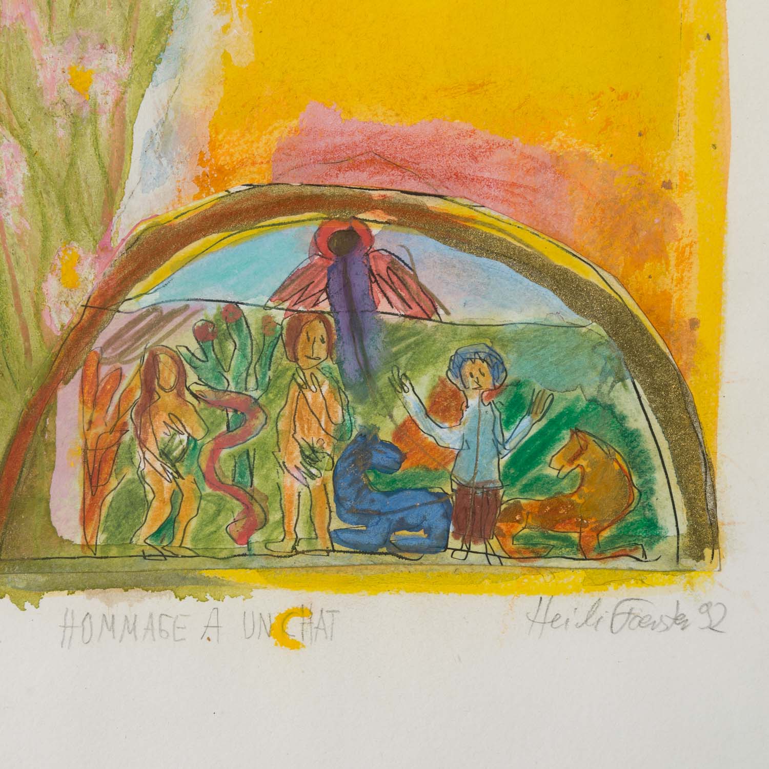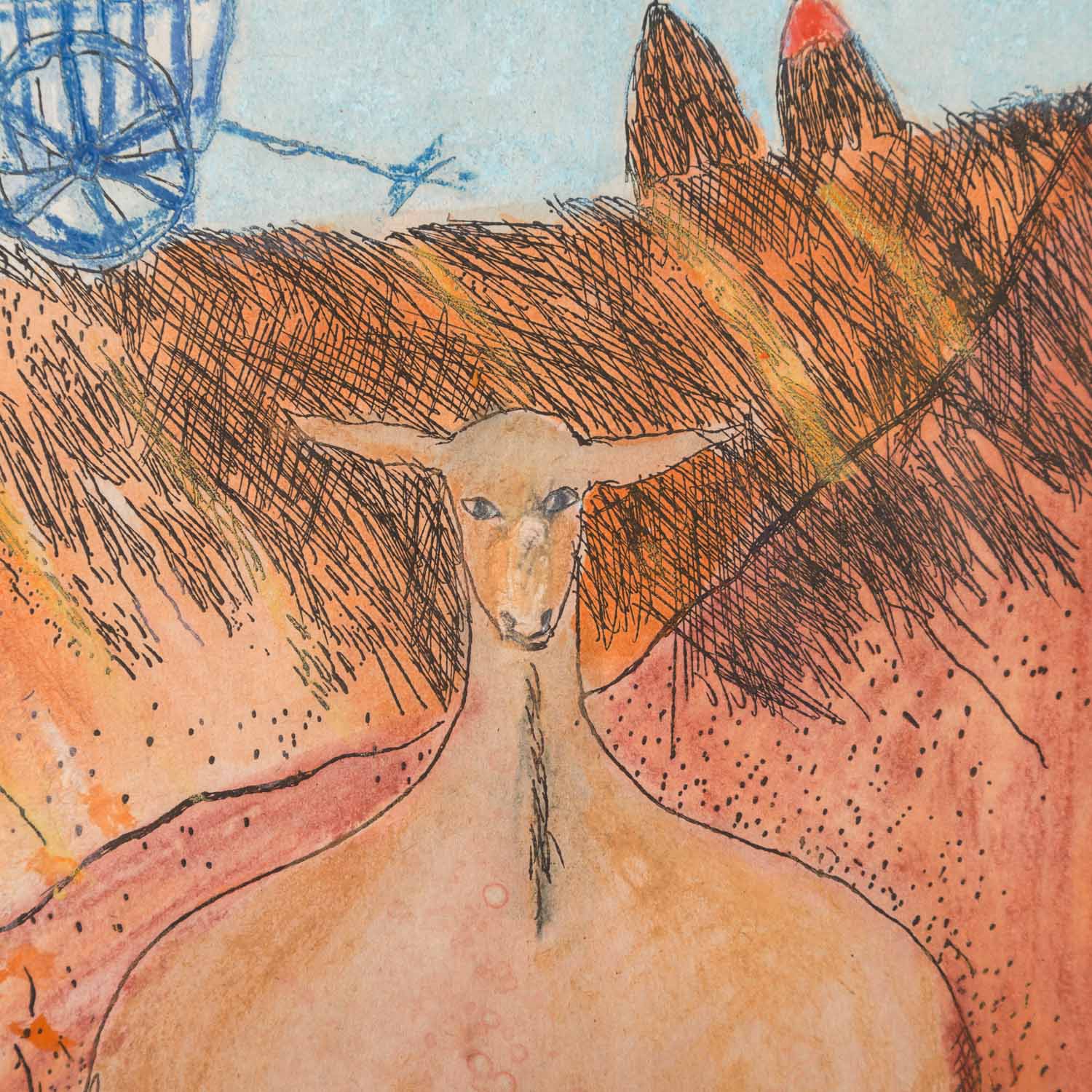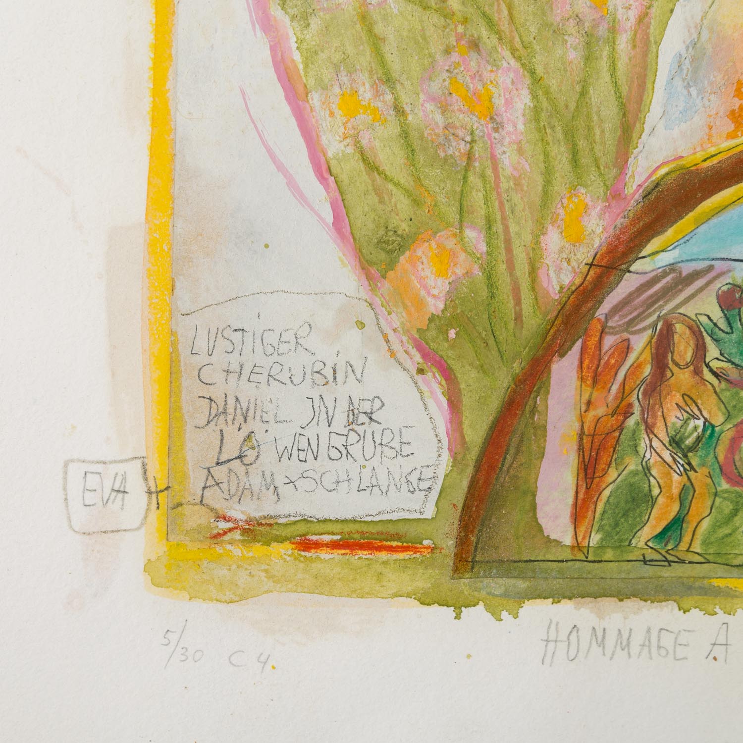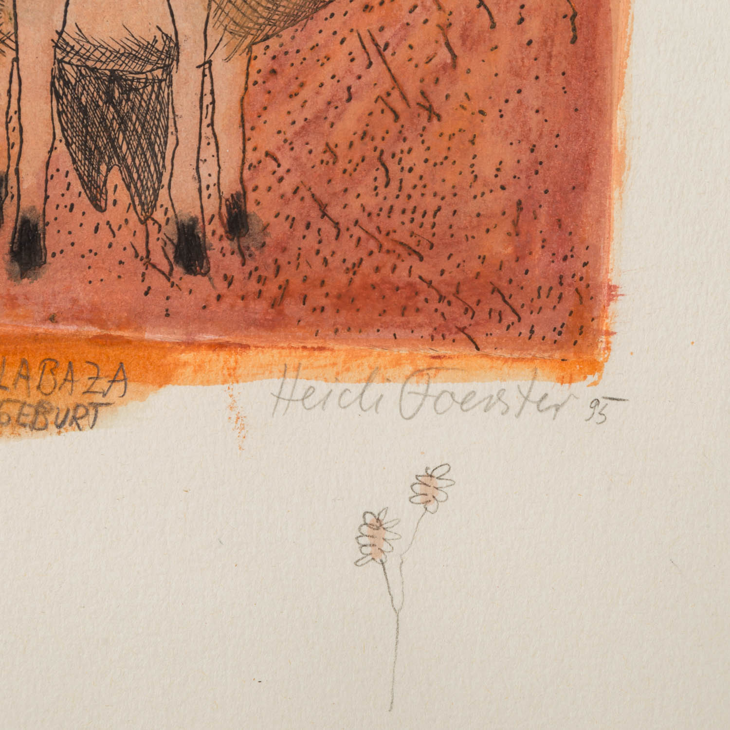 1x 'Hommage a un Chat', Gouache und Kreide über Radierung/Papier, mit Bleistift von Hand num. 5/30 C4, betitelt, signiert und datiert (19)92, HxB: Darstellung ca. 38x25 cm, Blatt ca. 45x31,5 cm, Außenmaße Rahmen ca. 49x35,5 cm; '1x 'Jasmin', kolorierte Radierung/Papier, in der Platte datiert und monogrammiert, mit Bleistift von Hand num. 2/30 C5, betitelt und signiert, HxB: Platte ca. 21x29,5 cm, Blatt ca. 31x45 cm, Außenmaße Rahmen ca. 38x52 cm; 1x 'Tönerne Calabaza...', Kreide und Gouache über Radierung/Papier, in der Platte datiert und monogrammiert, mit Bleistift von Hand num. 24/30 C1, betitelt, signiert und datiert (19)95, HxB: Darstellung ca. 27,5x20,5 cm, Blatt ca. 49x39 cm, Außenmaße Rahmen ca. 51x41 cm; 1x 'Ziegen', Radierung/Papier, in der Platte datiert 3 I 1985 und monogrammiert, mit Bleistift von Hand num 2/30 und signiert, HxB: Platte ca. 21x29 cm, Blatt31x43 cm; 1x 'Herzziege', Offsetlithographie, mit Bleistift von Hand, num. 283/400, signiert und datiert (19)84, HxB: Blatt ca. 21x30 cm. Je Altersspuren, part.leicht gewellt/Knickspuren. Je mit verglastem Rahmen (1x Klemmrahmen am Rand beschädigt).