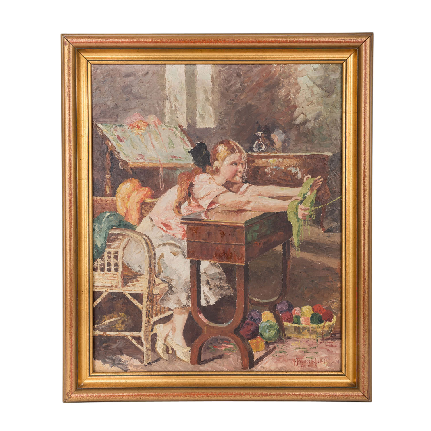 FRANCESCHELLI, A. (ital. Künstler des 19./20. Jh.), ""Mädchen am Nähtisch"", in Stubeninterieur mit Lesepult, über den Tisch gebeugt sitzend und grüne Wolle zum Aufwickeln haltend, u.re. signiert und bezeichnet 'Ao XII' (1912?), Öl/Leinwand, HxB: ca. 60x48 cm (70x58 cm mit Rahmen). Wenige minim. Farbabplatzer und Berieb am Rand. Mit Rahmen. Altersspuren.
