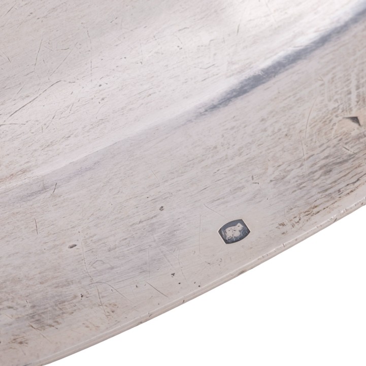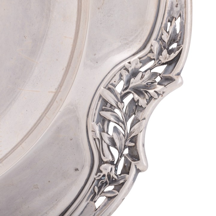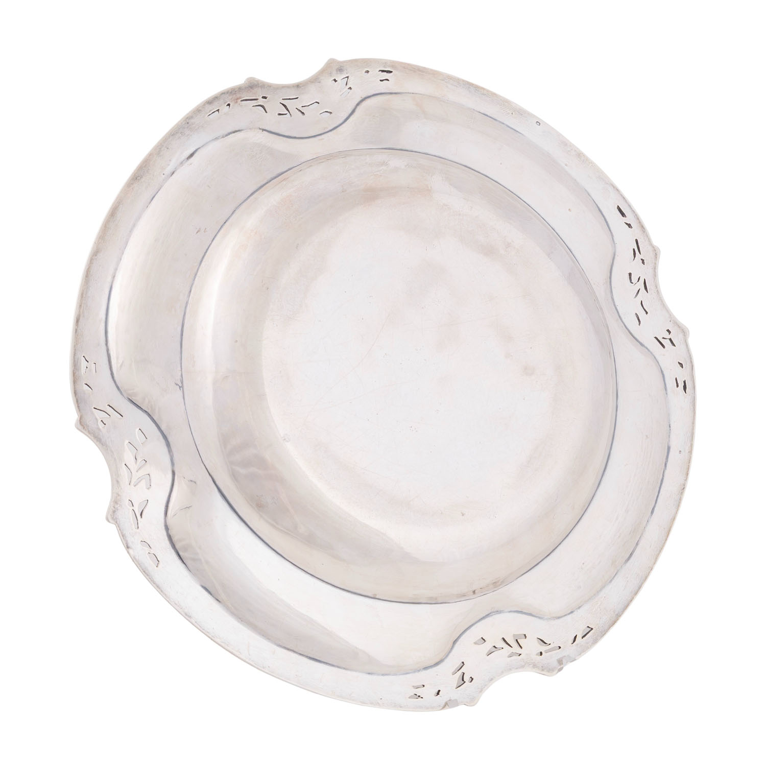 Platte mit vertieftem Spiegel, geschweifter Rand mit einem durchbrochen gearbeiteten Blätterdekor, Merkurmarke mit 2 (Exportmarke), D. ca. 30 cm, ca. 851 g. Mit Bestoßungen, Alters- und Gebrauchsspuren.