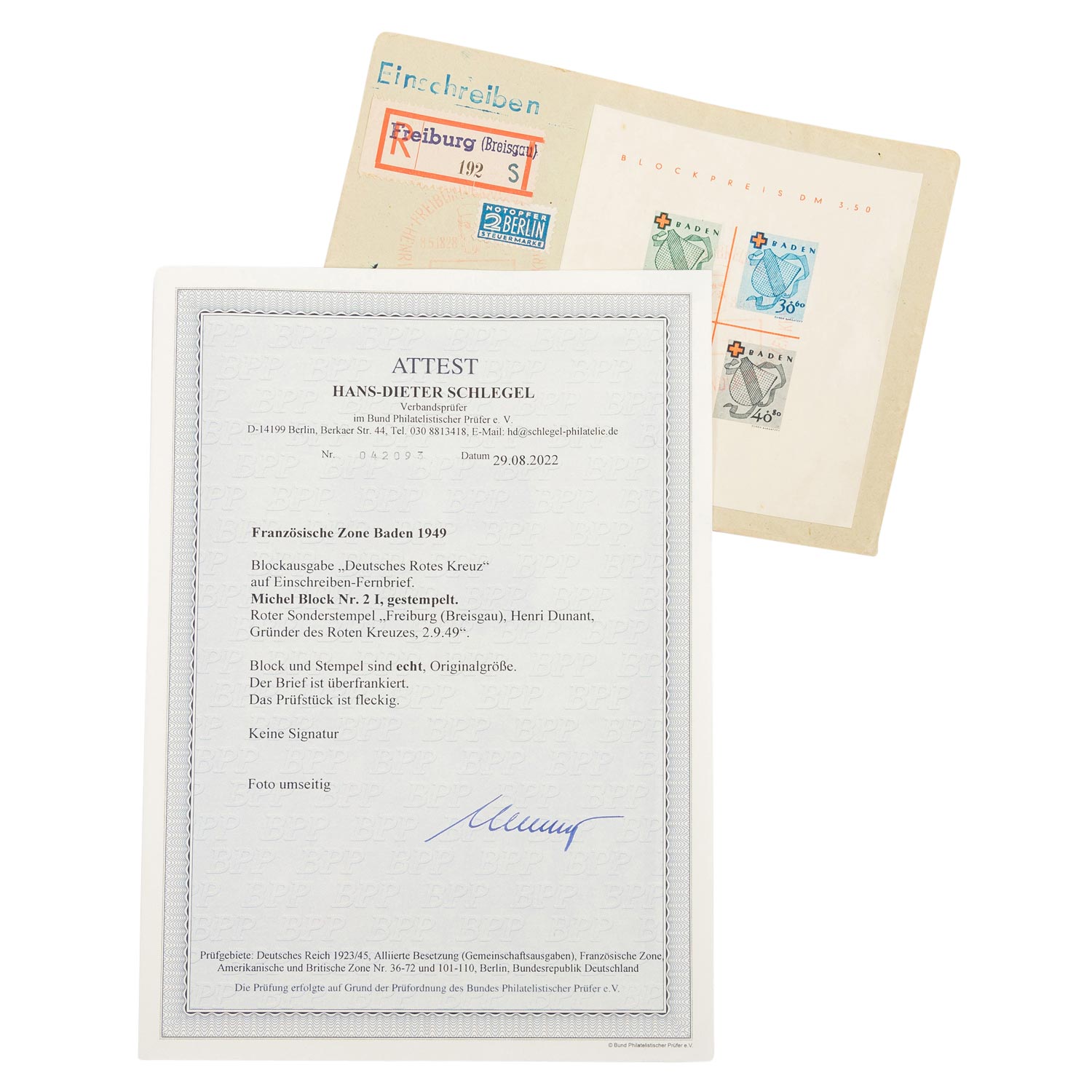 Einschreiben - Fernbrief. Roter Sonderstempel 'Freiburg (Breisgau), Henri Dunant, Gründer des Roten Kreuzes, 2.4.49'. Der Brief ist fleckig, Attest Hans-Dieter-Schlegel (BPP 29.8.2022).