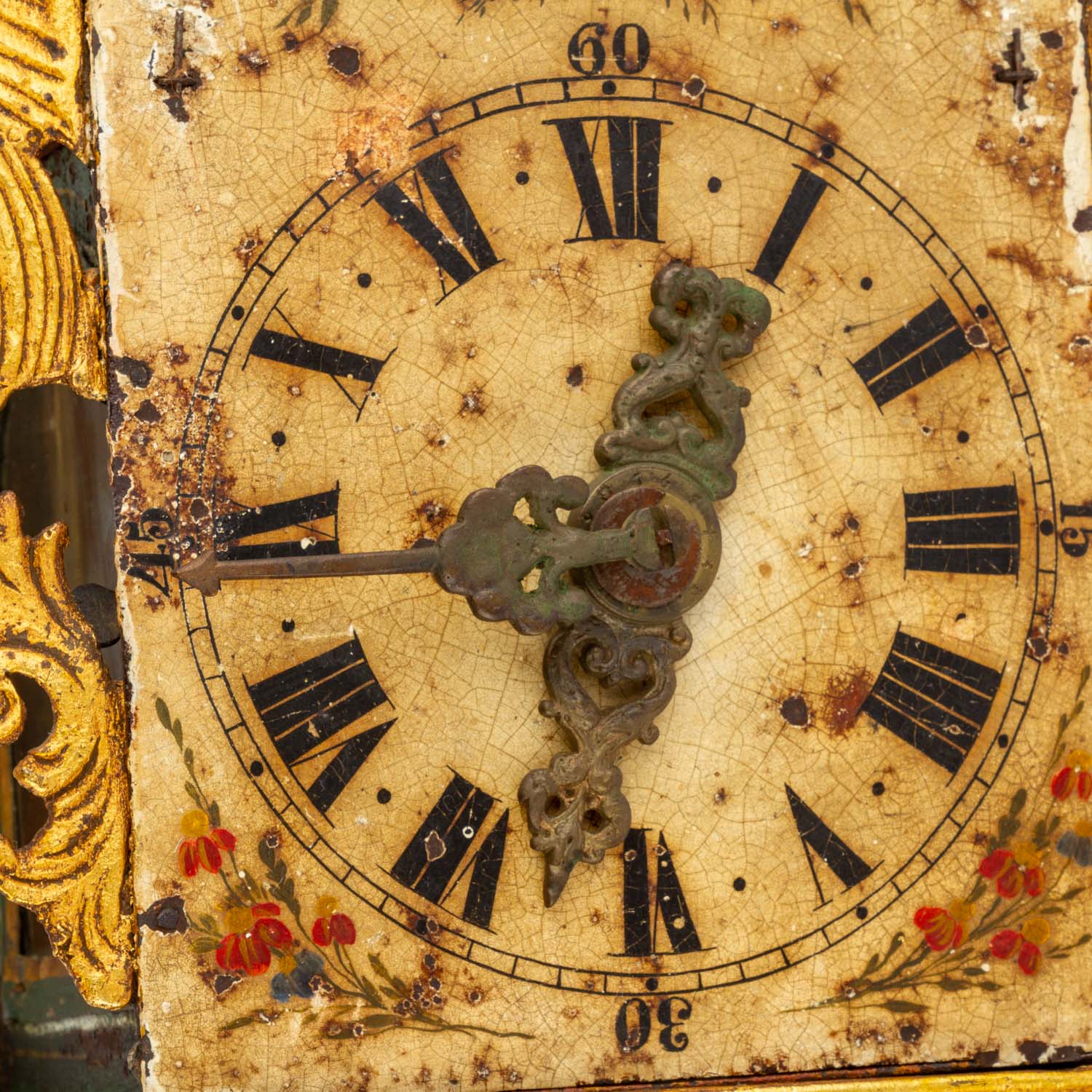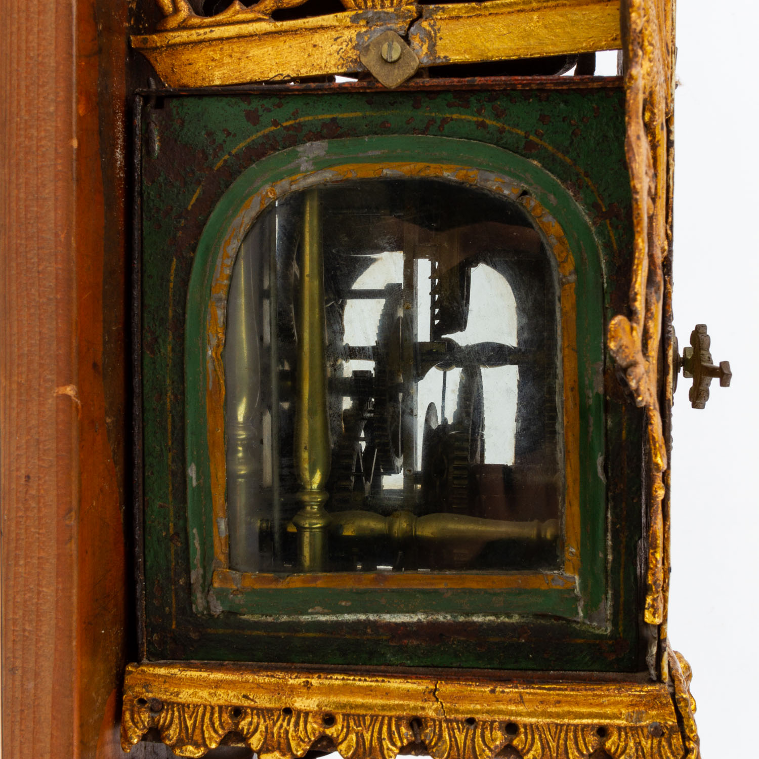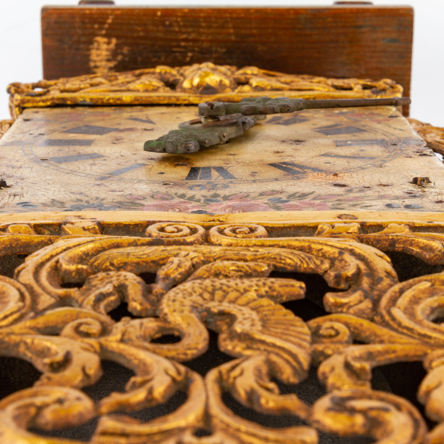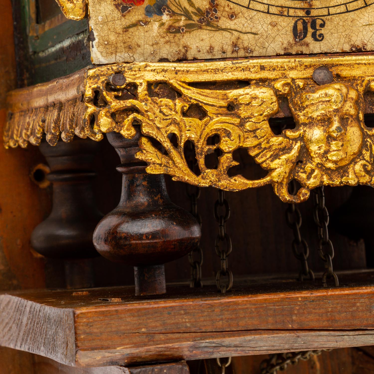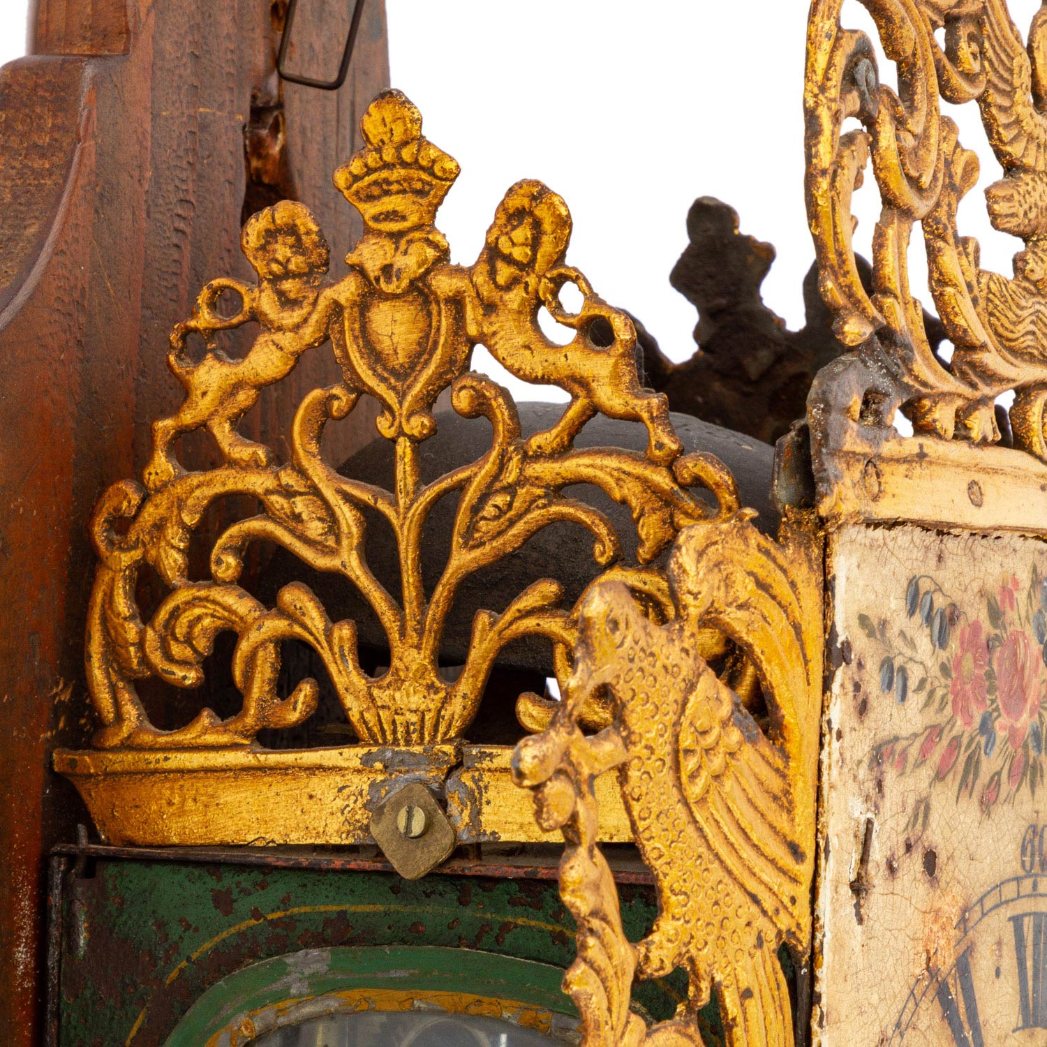 FRIESISCHE STUHLUHR 19./20. Jh., Eisengehäuse, polychrom bemalt, aufwendige, durchbrochen gearbeitete und vergoldete Metalpplikationen, H: 42 cm. (ohne Stuhl ) rest. und ergänzt., nicht auf Funktion geprüft.