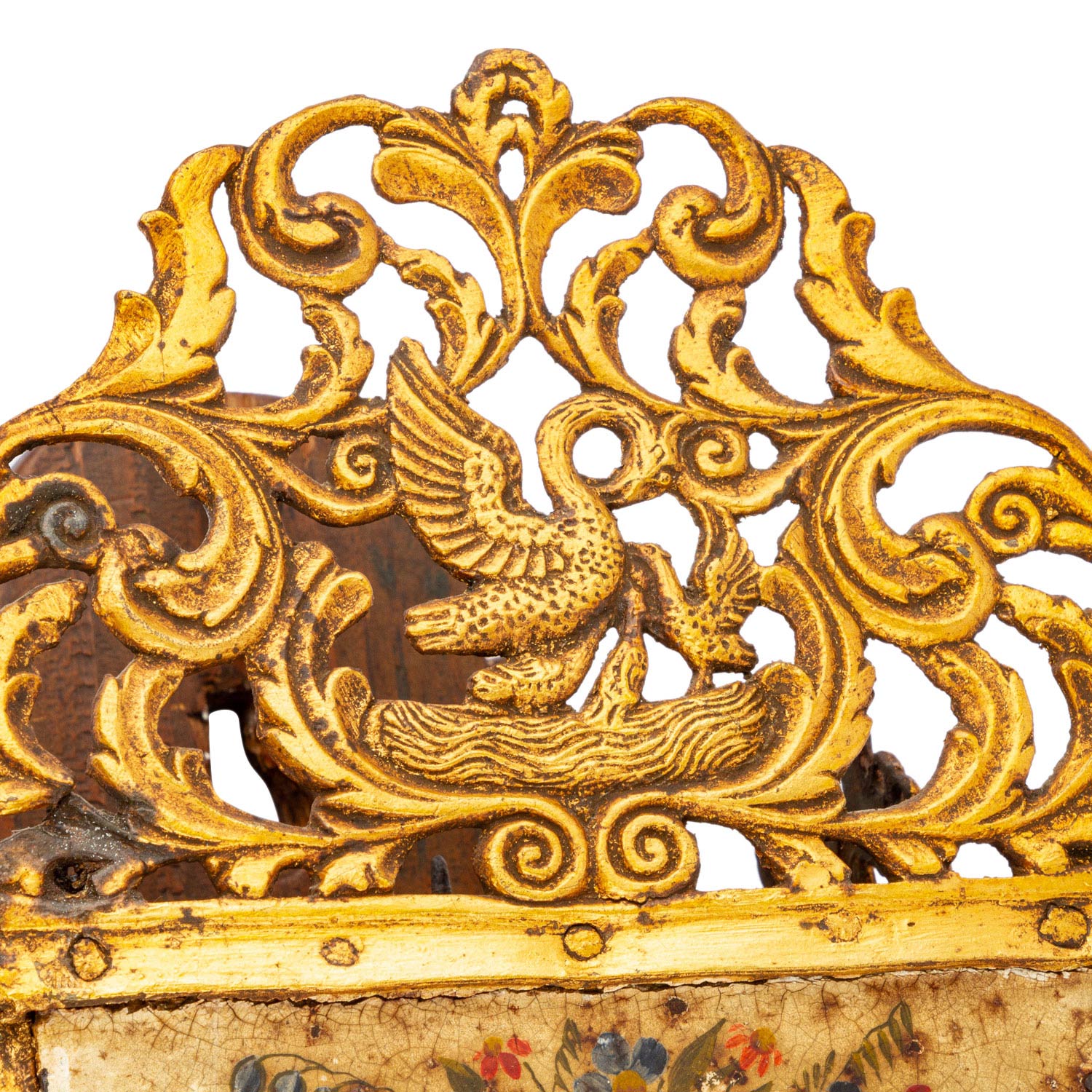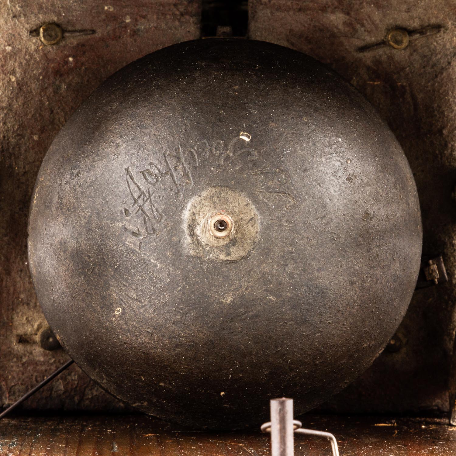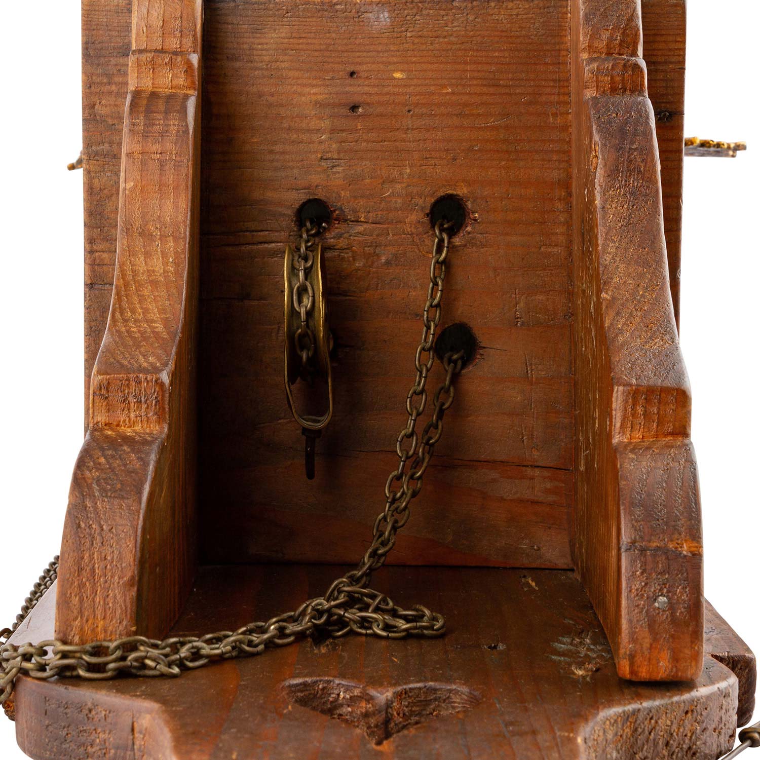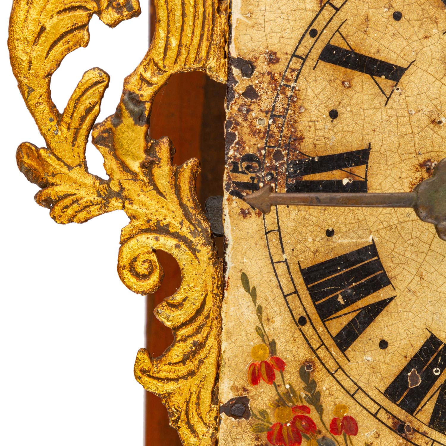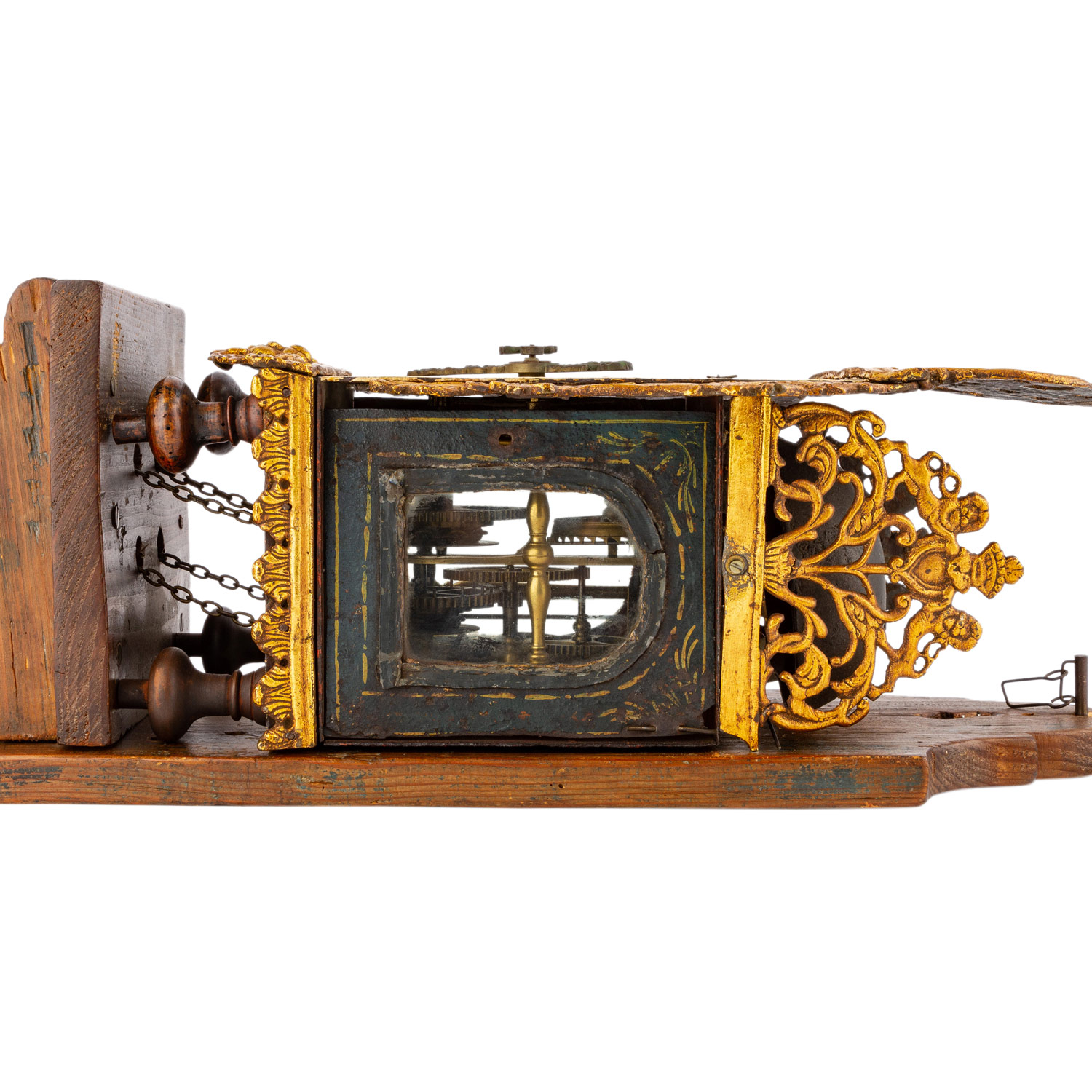 FRIESISCHE STUHLUHR 19./20. Jh., Eisengehäuse, polychrom bemalt, aufwendige, durchbrochen gearbeitete und vergoldete Metalpplikationen, H: 42 cm. (ohne Stuhl ) rest. und ergänzt., nicht auf Funktion geprüft.