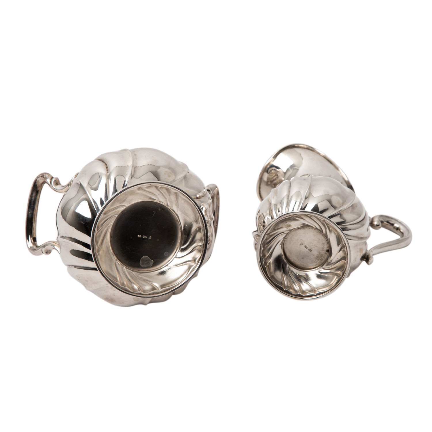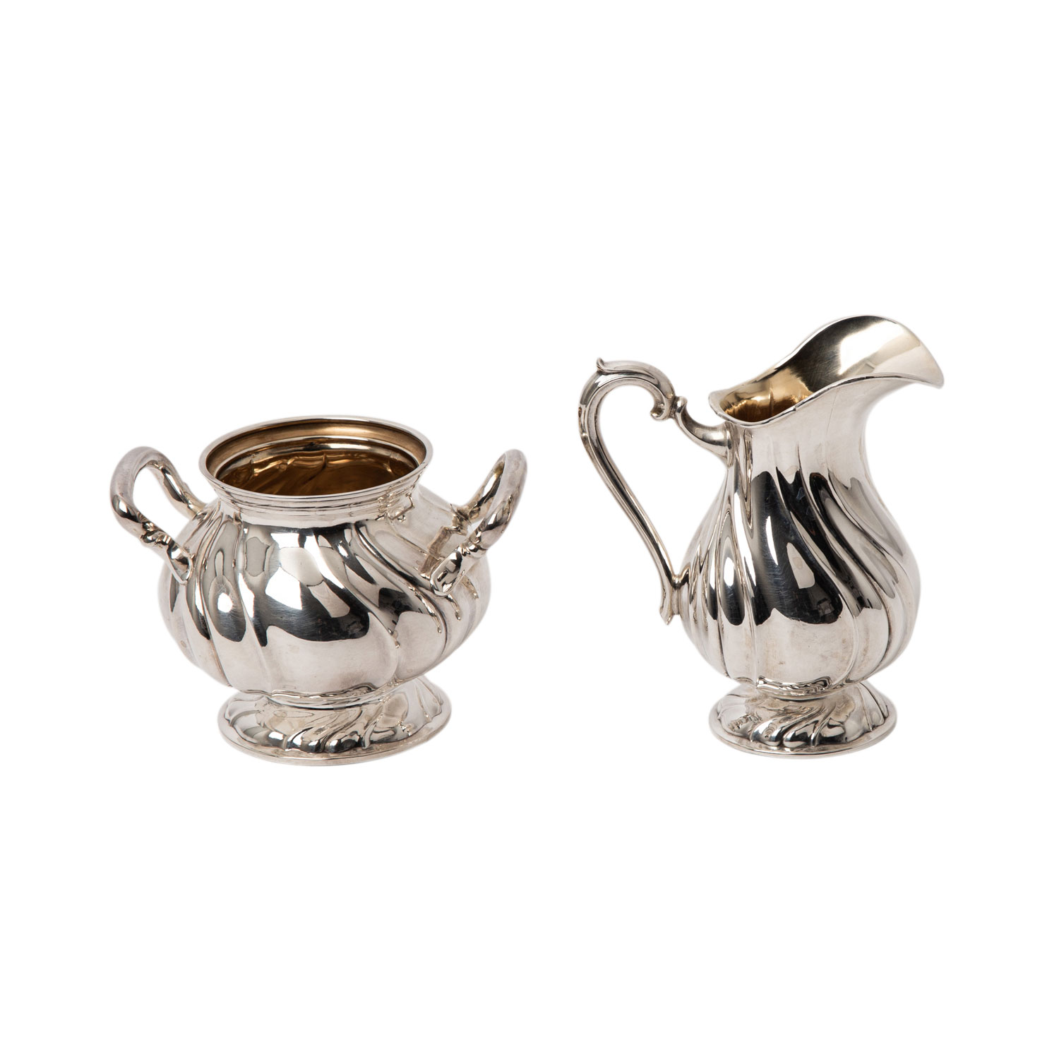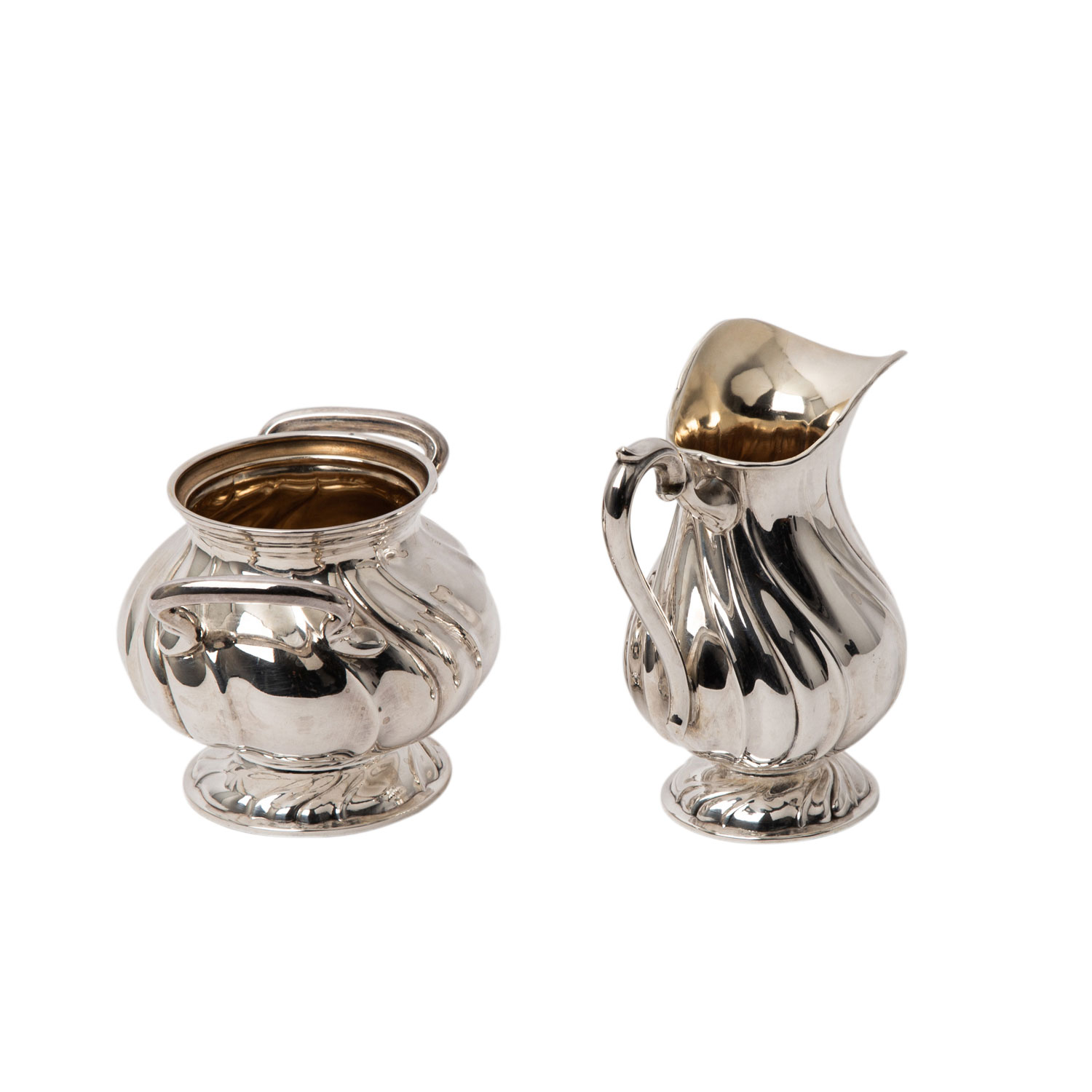 GEBRÜDER KÜHN Zucker- und Sahneset, 20. Jh. Schwäbisch Gmünd, runder Stand, godroniert, Innenvergoldung, Sahnegießer, H. ca. 12,5 cm, Zuckerdose, H. ca. 9 cm, Marken: Halbmond, Krone, 800, MZ. Alters- und Gebrauchsspuren.
