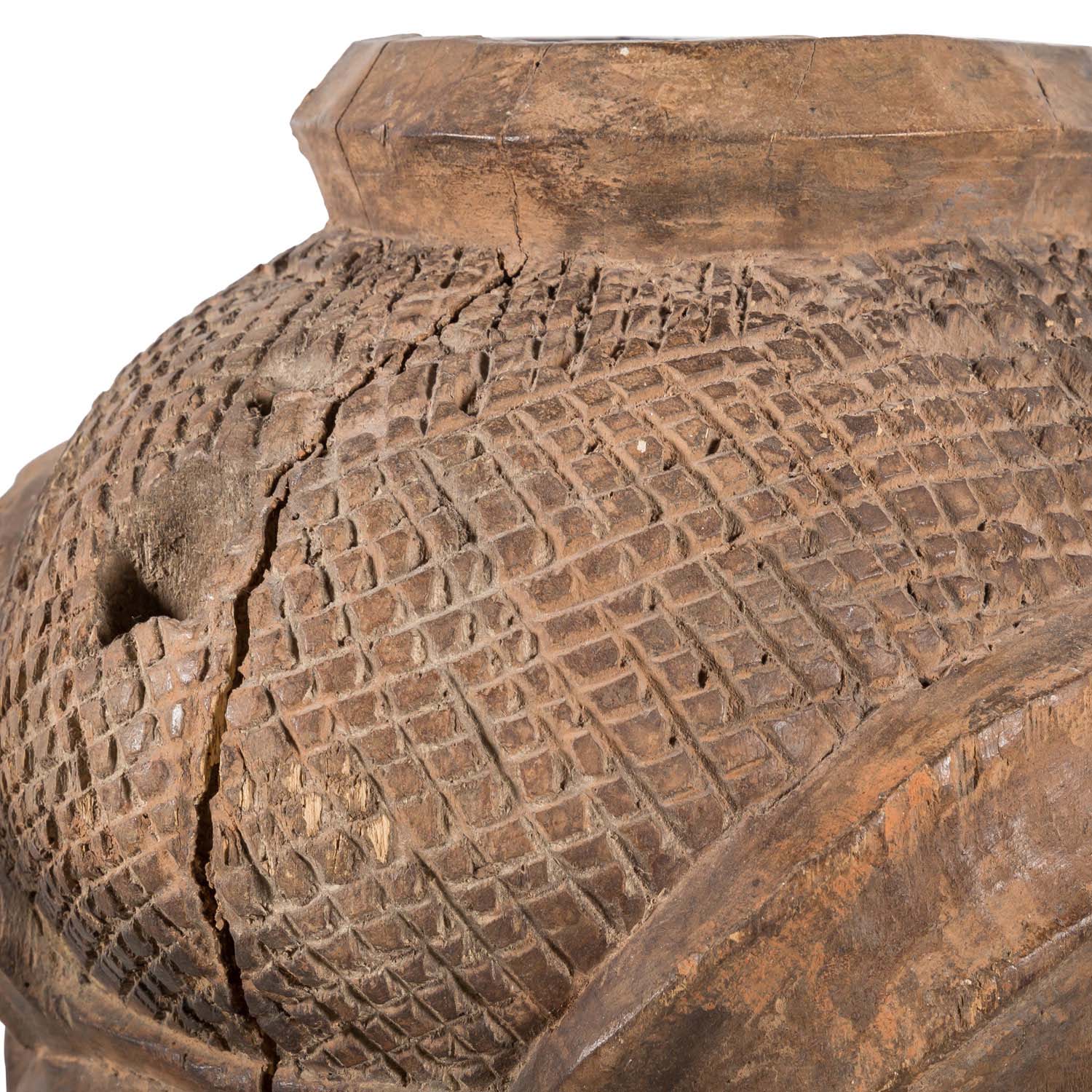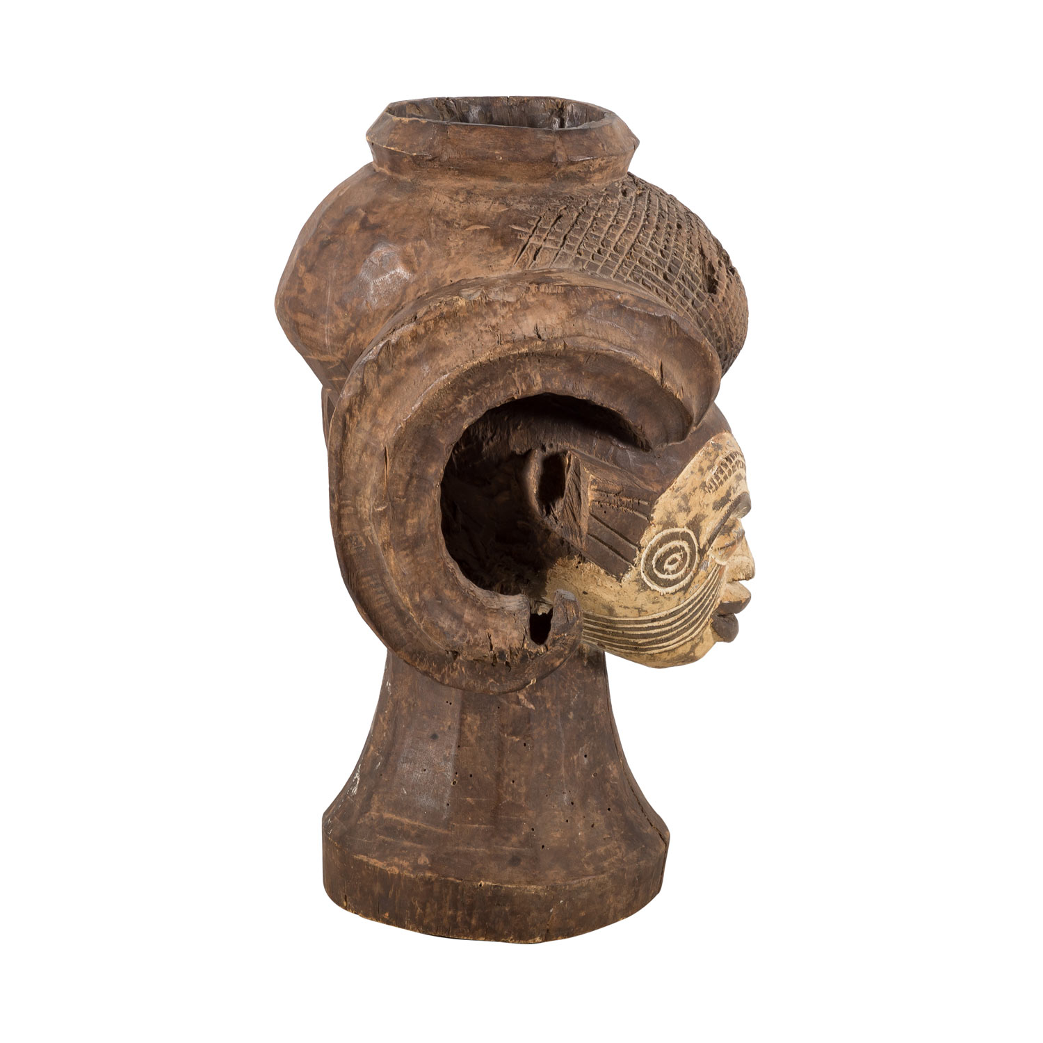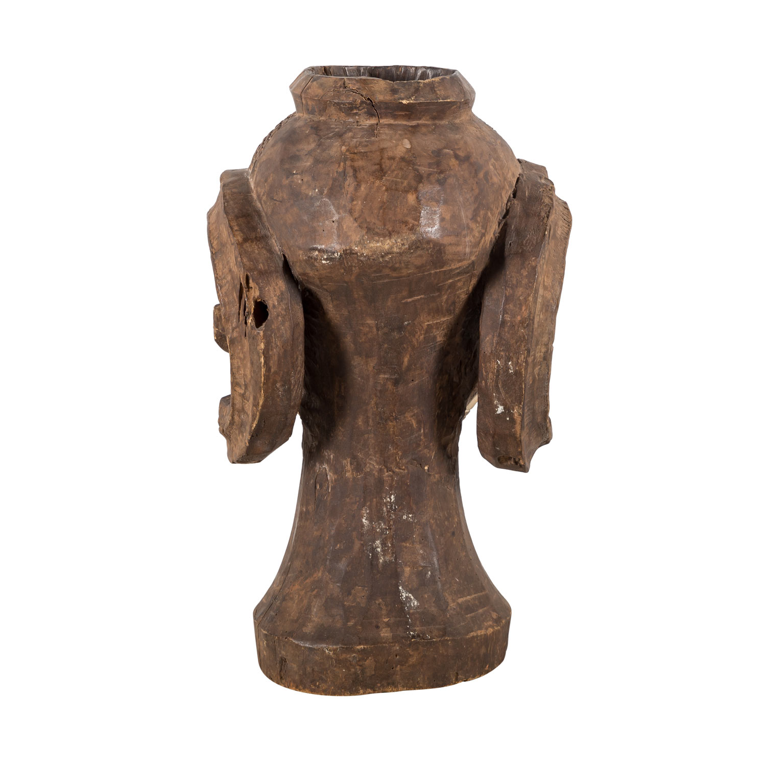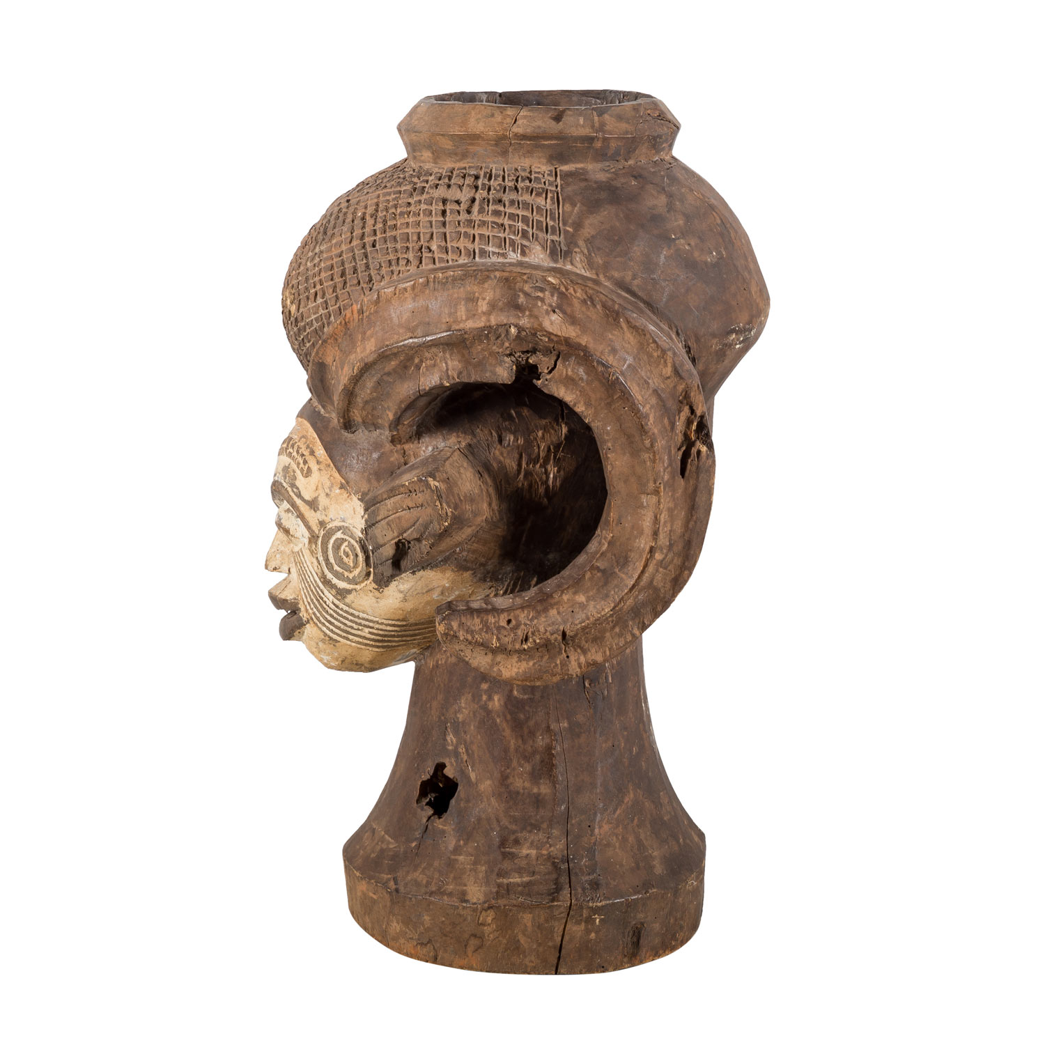 Frauenkopf, weiß mit dunklem Mund und Ziernarben. Seitliche Widderhörner, zwischen denen sich das Gefäß befindet. Großer Trockenriss längs durch das Gesicht. H: 45,5 cm.