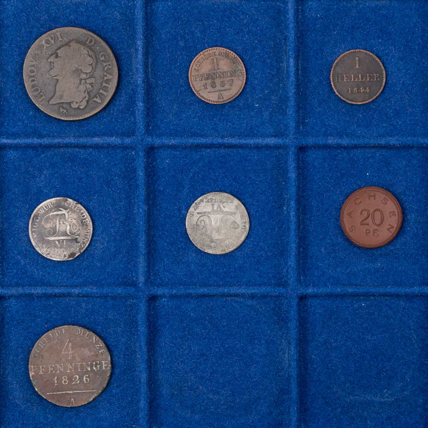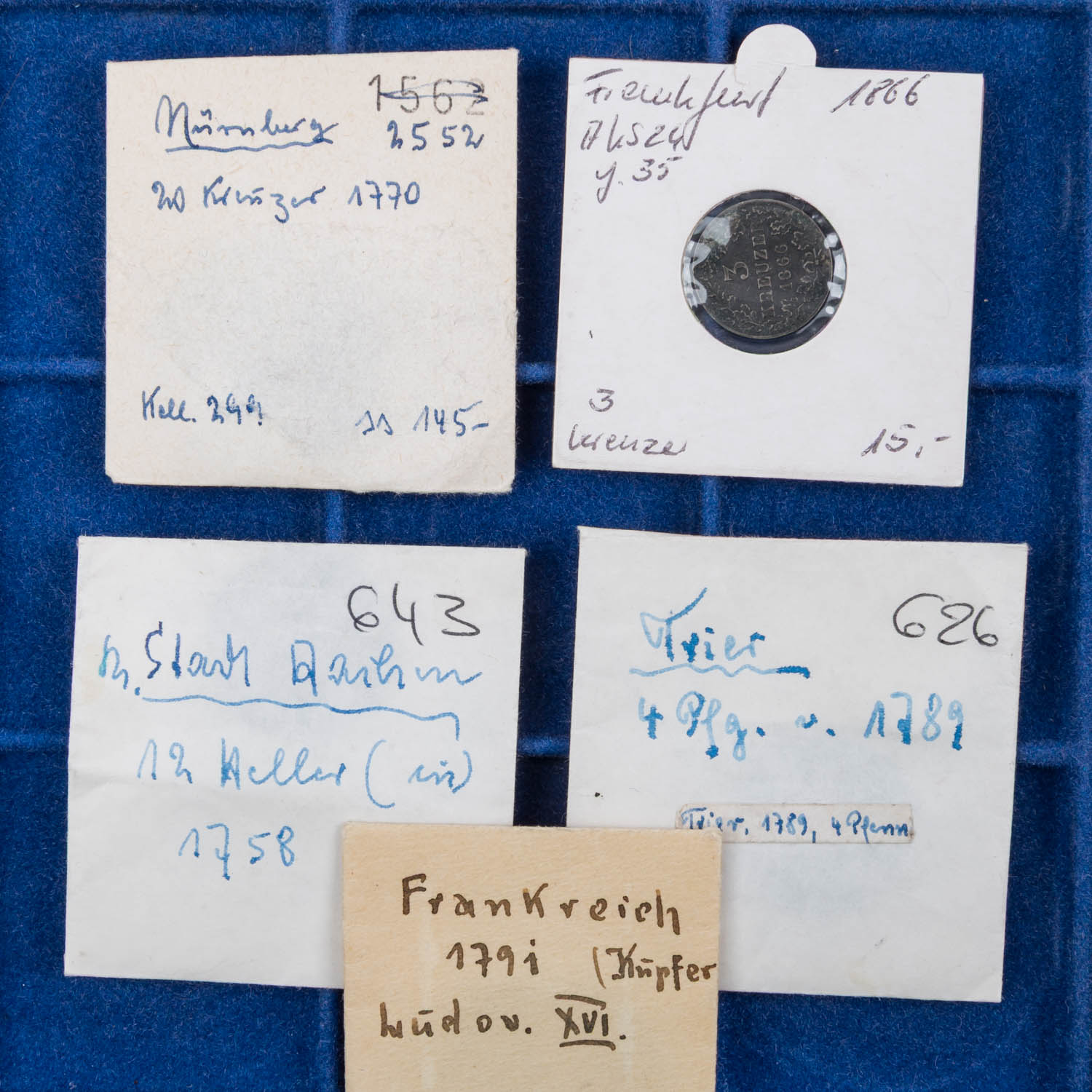 Stadt Frankfurt 1 Heller 1844; Sachsen 20 Pfennig 1921; Brandenburg-Preußen 1 Pfennig 1867/A; Freie Stadt Frankfurt 3 Kreuzer 1866; Preussen 4 Pfennig 1826/ A; 2 x Frankreich 1 Sol 1791, Ludwig XVI., 12g Ag rau; Erzbistum Trier - 4 Pfennig 1789 G.M., Clemens Wenzel von Sachsen; Österreich 20 Kreuzer 1770, Joseph II.; Stadt Nürnberg 20 Kreuzer 1770, ss; Reichsstadt Aachen 12 Heller 1758; 2x Württemberg 6 Kreuzer 1806 (ein Jahr unleserlich). Erhalt unterschiedlich.