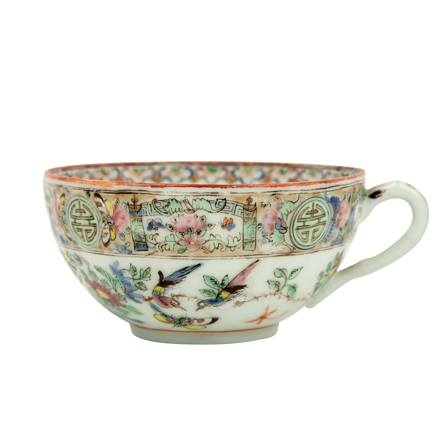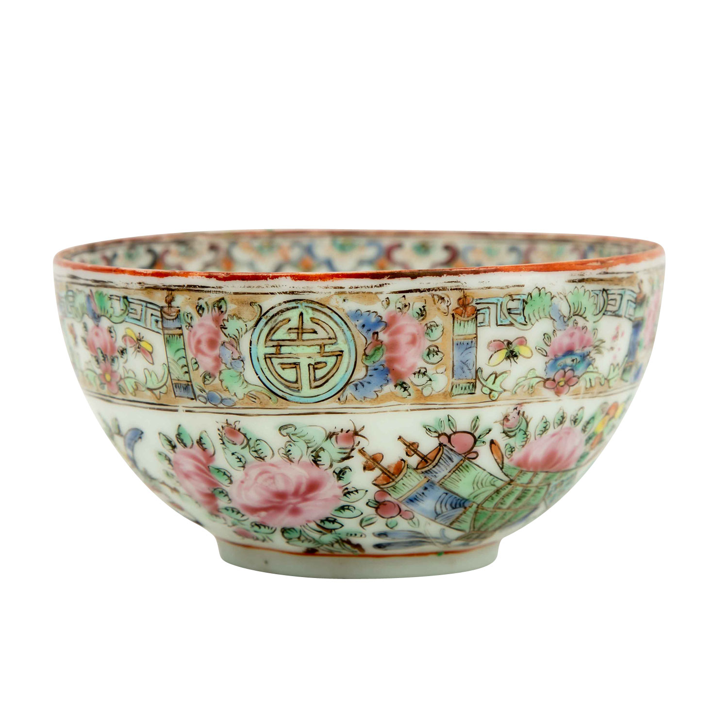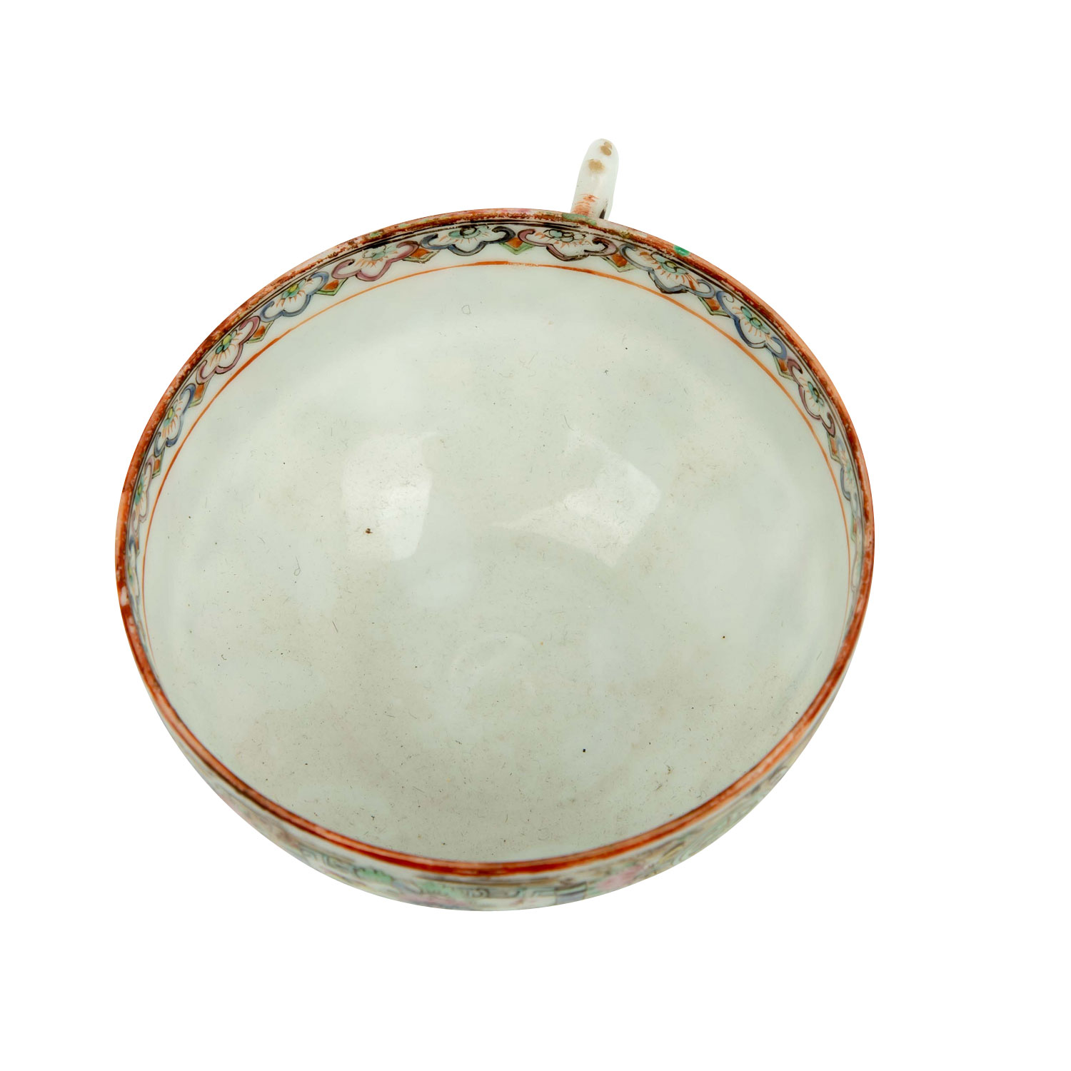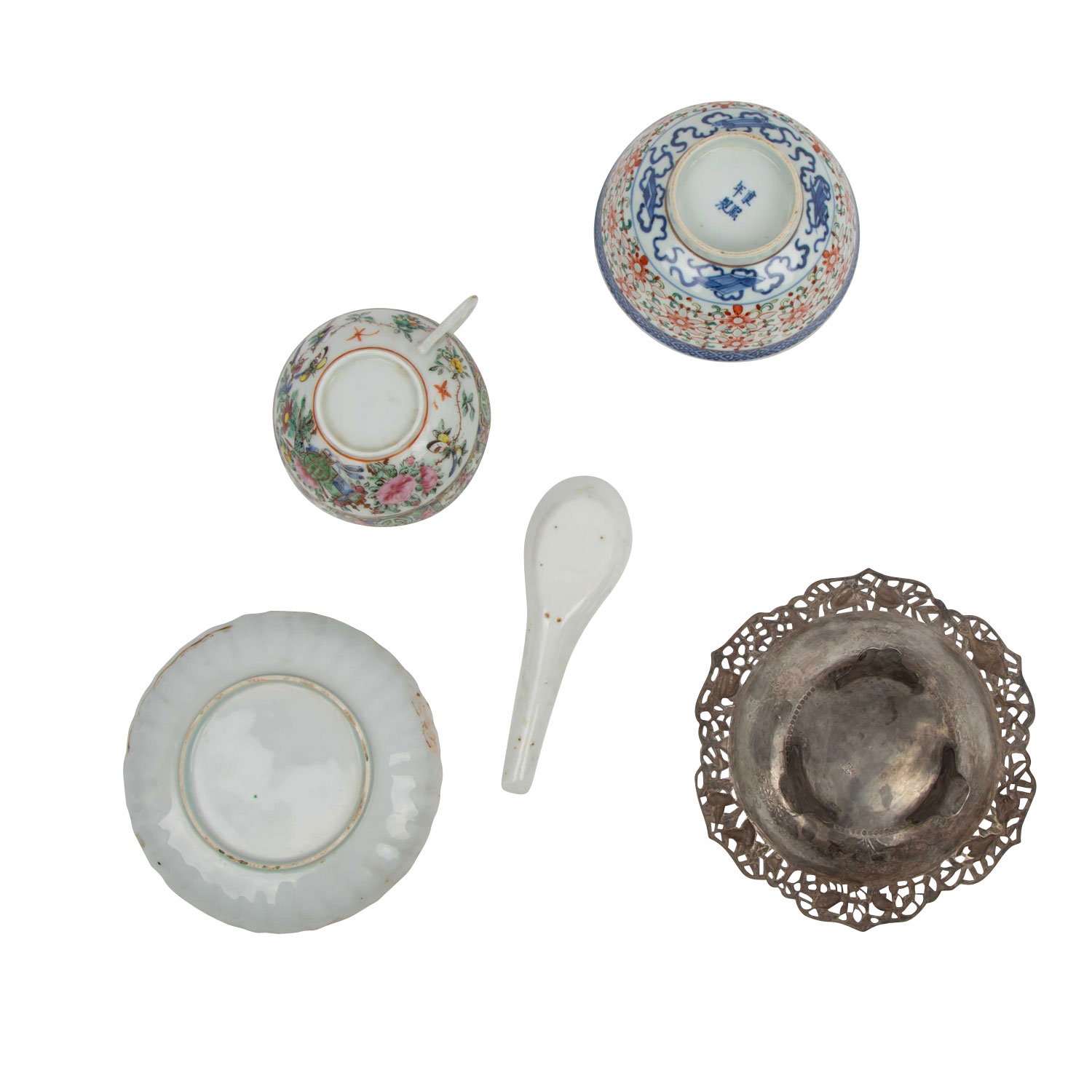 1.) Schälchen aus Silber (112 g), D: ca. 15,5 cm. 2.) Schälchen aus Porzellan, D: 12 cm. 3.) Löffel aus Porzellan, L: ca. 14 cm. 4.) Famille rose-Teetasse mit UTasse. Alters- und Gebrauchsspuren, tlw. besch.