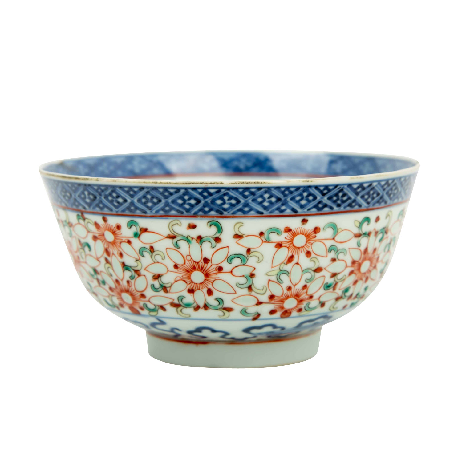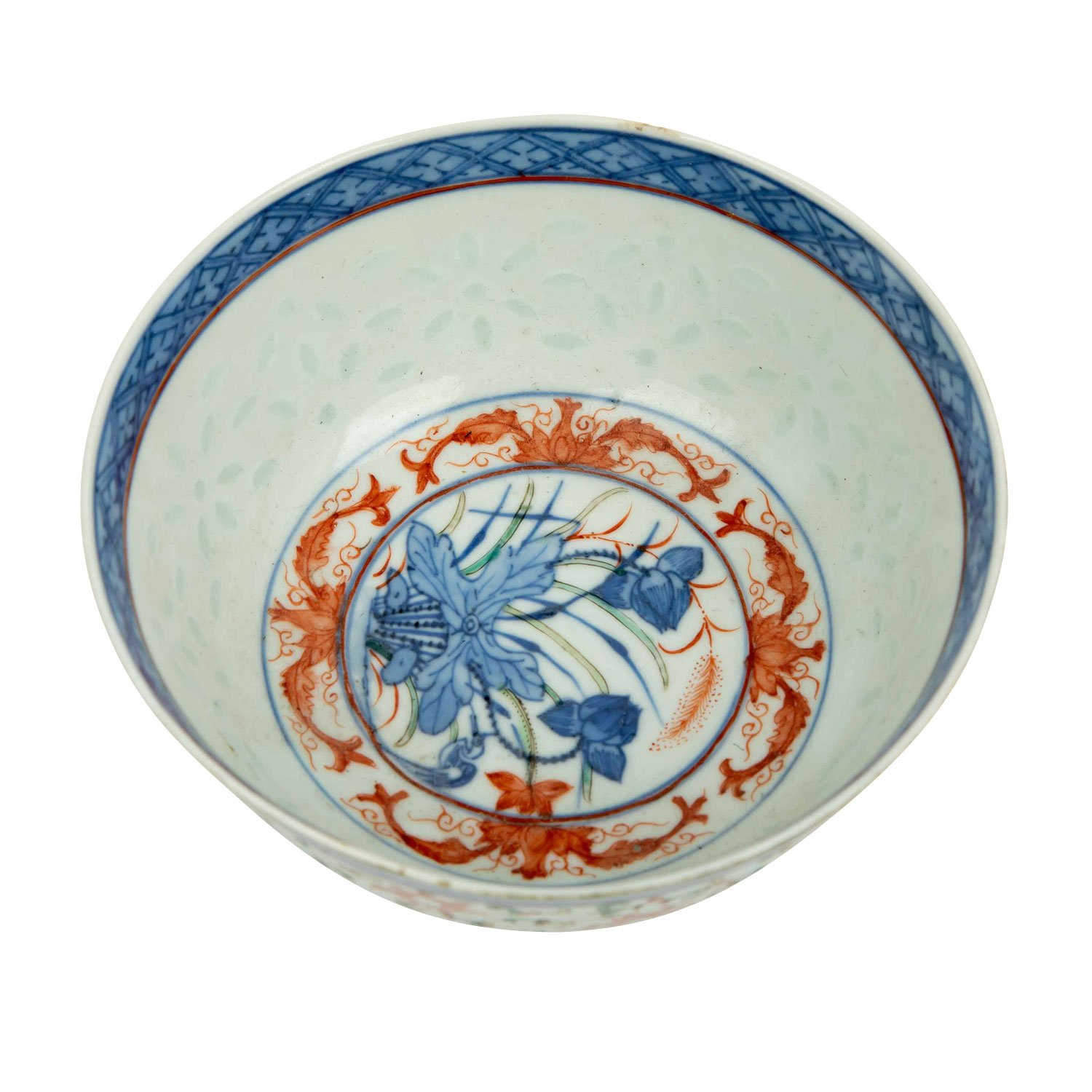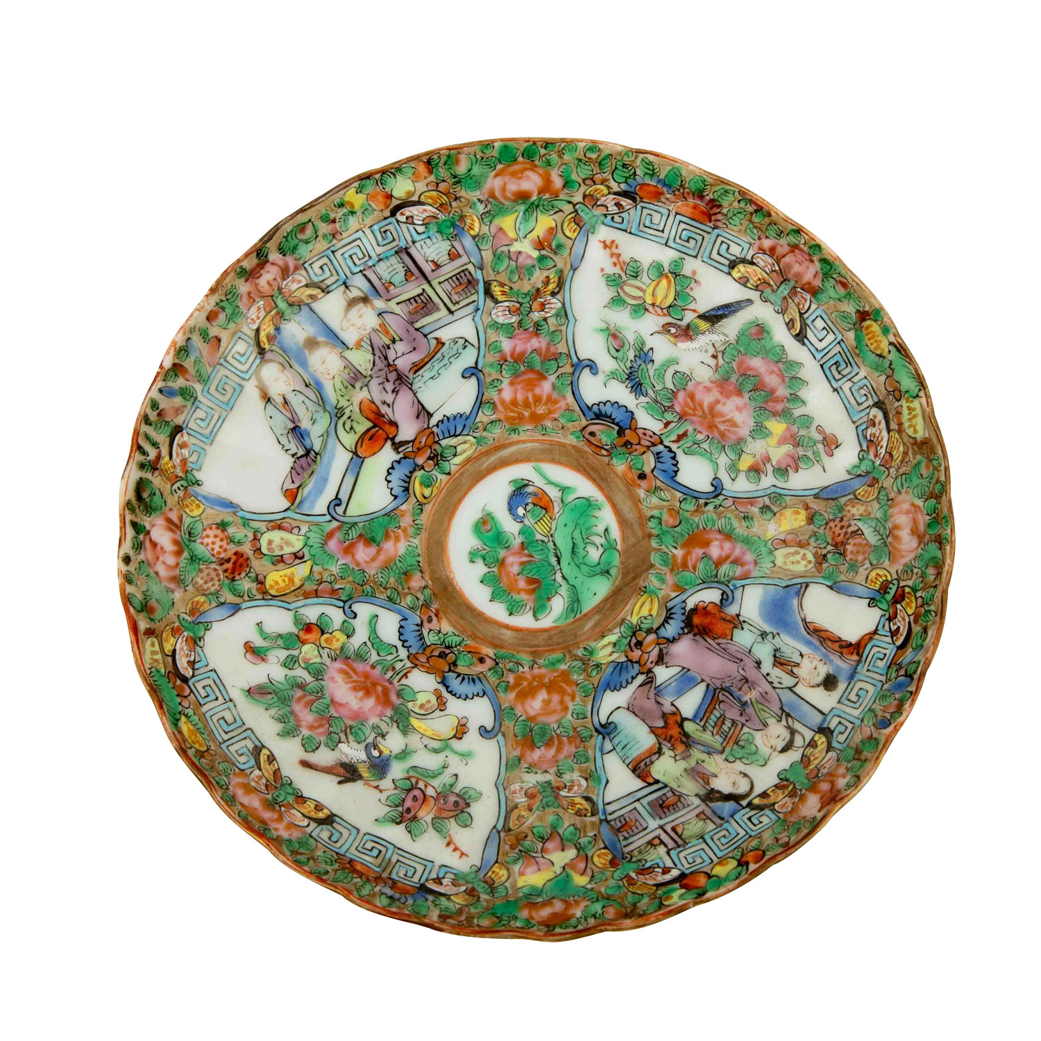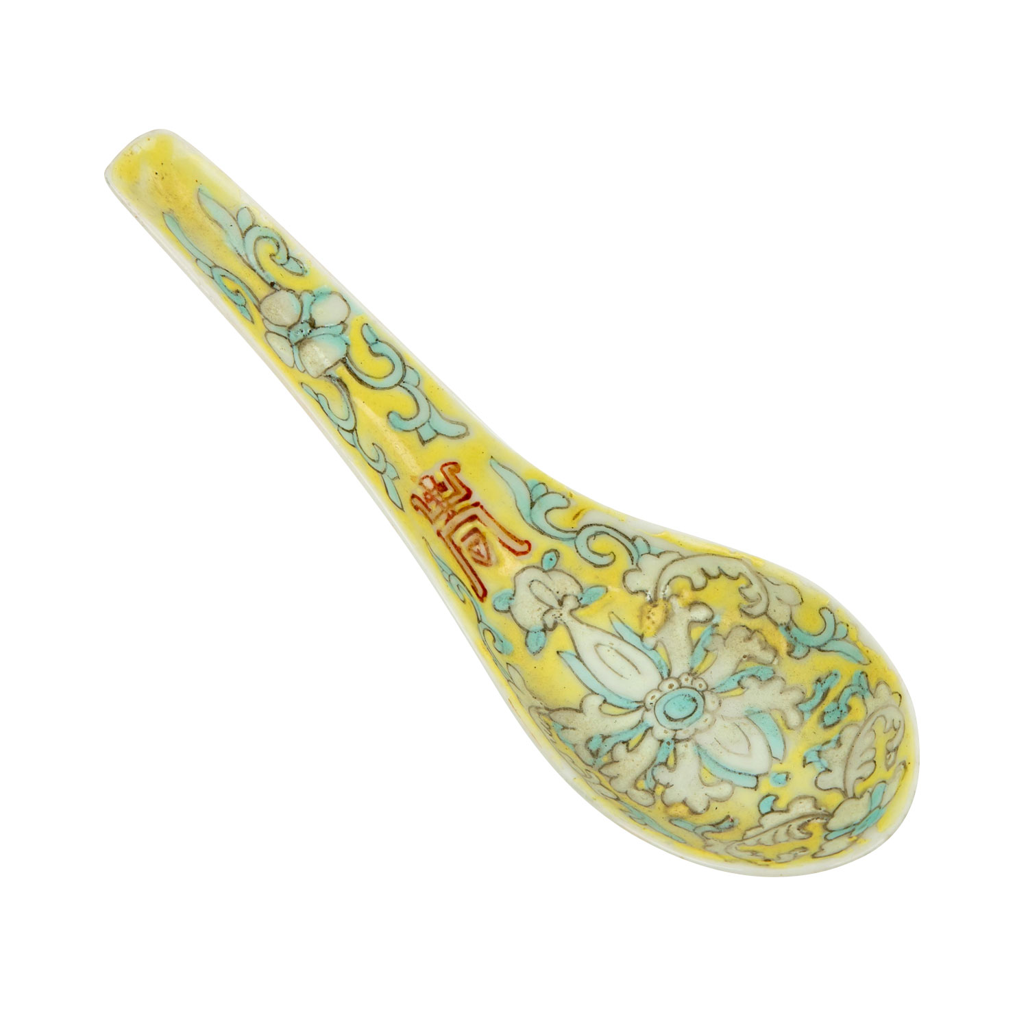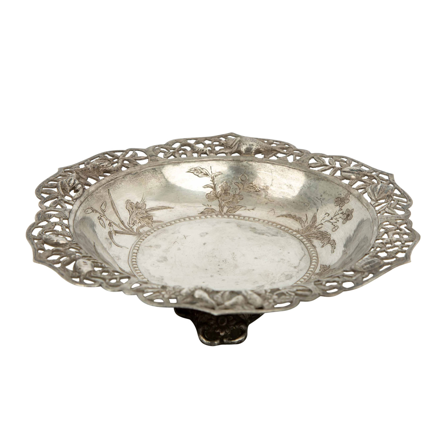1.) Schälchen aus Silber (112 g), D: ca. 15,5 cm. 2.) Schälchen aus Porzellan, D: 12 cm. 3.) Löffel aus Porzellan, L: ca. 14 cm. 4.) Famille rose-Teetasse mit UTasse. Alters- und Gebrauchsspuren, tlw. besch.