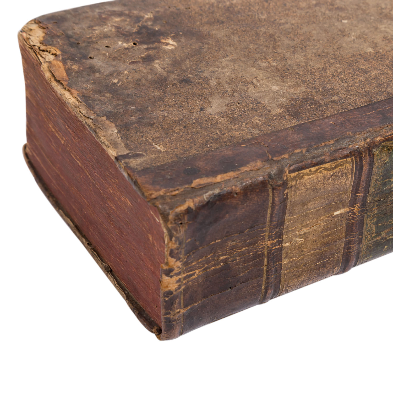 | Geographical Encyclopaedia, Ulm, end of 18th century - one book that is divided into 2 volumes: 'Geographical Statistical=Topographical Dictionary of Swabia', Ulm, 1st volume 1791/ 2nd volume 1792, initial letters A - K / initial letters L-Z. At the end of the book ' Additions, improvements and articles sent in later to the first part'. With signs of age and usage, wormholes, soiling, stains, abrasion, handwritten entries, creases, missing parts of the binding.